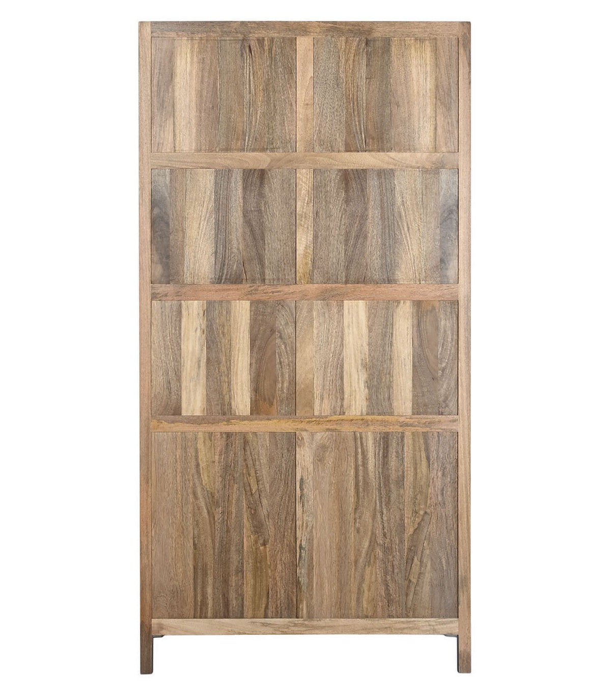 Sumérgete en el encanto del estilo boho con esta estantería alta elaborada en madera de mango. Su diseño combina líneas rectas y un aire natural que aporta calidez y personalidad a cualquier ambiente. Cuenta con cuatro baldas abiertas ideales para libros, objetos decorativos o vajilla, y dos cajones inferiores que ofrecen almacenamiento extra.