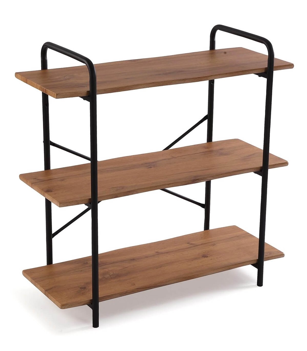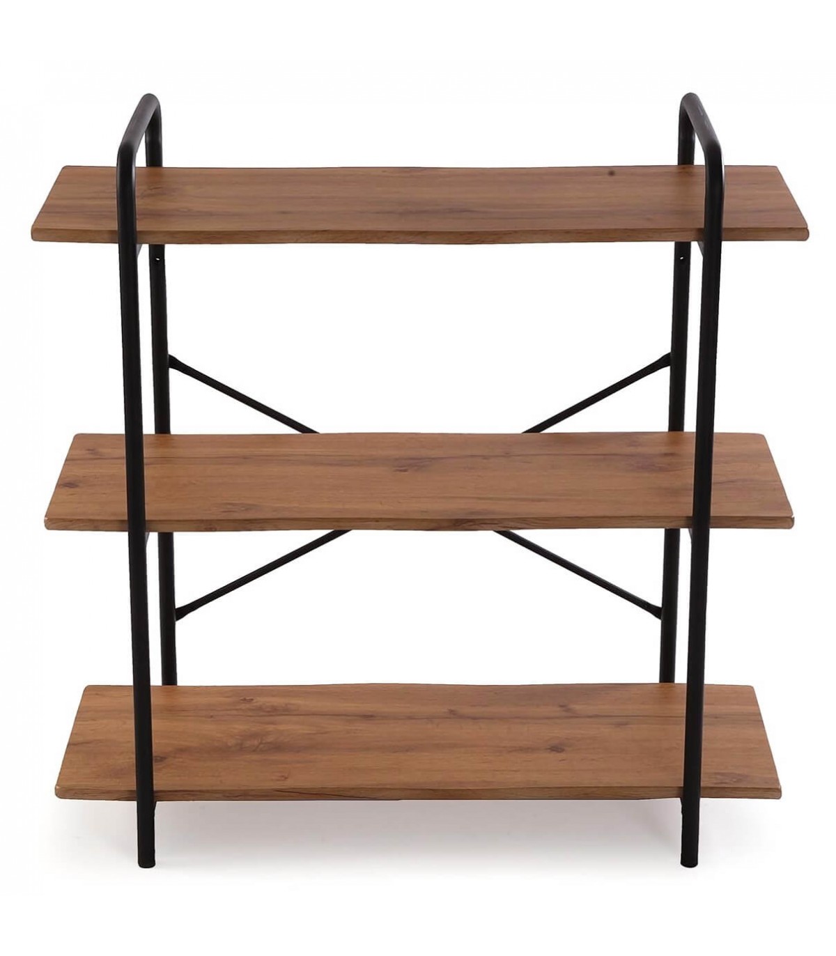 Librería estantería baja de estilo industrial, con 3 baldas estable y robusta, realizada en madera mdf imitación roble tostado y metal negro, ideal para una habitación, salón o despacho.