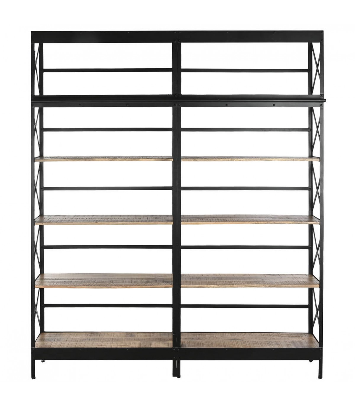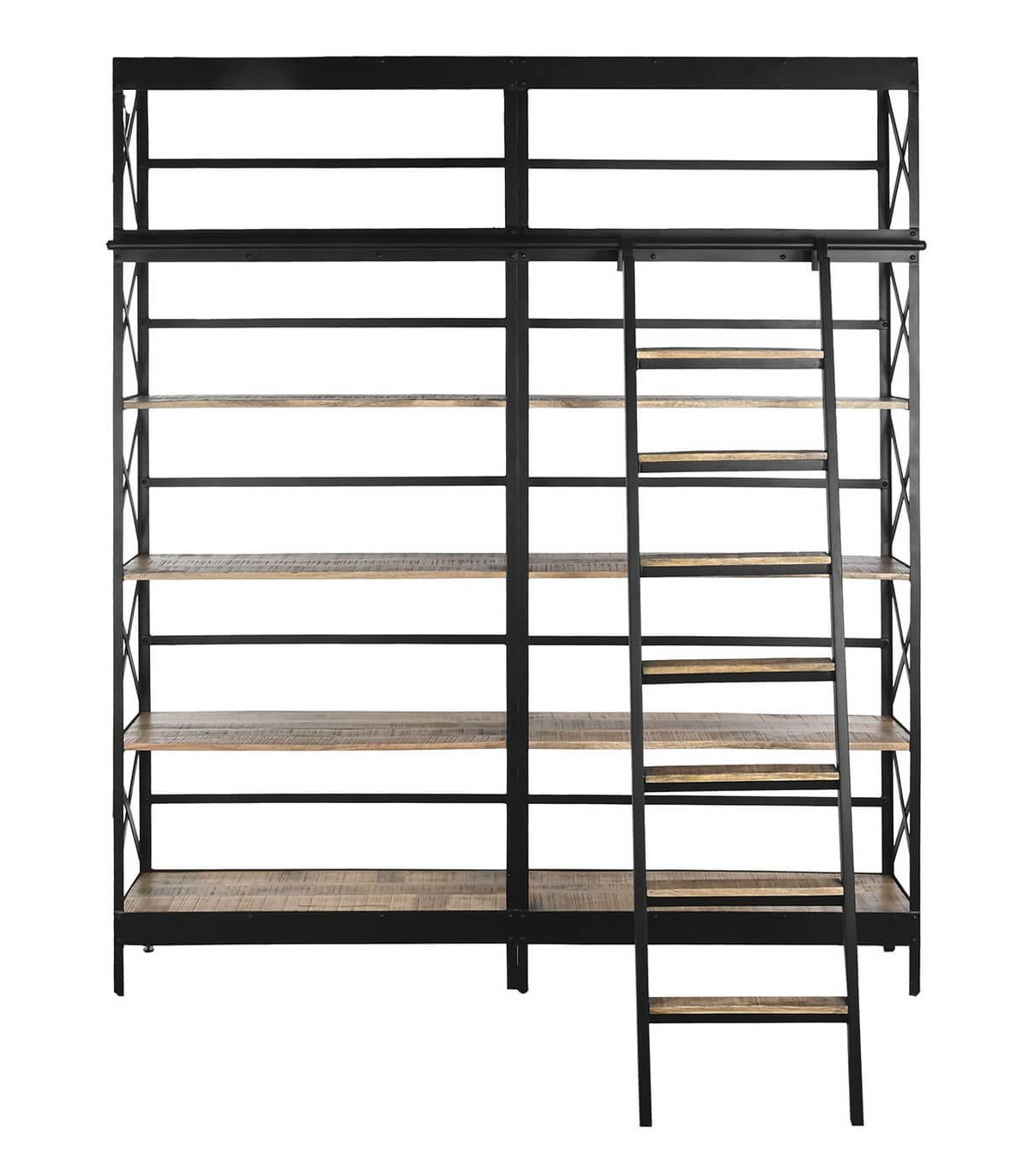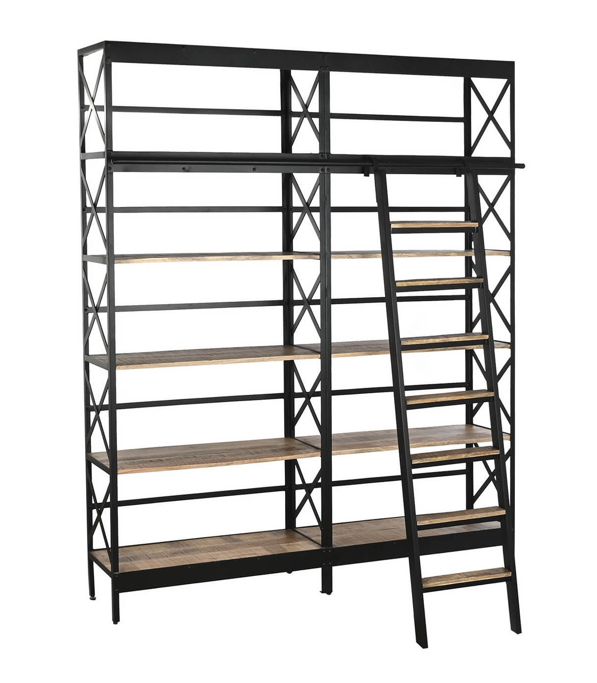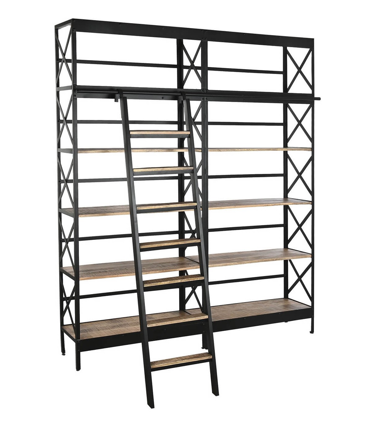 Bonita librería estilo industrial con escalera, realizada en metal negro y madera de mango acabado natural, una estantería grande muy útil, versátil y decorativa