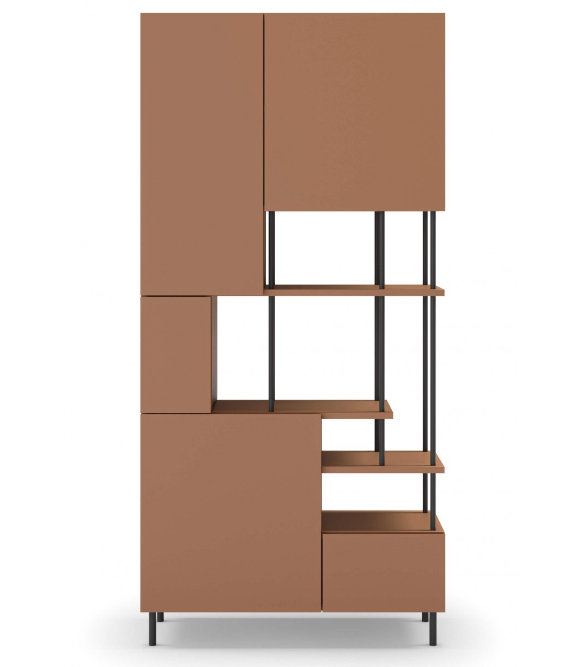 Librería estantería asimétrica con 5 puertas melamina exterior color terracota interior gris, metal negro de estilo moderno, estable y robusta, ideal para una habitación, salón o despacho.