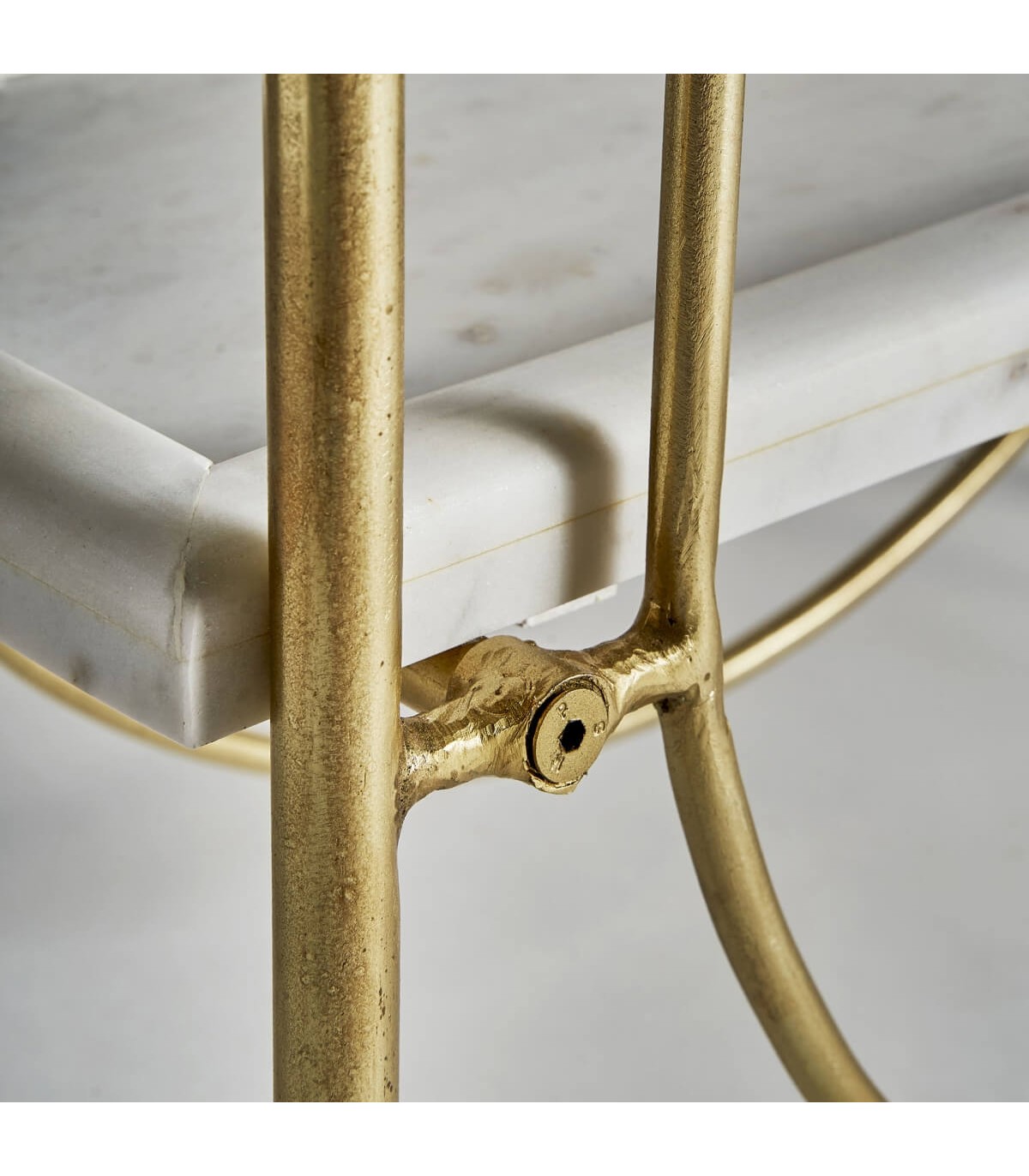 Acabado, hierro forjado acabado oro vintage, mármol blanco brillo con sus vetas. Fabricación artesanal. entendemos las variaciones de tonalidad, tamaño y forma o ciertas imperfecciones (grietas, nudos, marcas) como un valor añadido que la convierten en pieza única.