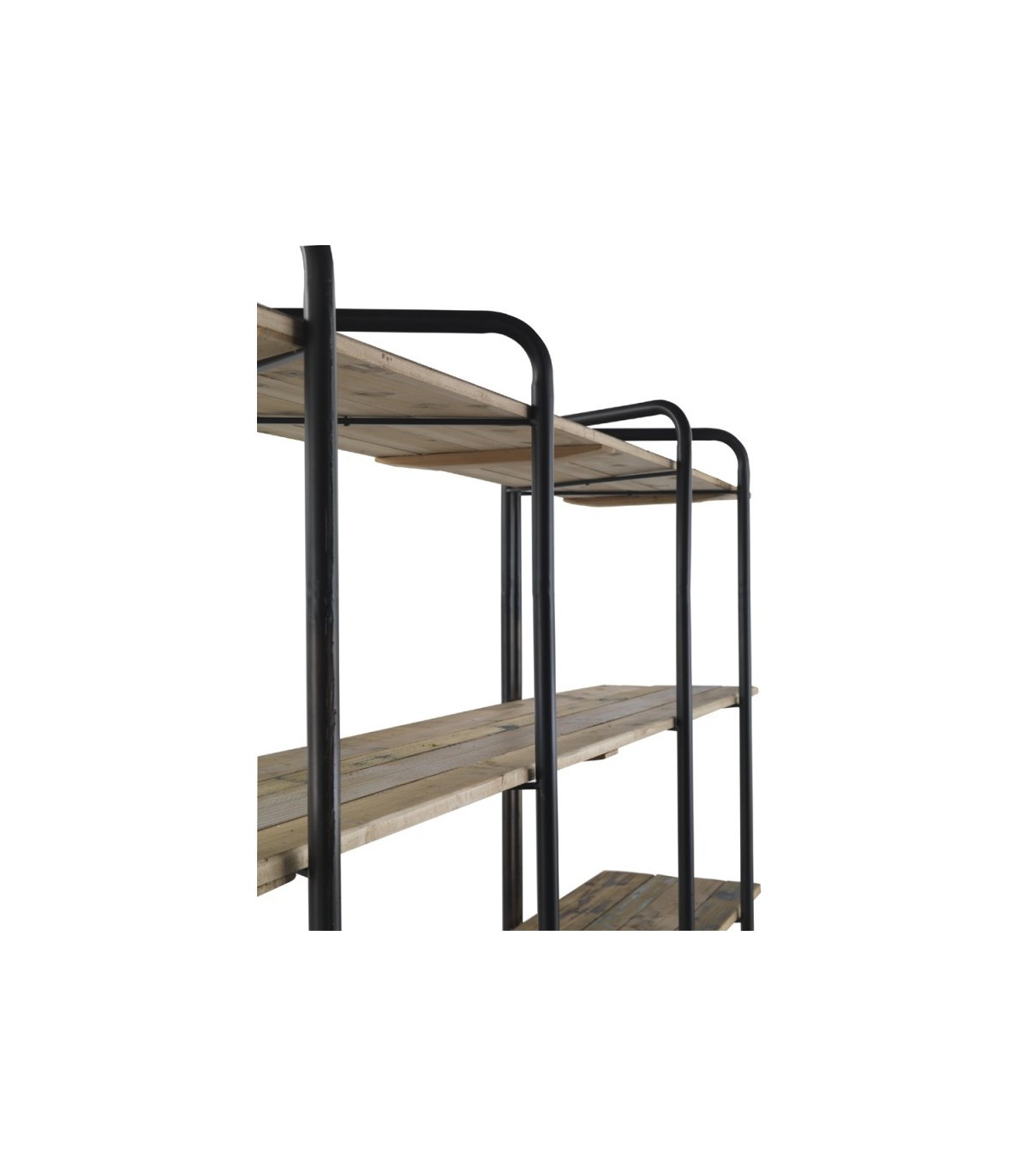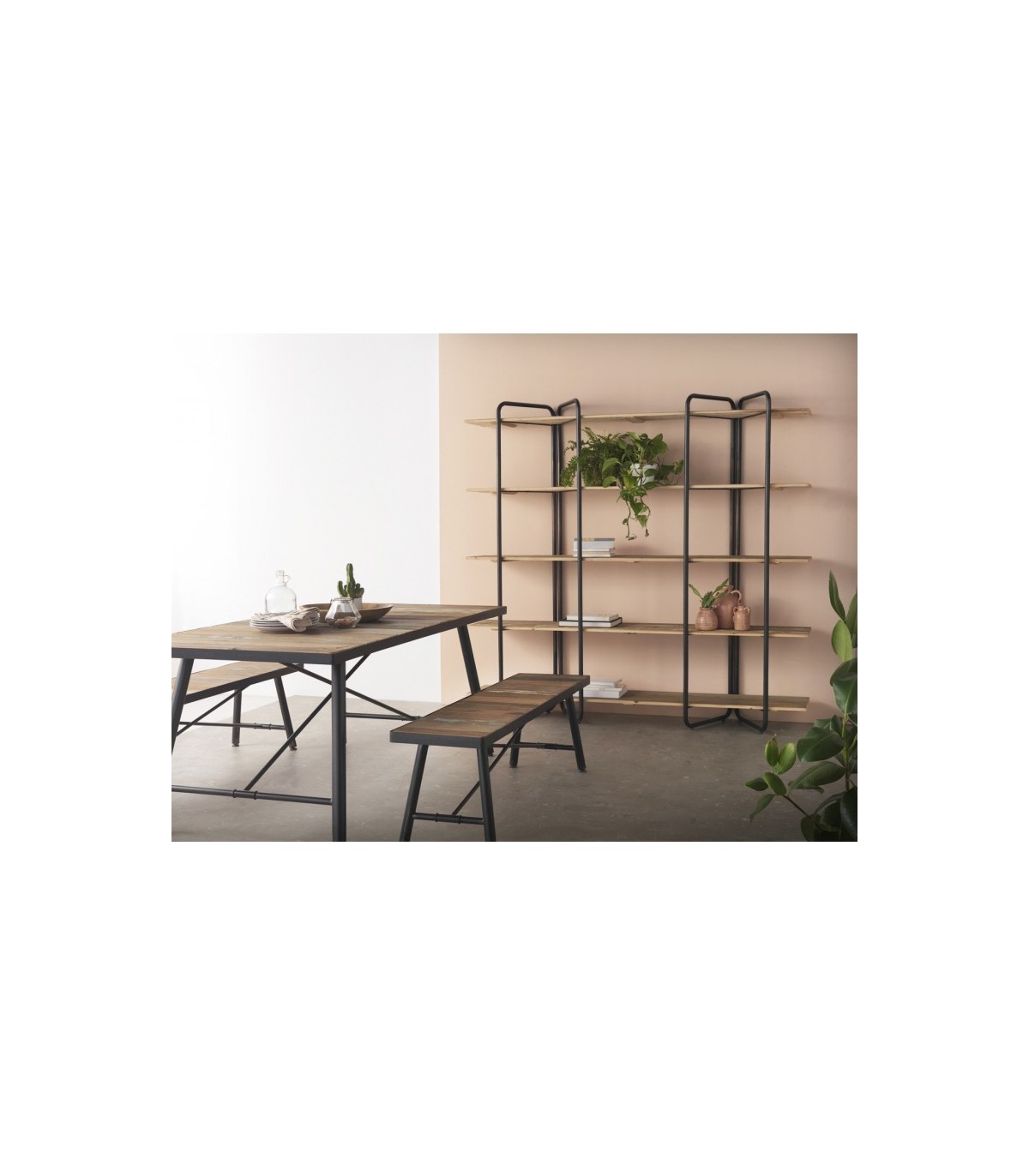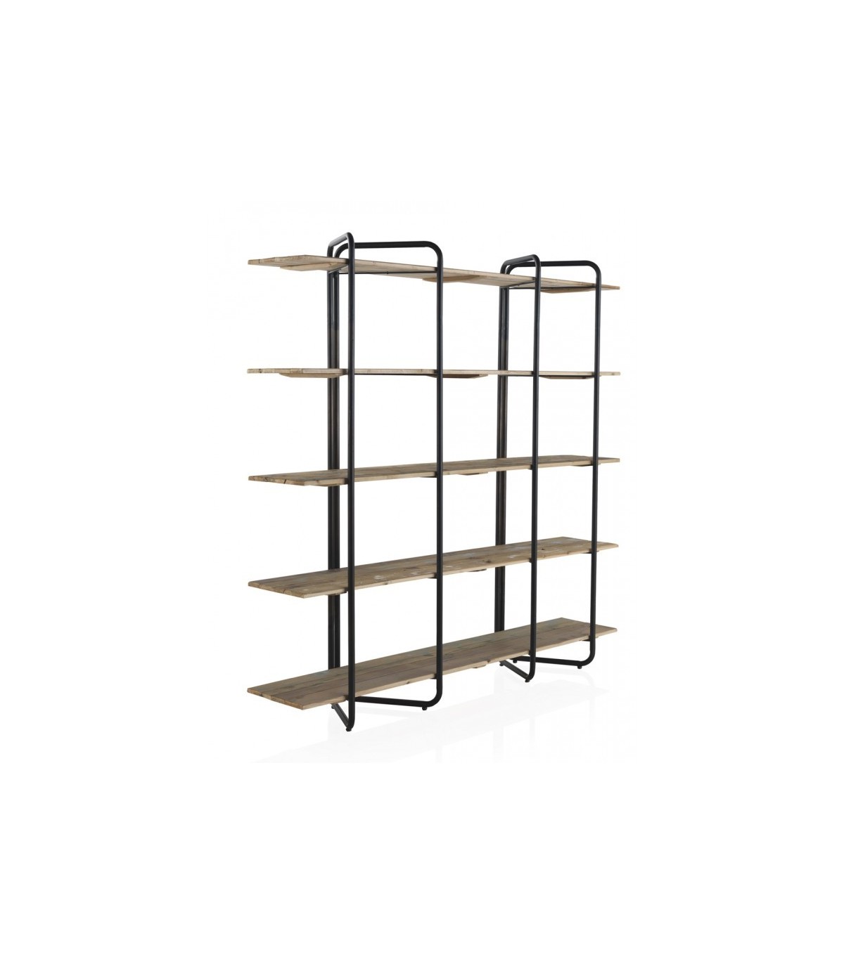 Estilo urbano y funcionalidad se dan la mano en esta estantería de gran formato con cinco amplias baldas. Su diseño estructurado en hierro negro y madera de abeto natural crea un contraste sobrio y moderno que encaja perfectamente en ambientes industriales, contemporáneos o minimalistas.