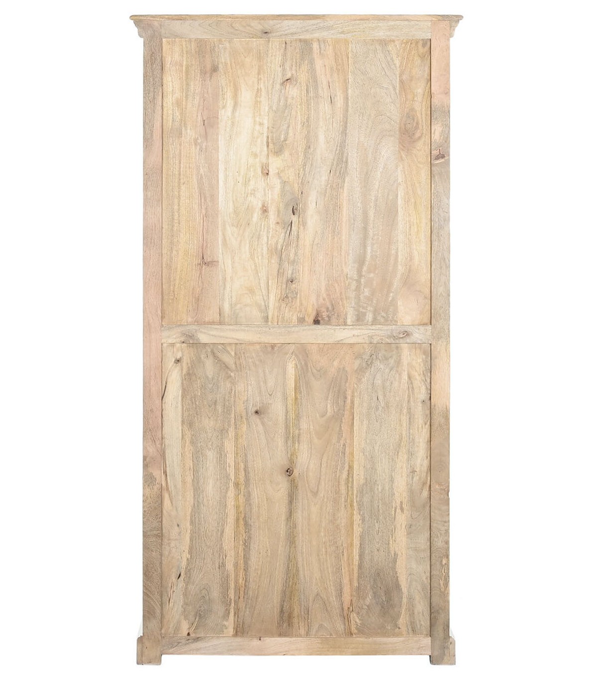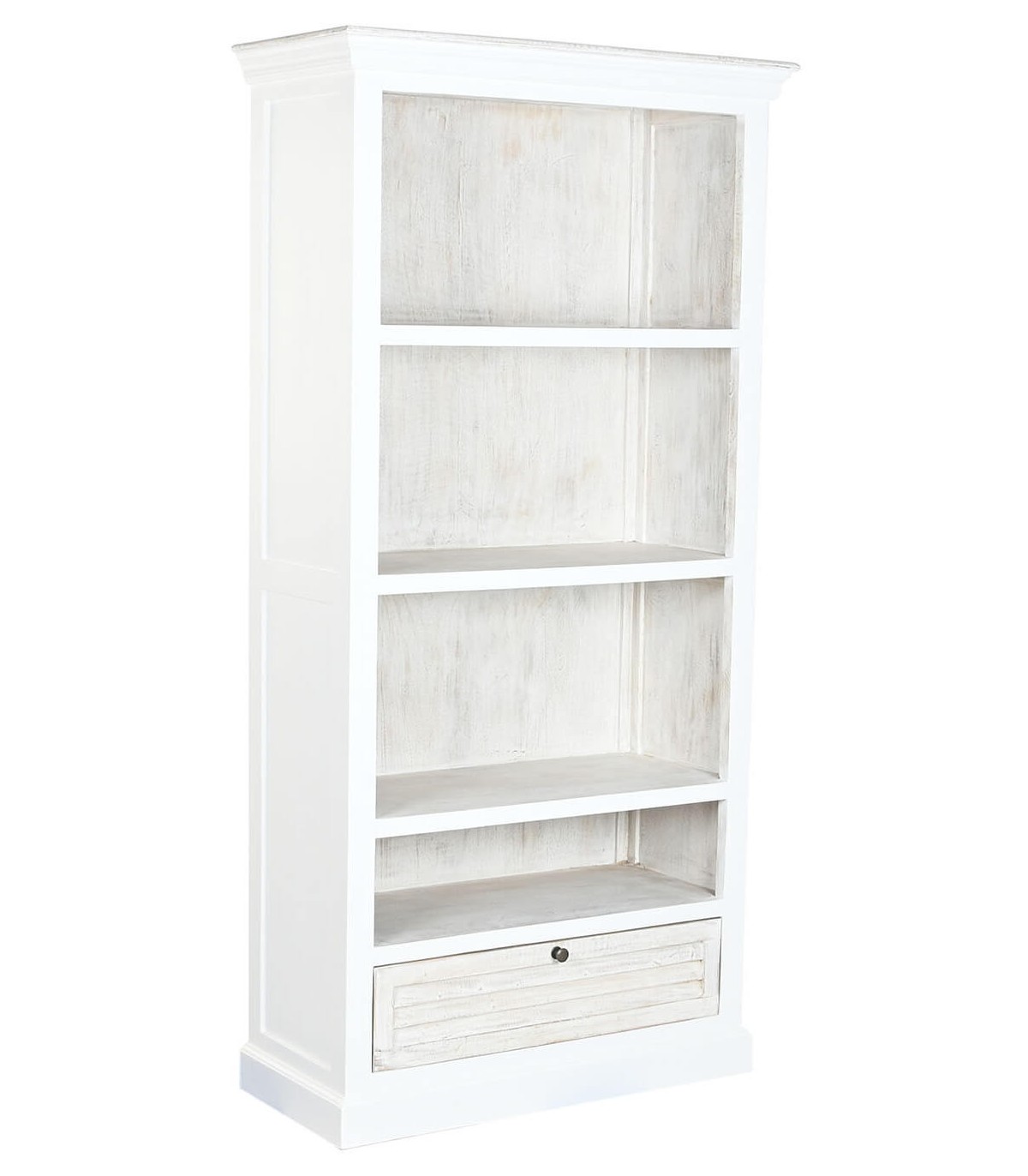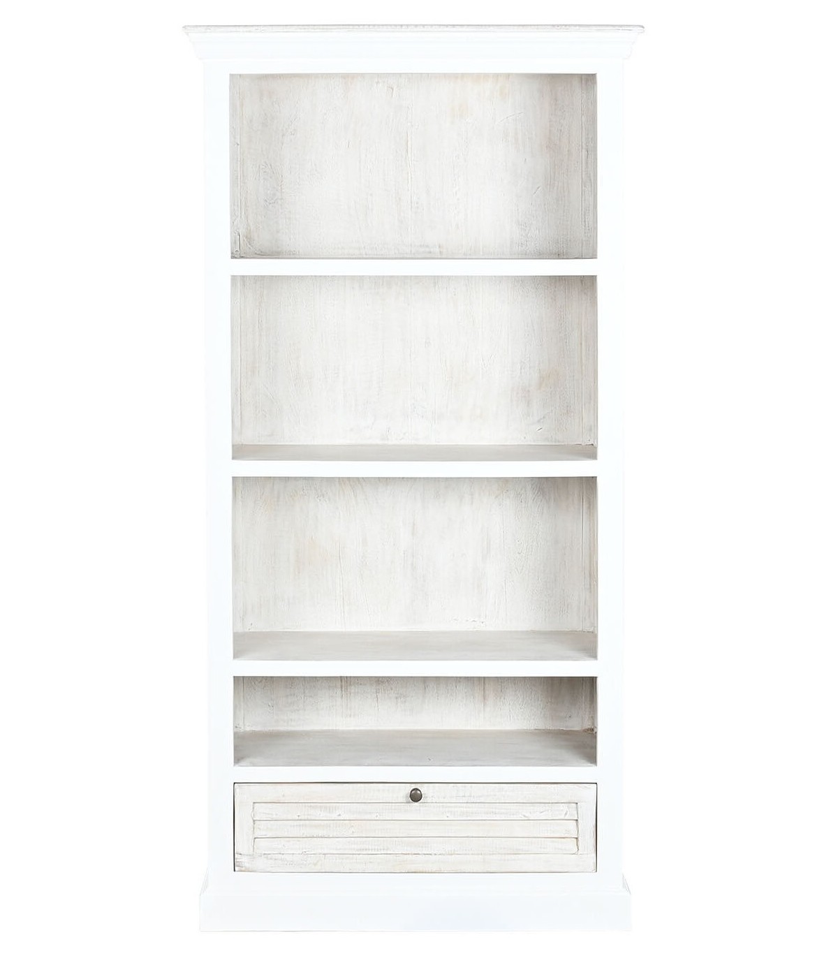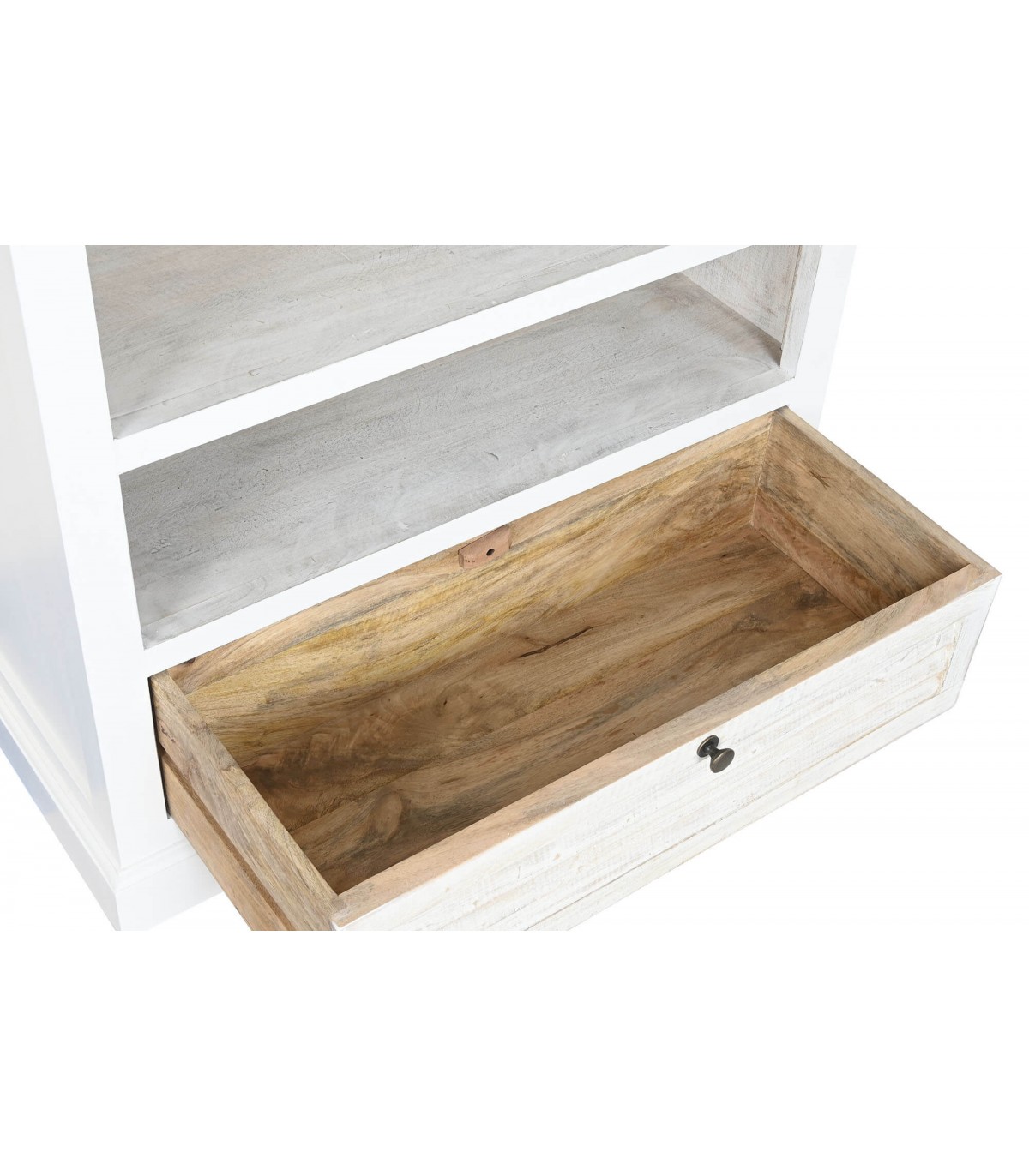 Diseñada para destacar con discreta elegancia, esta estantería de gran formato combina funcionalidad y estilo en una pieza de inspiración boho refinada. Con estructura de madera maciza de mango en tonos blanqueados y tres amplias baldas, es perfecta para exhibir libros, piezas decorativas o recuerdos especiales. Incluye un práctico cajón inferior con tirador metálico acabado en oro viejo, que aporta un toque vintage muy sutil.