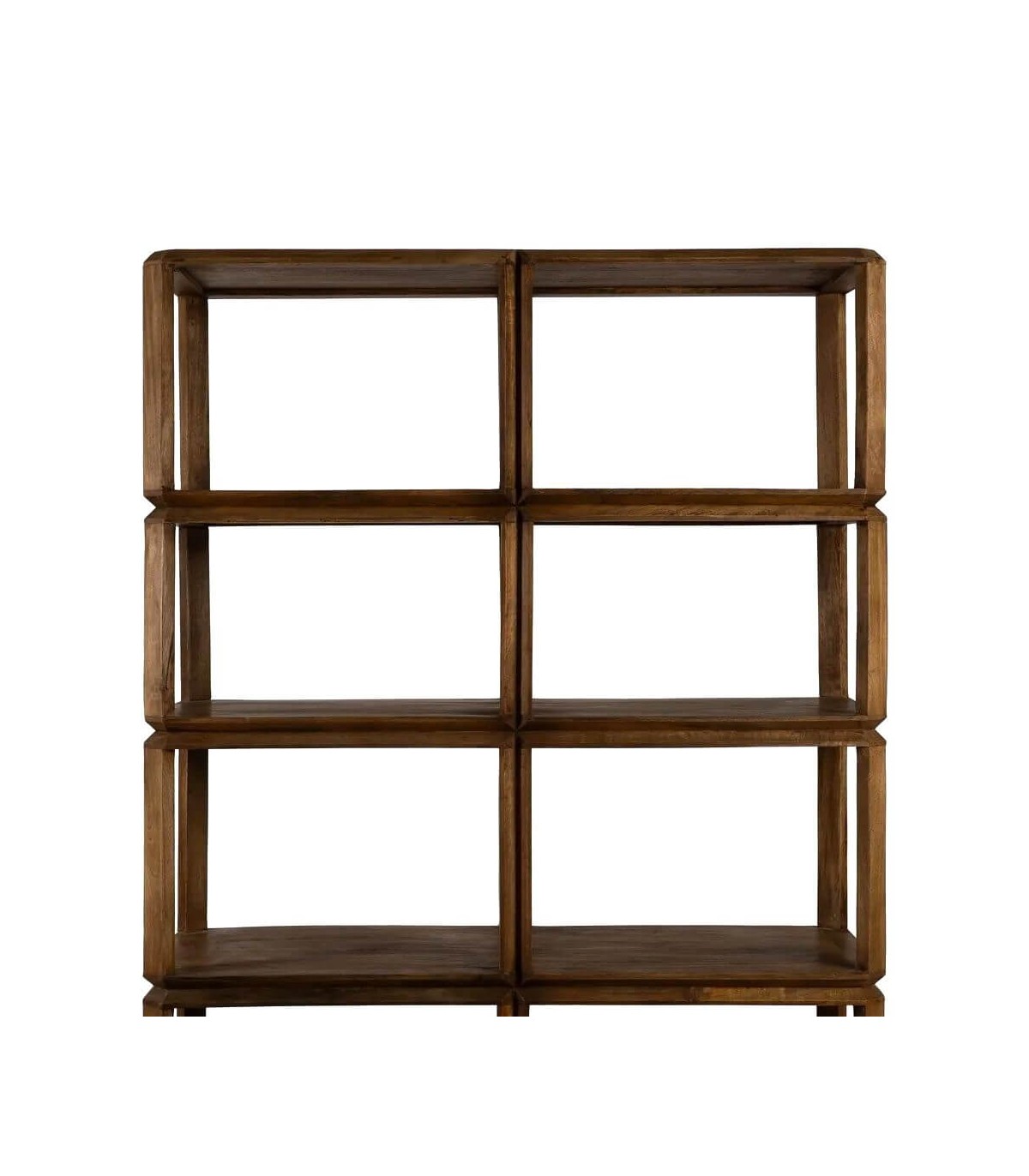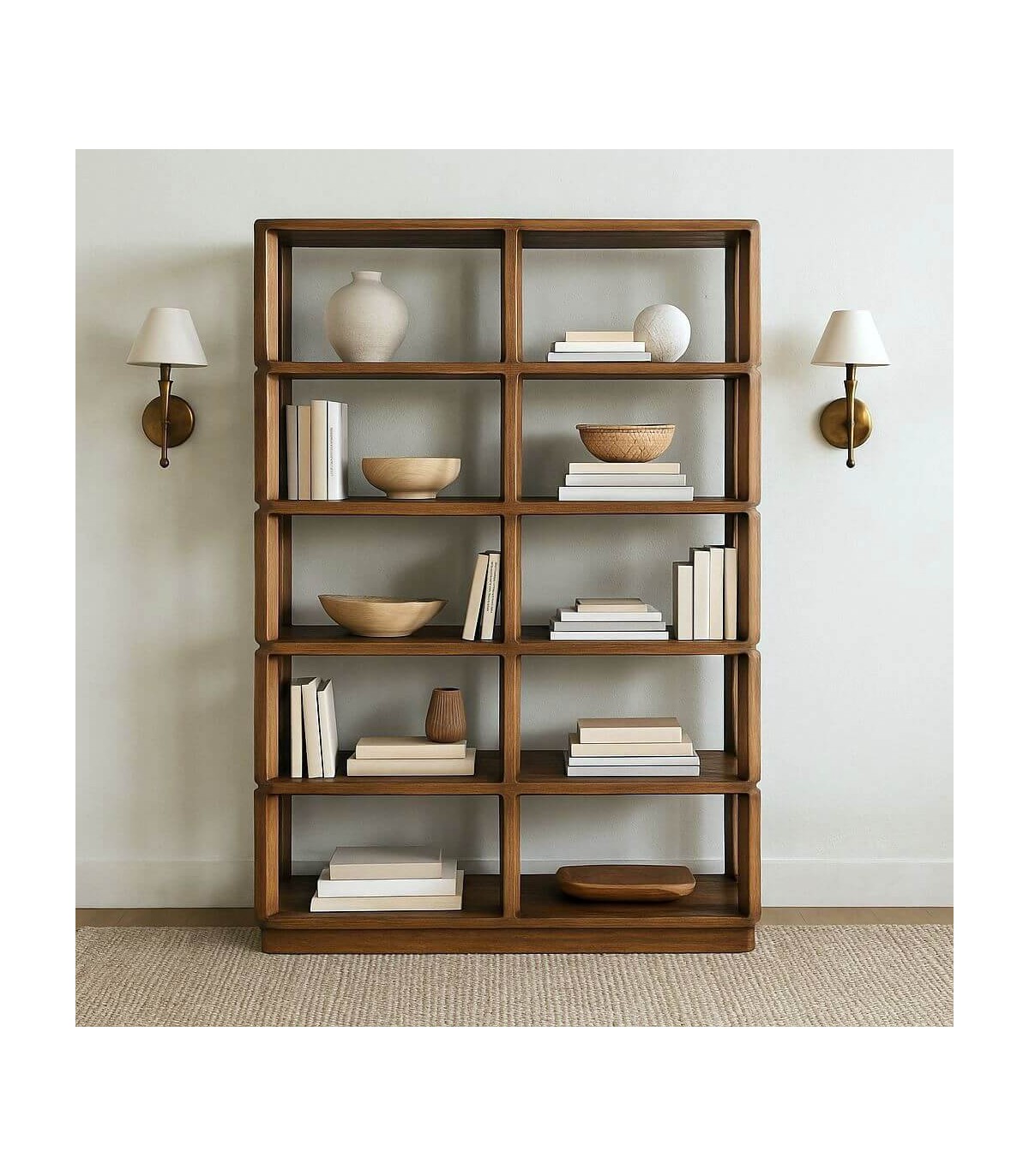 Esta estantería de gran formato combina estructura abierta y diseño simétrico con la calidez de la madera maciza en acabado nogal. Sus líneas sobrias y su volumen imponente la convierten en una pieza ideal para espacios amplios y luminosos.
