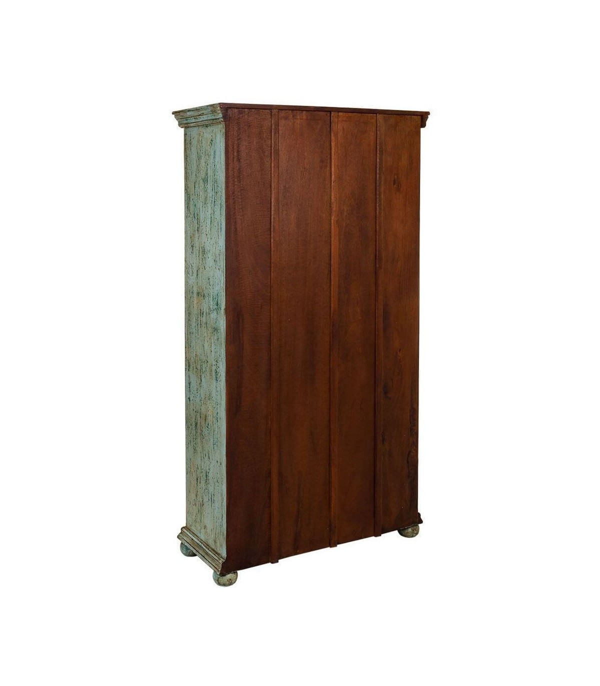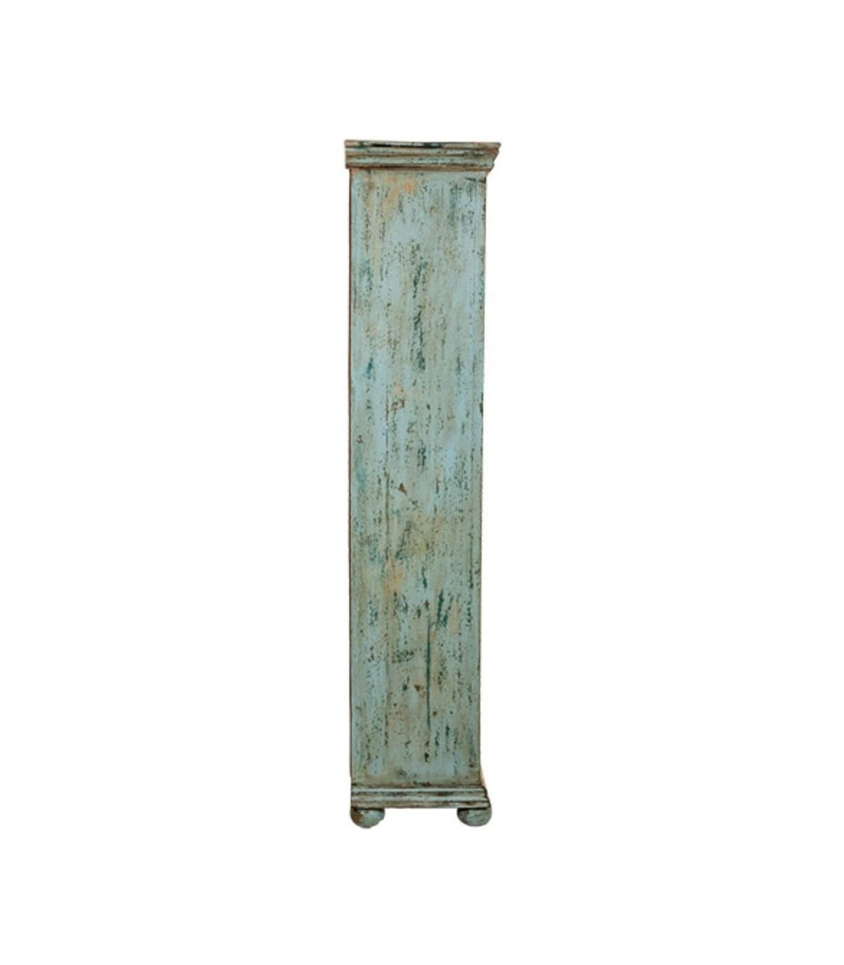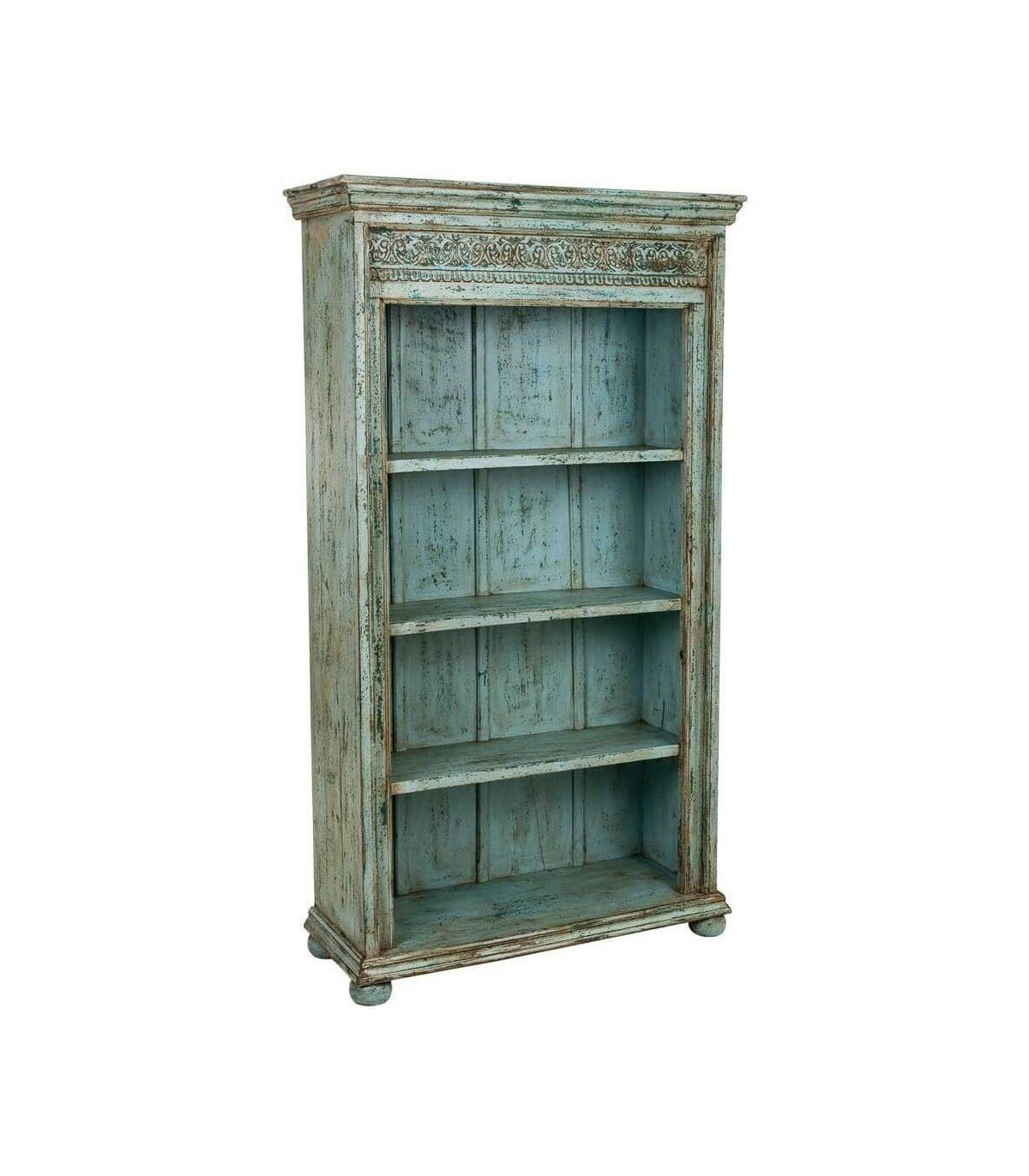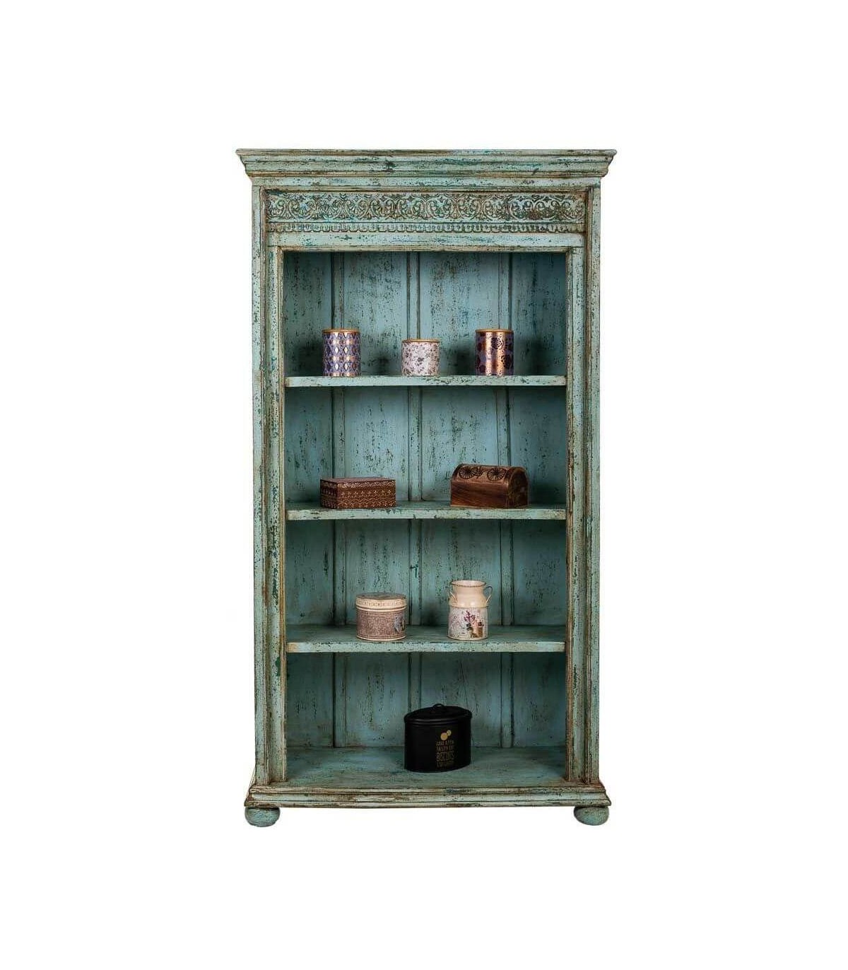 Esta estantería grande está pensada para quienes buscan funcionalidad con carácter. Su estructura maciza de mango y el acabado envejecido en turquesa decapado aportan calidez, color y un punto de exotismo. Los detalles tallados a mano en la parte superior la convierten en una pieza decorativa, ideal para salones, despachos o comedores con estilo personal. Sus estantes amplios permiten organizar libros, objetos o vajilla con un equilibrio perfecto entre orden y estética. Una pieza con alma que viste el espacio con autenticidad, historia y presencia.