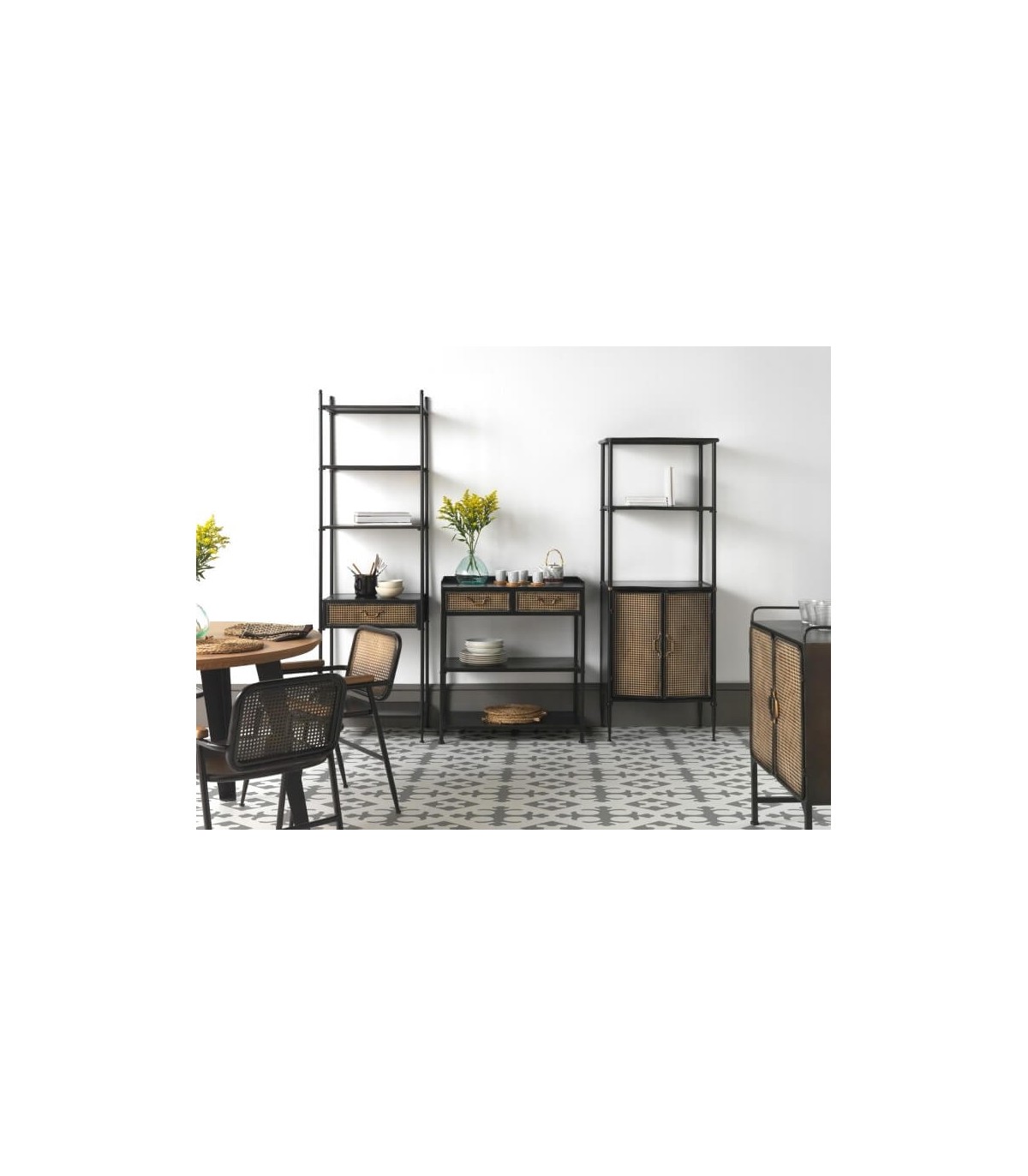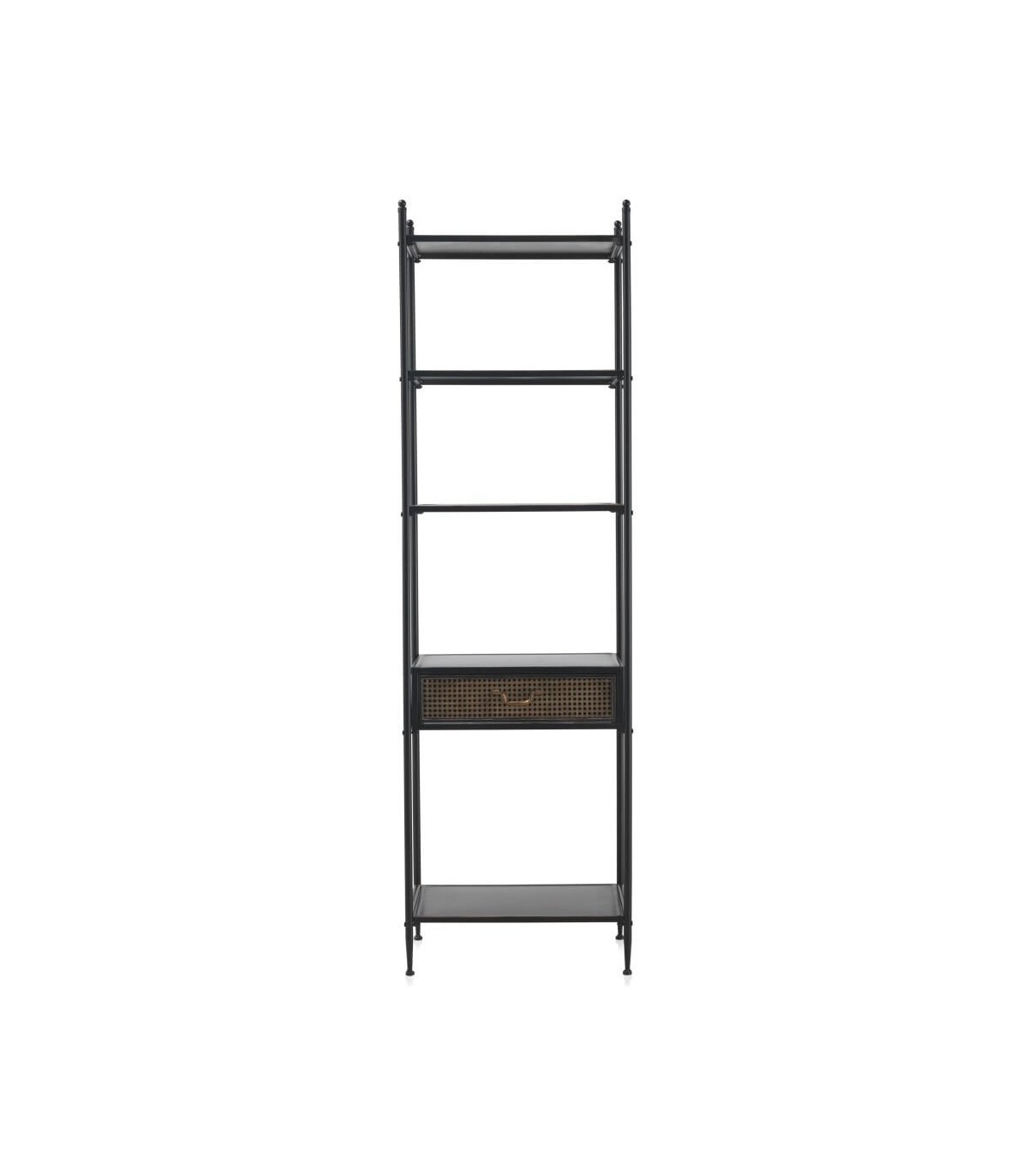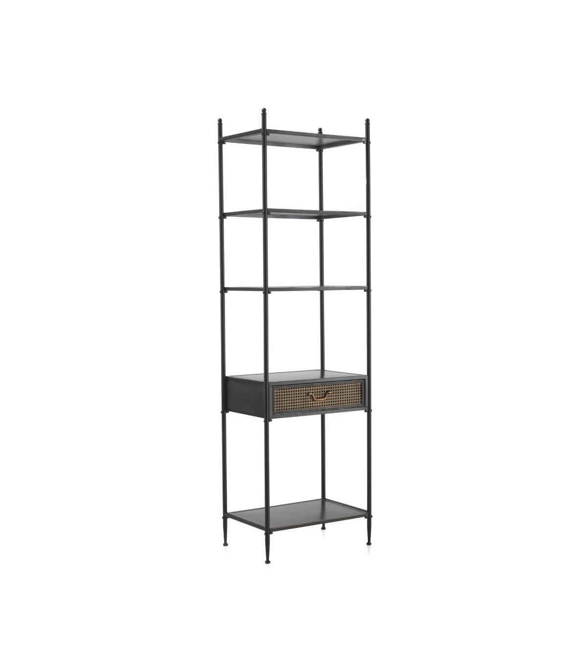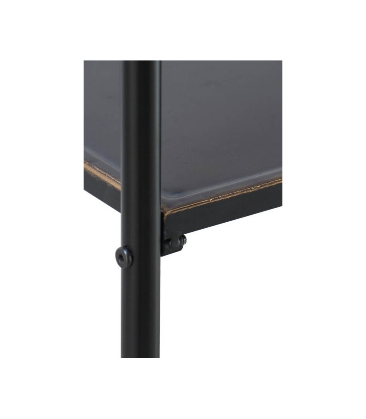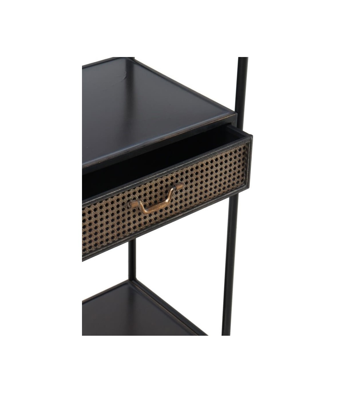 Estantería pequeña de estilo industrial con 1 cajón, realizada en metal negro con detalles en dorado, una estantería muy prática y ligera visualmente al no tener costados, una estantería con carácter.