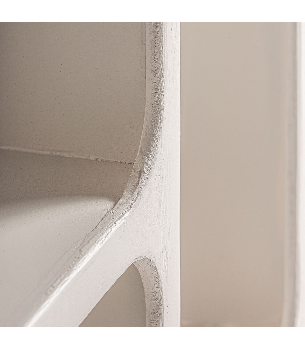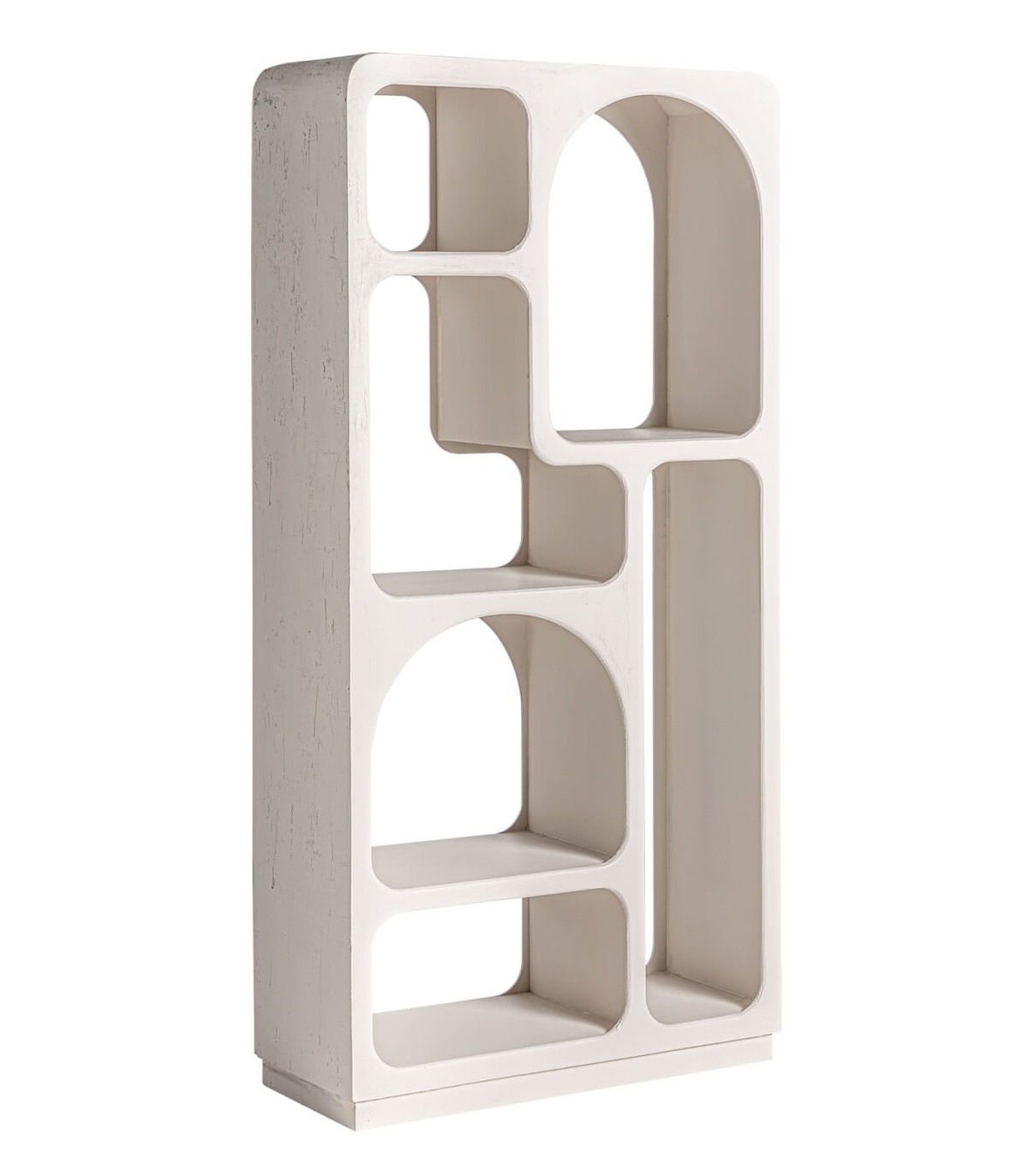Librería estantería con los huecos irregulares, realizada en madera de mango pintada en blanco efecto yeso, un mueble de estilo ibicenco que le dará frescura y luminosidad a tu decoración con sus formas redondeadas.