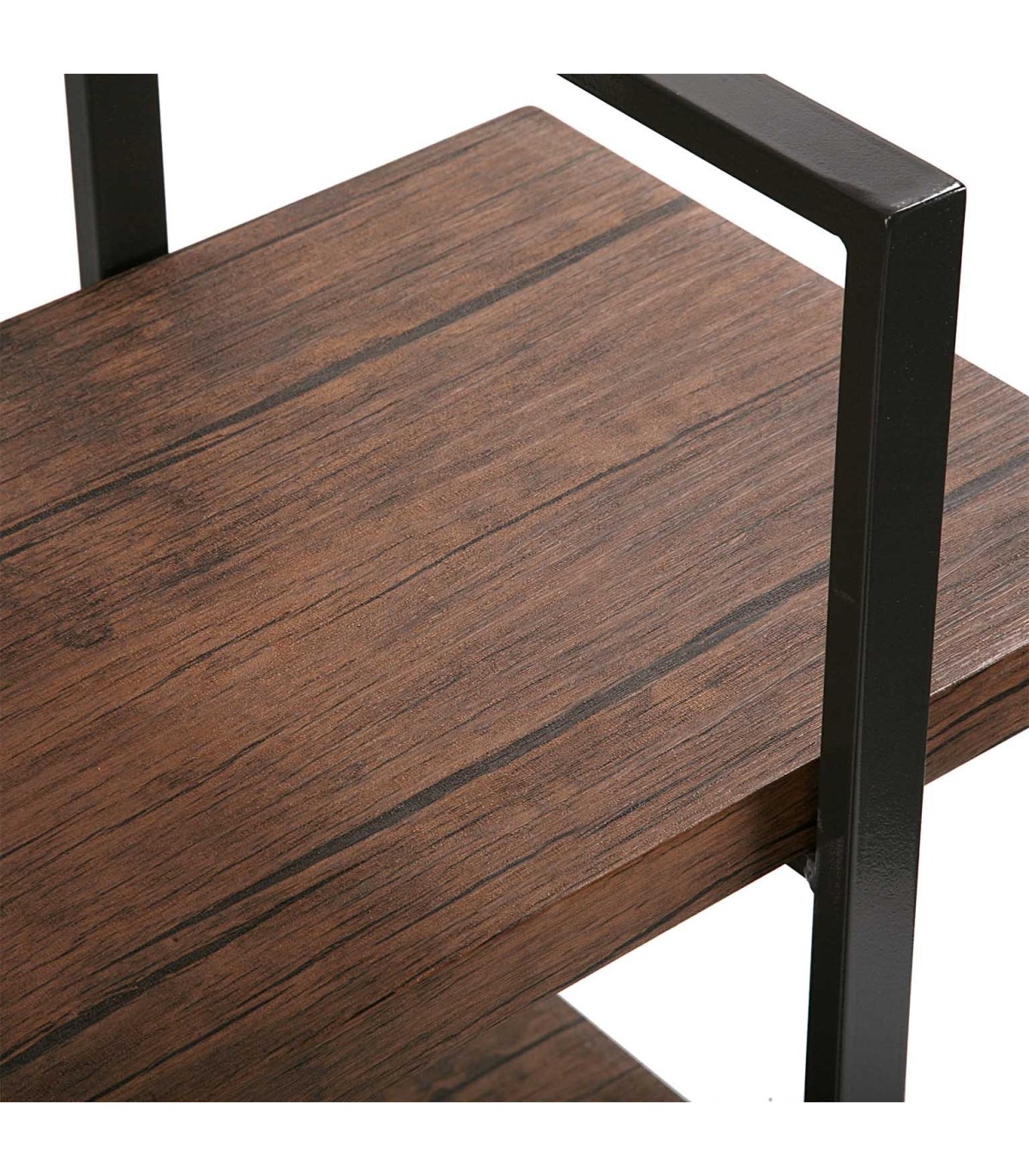 Librería estantería de estilo industrial, con tres baldas estable y robusta, realizada en madera mdf imitación nogal y metal negro, ideal para una habitación salón o despacho.