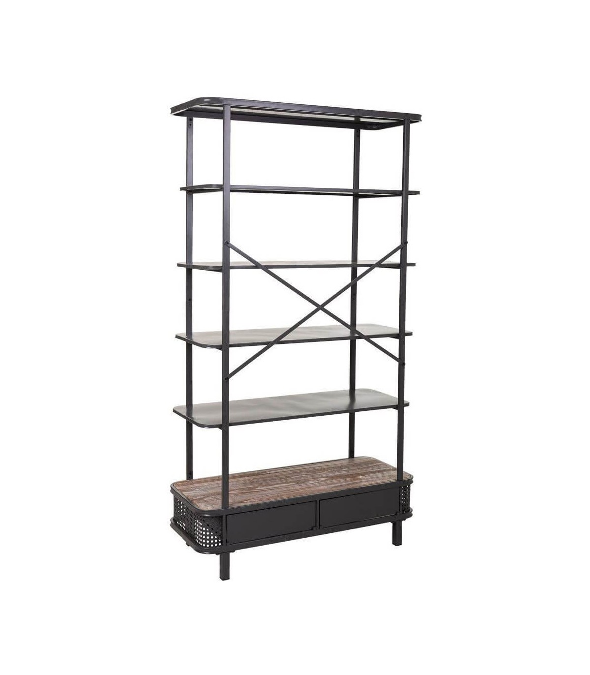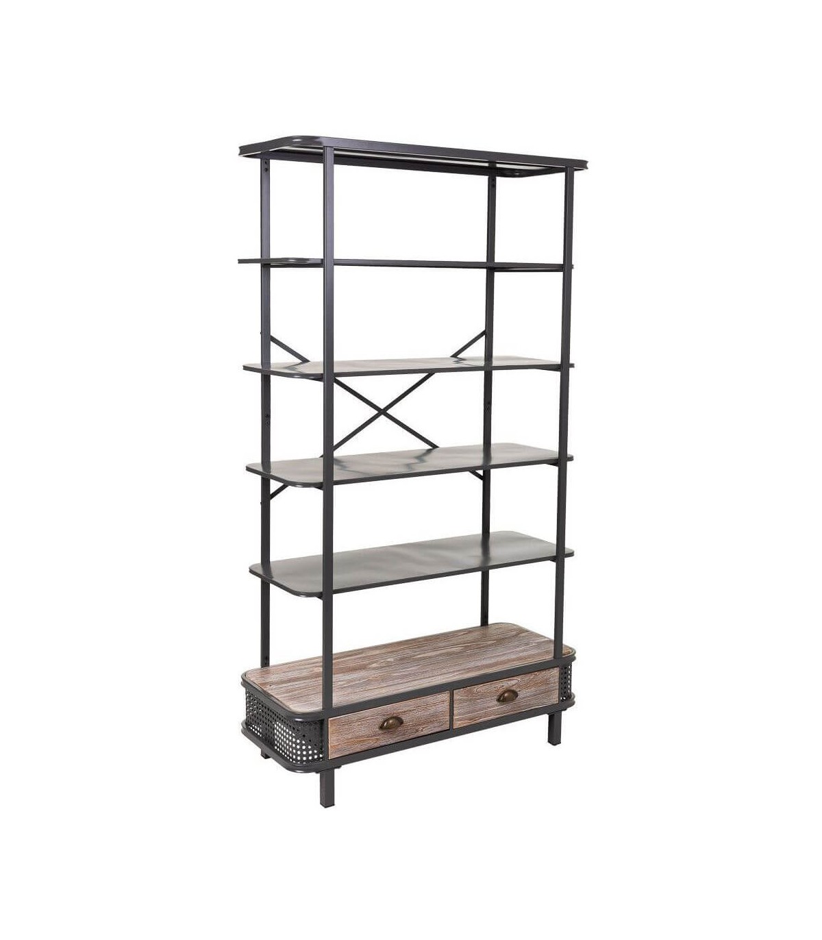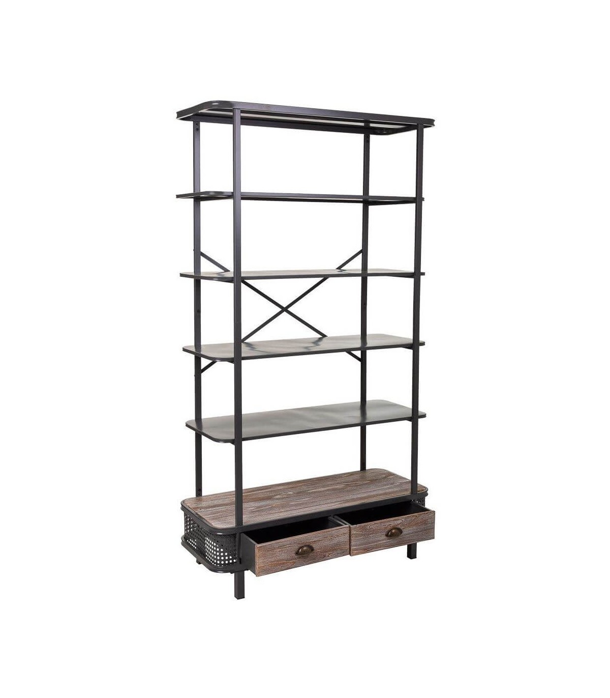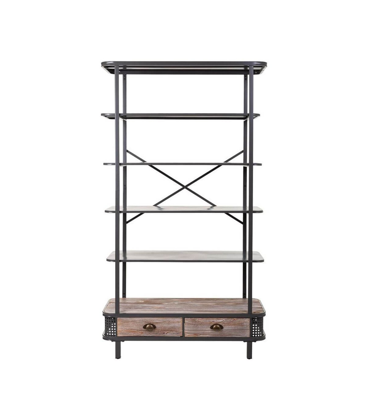 • Librería de estilo industrial, con 2 cajones, realizada en metal de color gris oscuro y con detalles en madera que le aporta calidez, perfecta para salones o despachos.