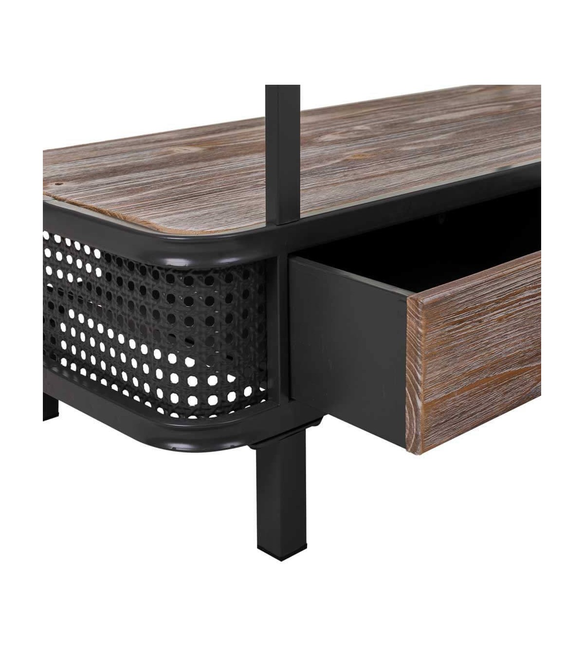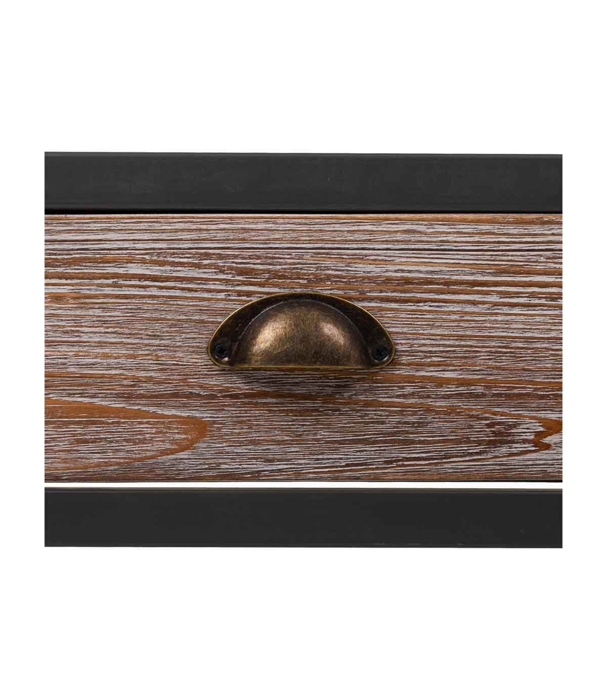 • Acabado, estructura metal gris oscuro, frente de cajones y tapa inferior en madera natural patinada.
