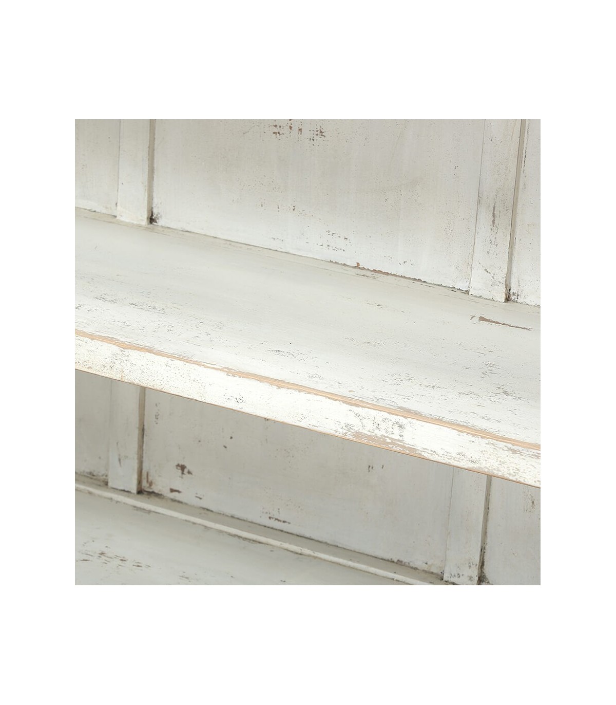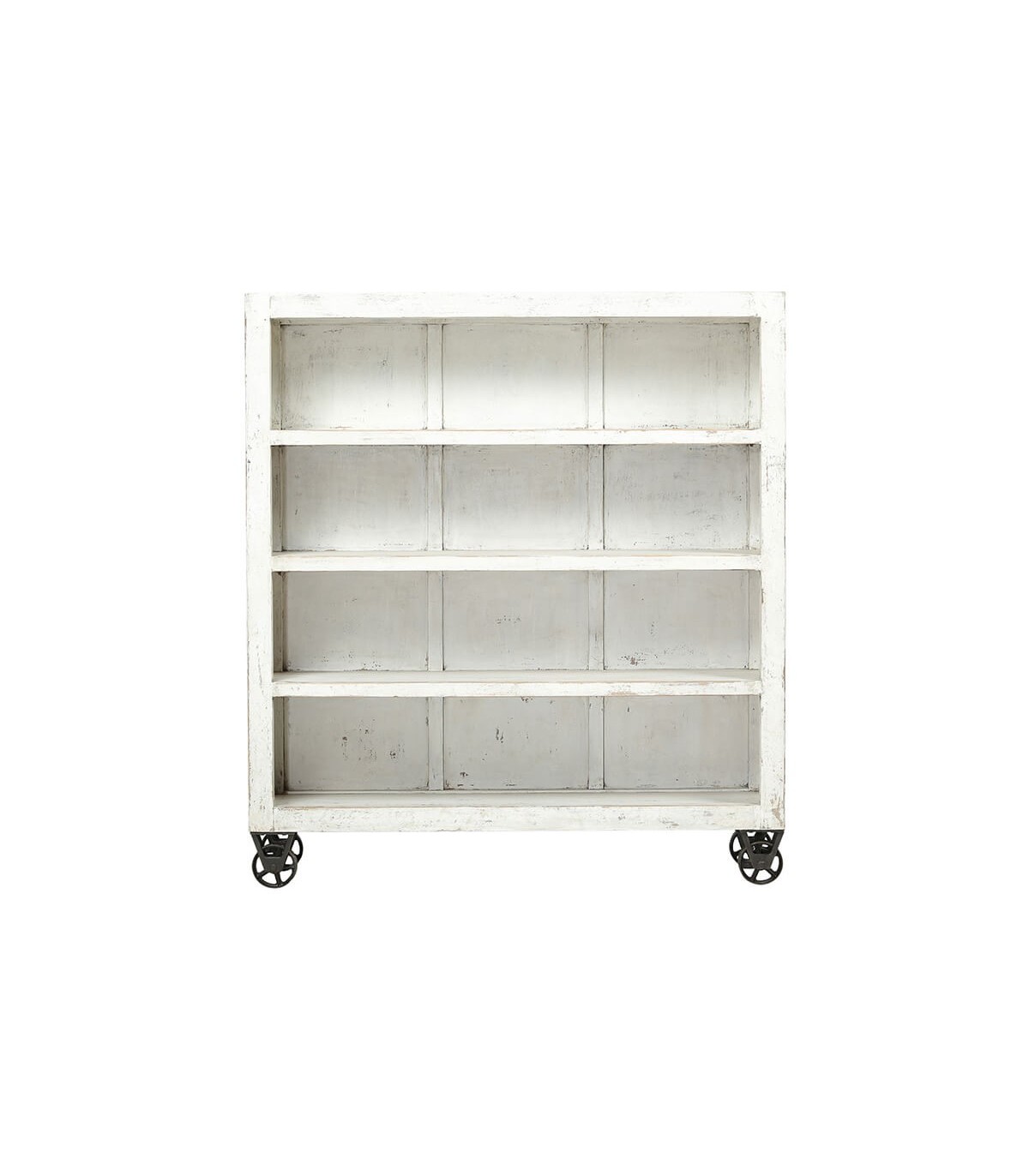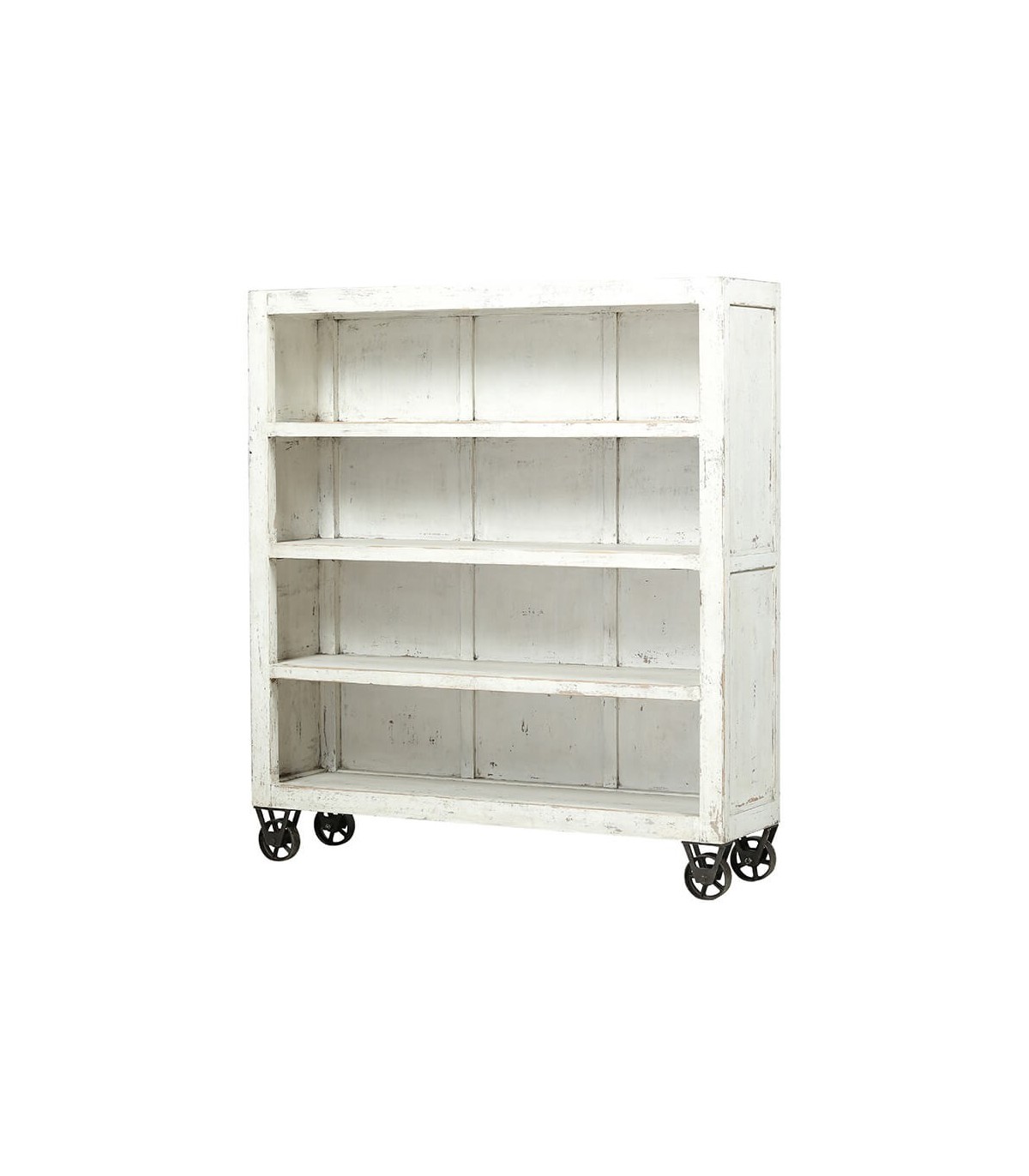 Librería de grandes dimensiones, realizada en madera de pino macizo acabada en blanco rozado, con ruedas unidirecionales en hierro forjado color negro, un mueble que encaja perfectamente en decoraciones coloniales o industriales.