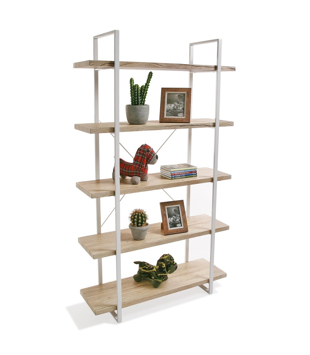 Librería estantería de estilo industrial, estable y robusta, realizada en madera mdf imitación roble natural y metal blanco, ideal para una habitación salón o despacho.