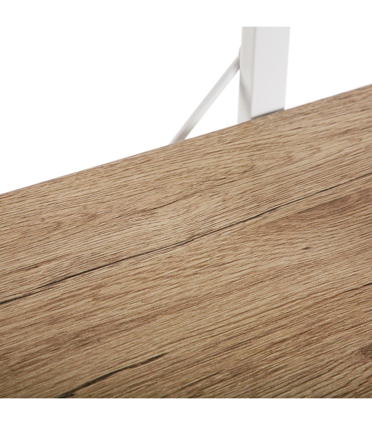 Acabado, madera color roble natural, tubo de hierro blanco.