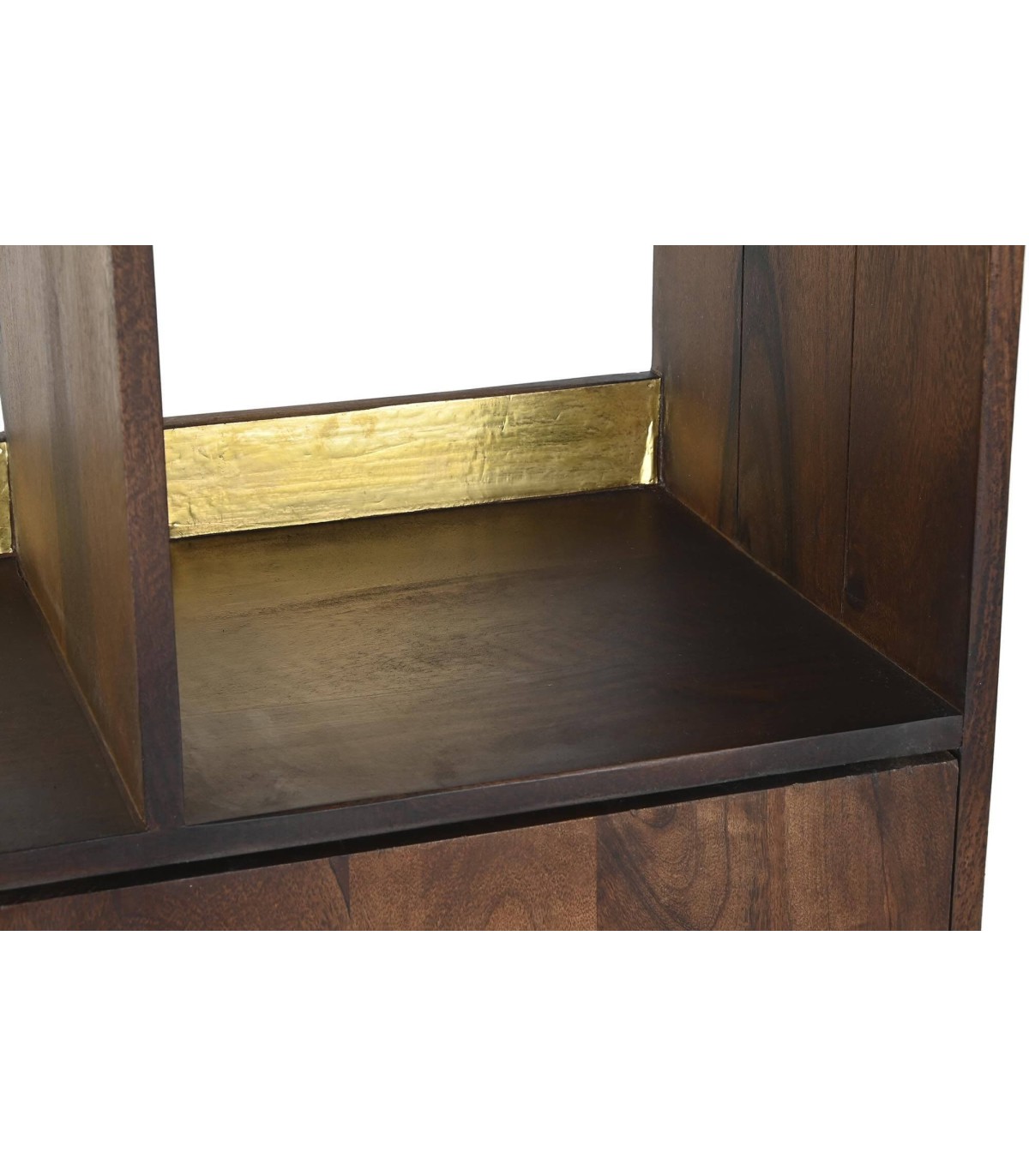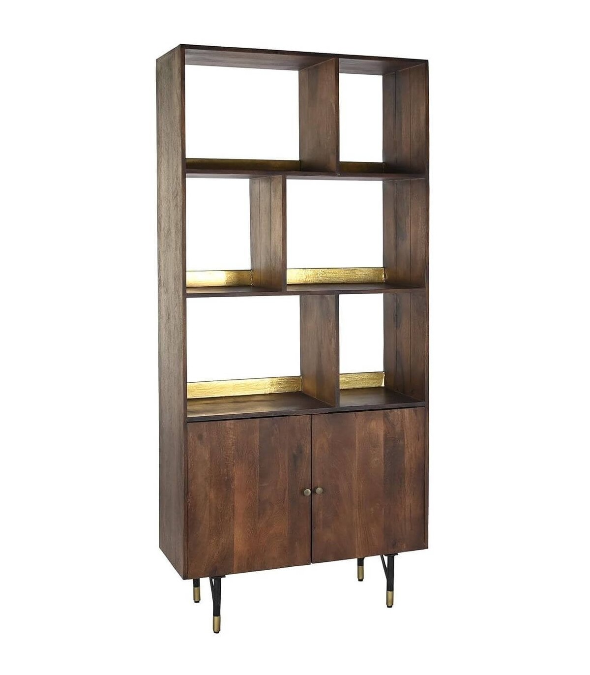Librería en madera maciza de mango en dos tonos, nogal y oro, de estilo contemporáneo, un mueble muy estilizado, decorativo y de gran capacidad, perfecto para esa nota elegante y cálida que aporta el color nogal, un mueble perfecto para un gran salón.