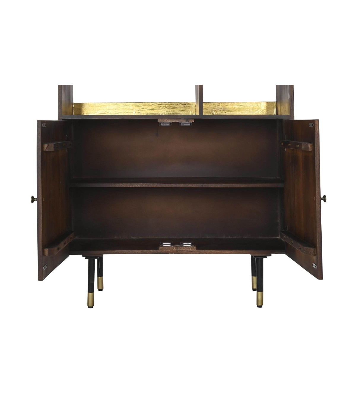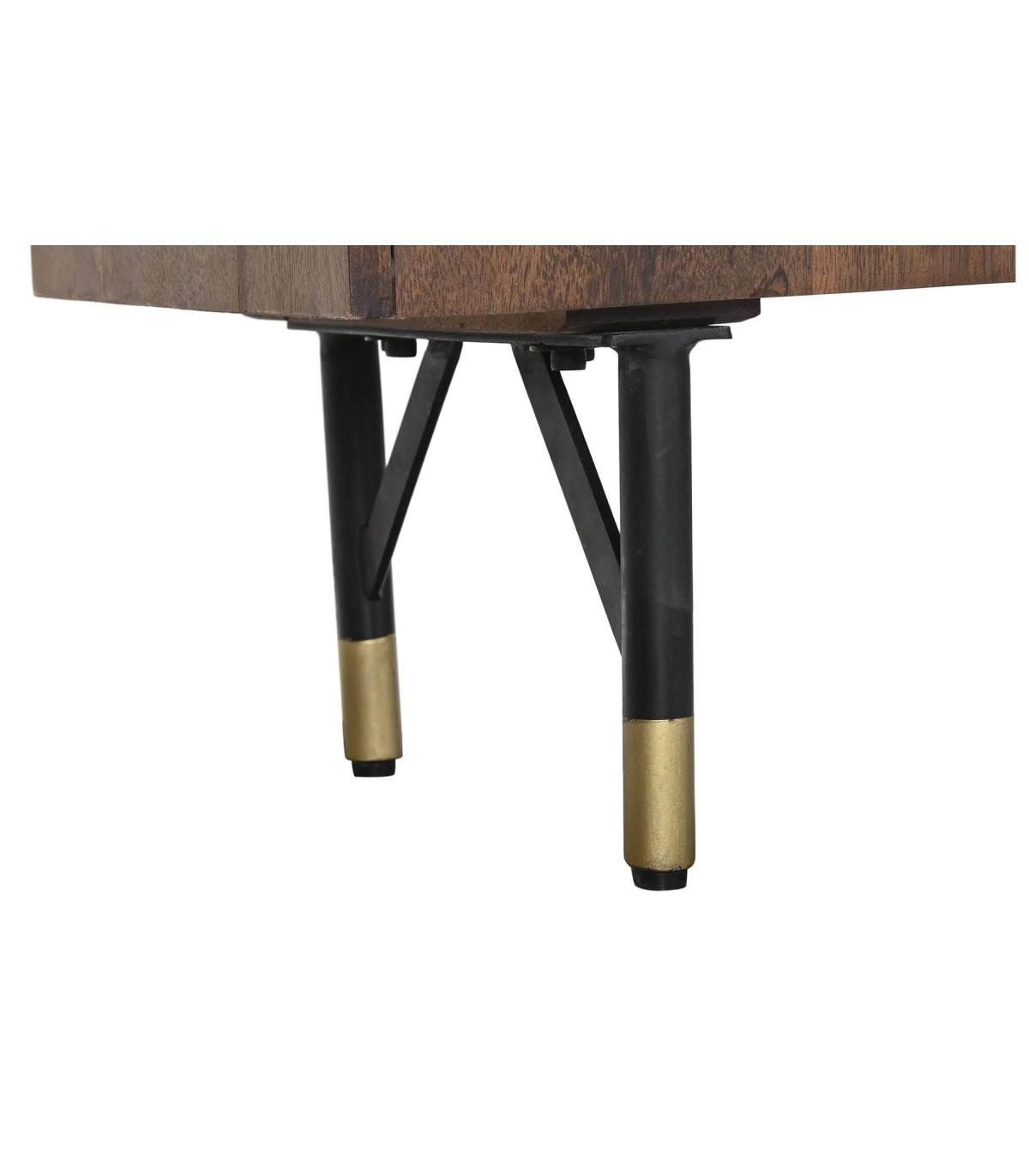 Acabado, madera color nogal y oro, patas en metal negro y oro.