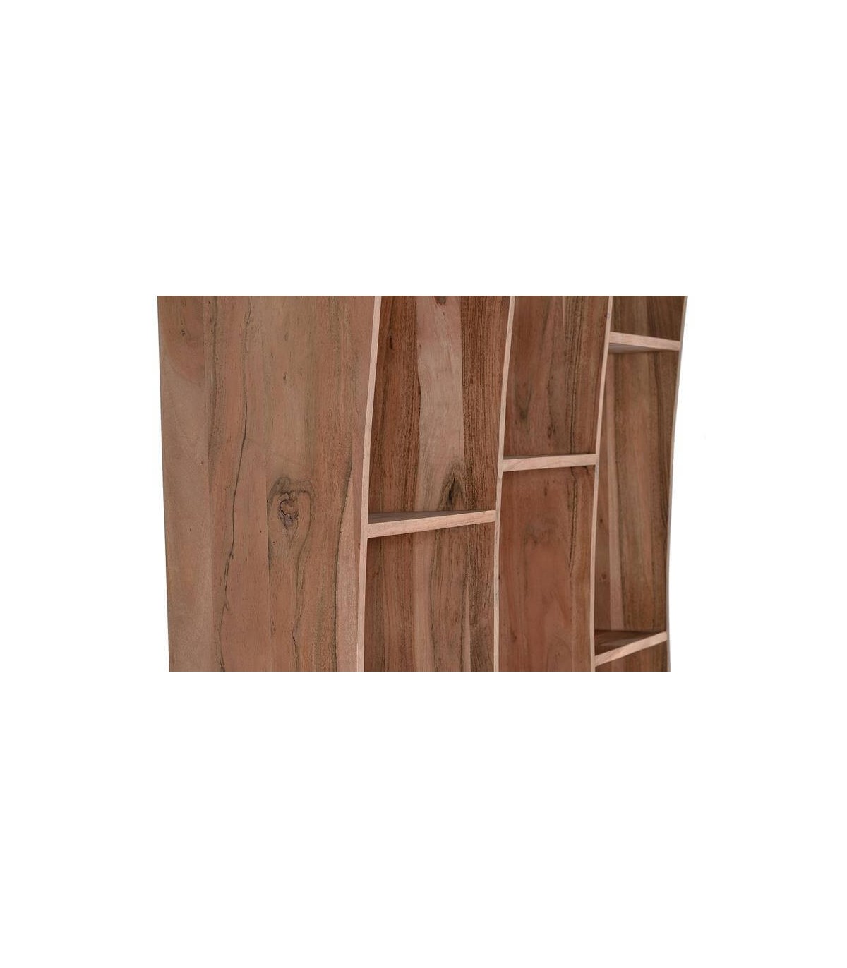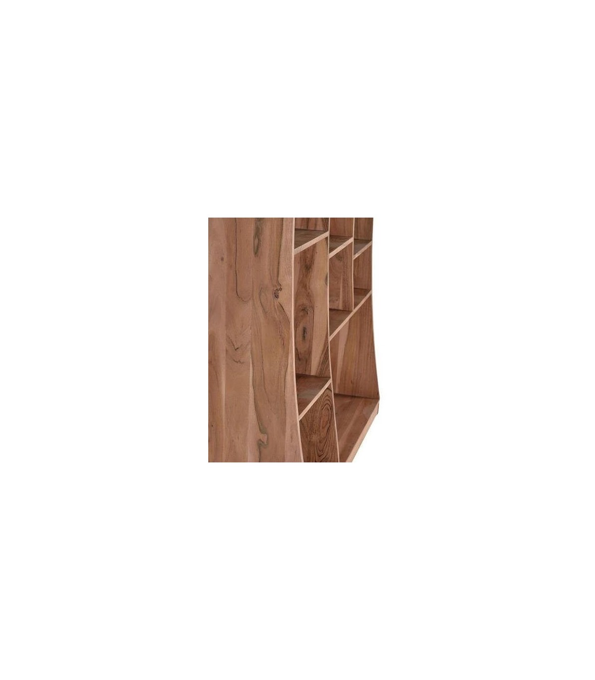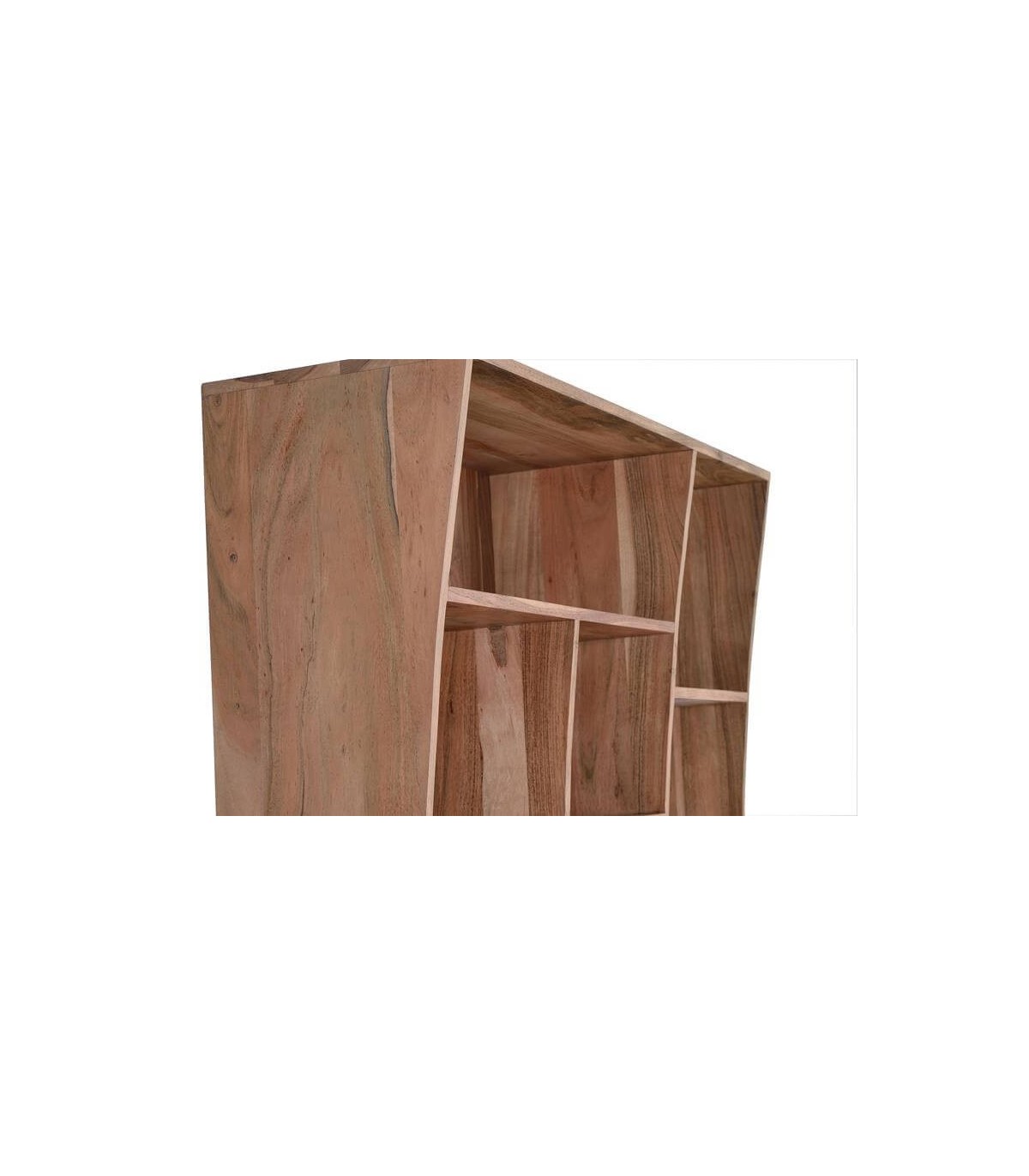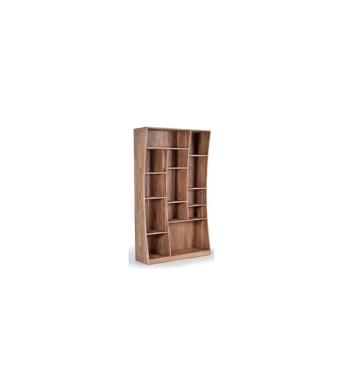 Librería con aire contemporáneo, con la belleza de la veta de la madera maciza de acacia, los contados cóncavos y un distribución irregular de las baldas aportan al mueble de un movimiento atemporal.