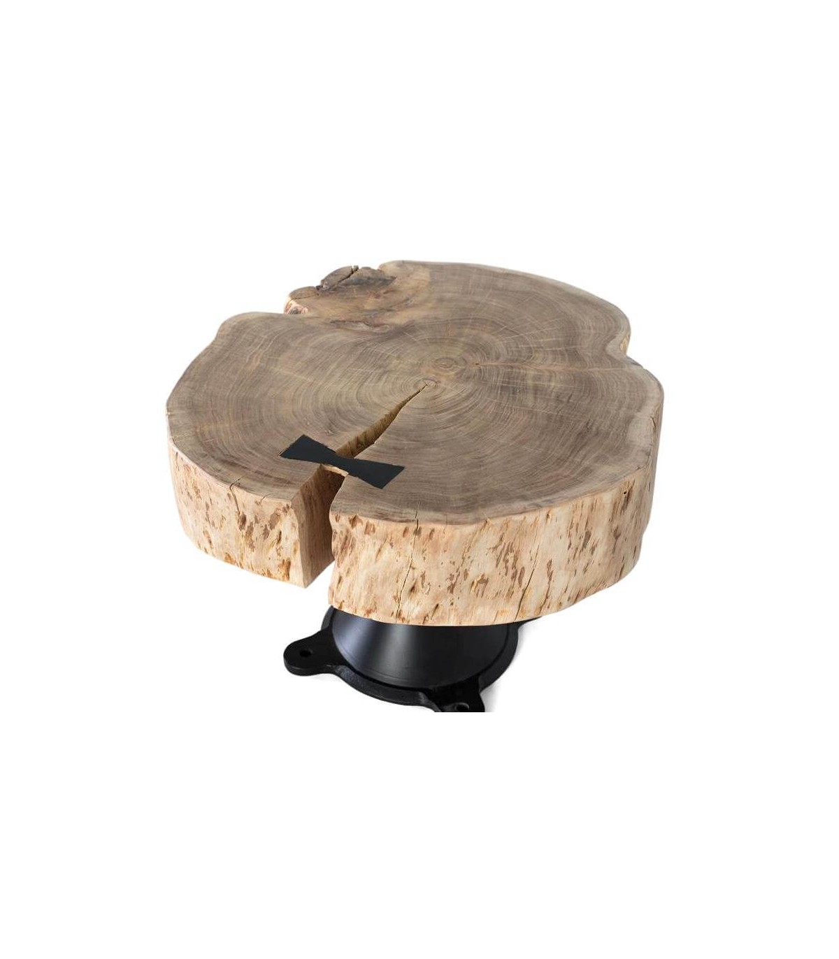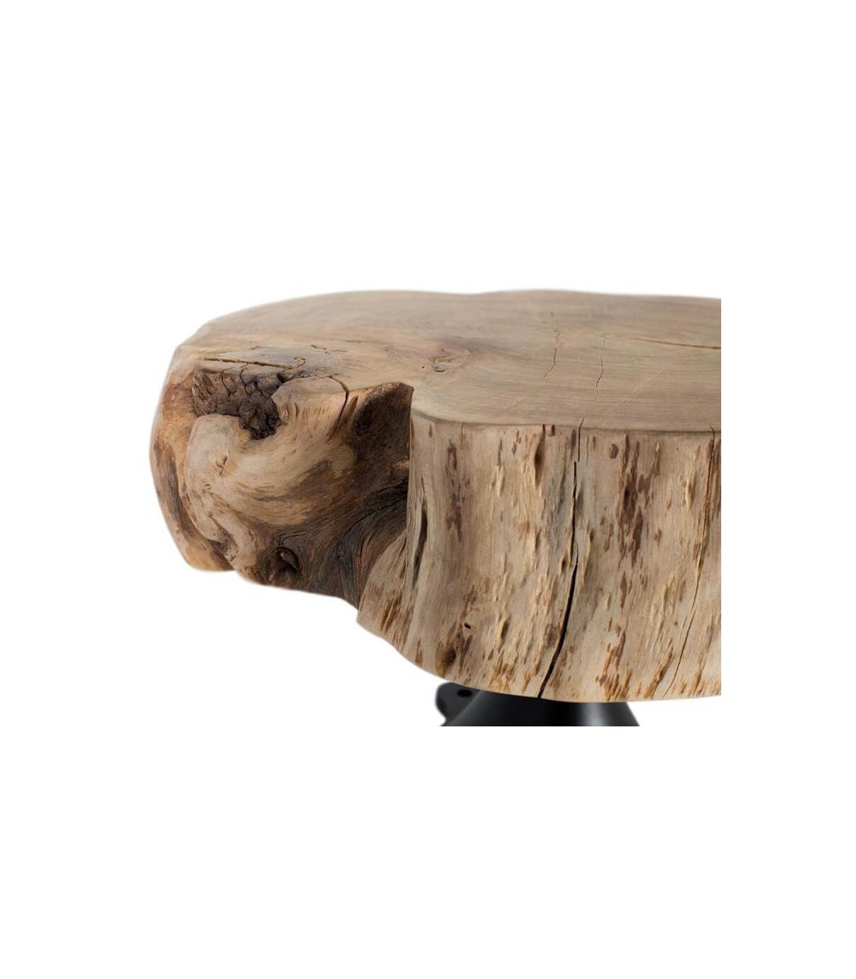Mesa de centro pequeña, realizada con un tronco de madera de acacia natural, metal negro.