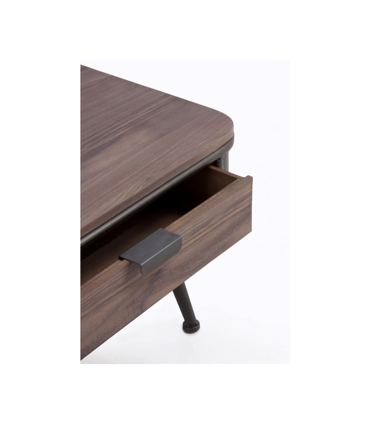 Mesa de centro con 2 cajones, la estructura, tiradores y patas en metal acabado gris rozado, madera de abeto teñida en color nogal, una mesa de centro que se podría encajar en decoraciones vintage, coloniales o industriales.