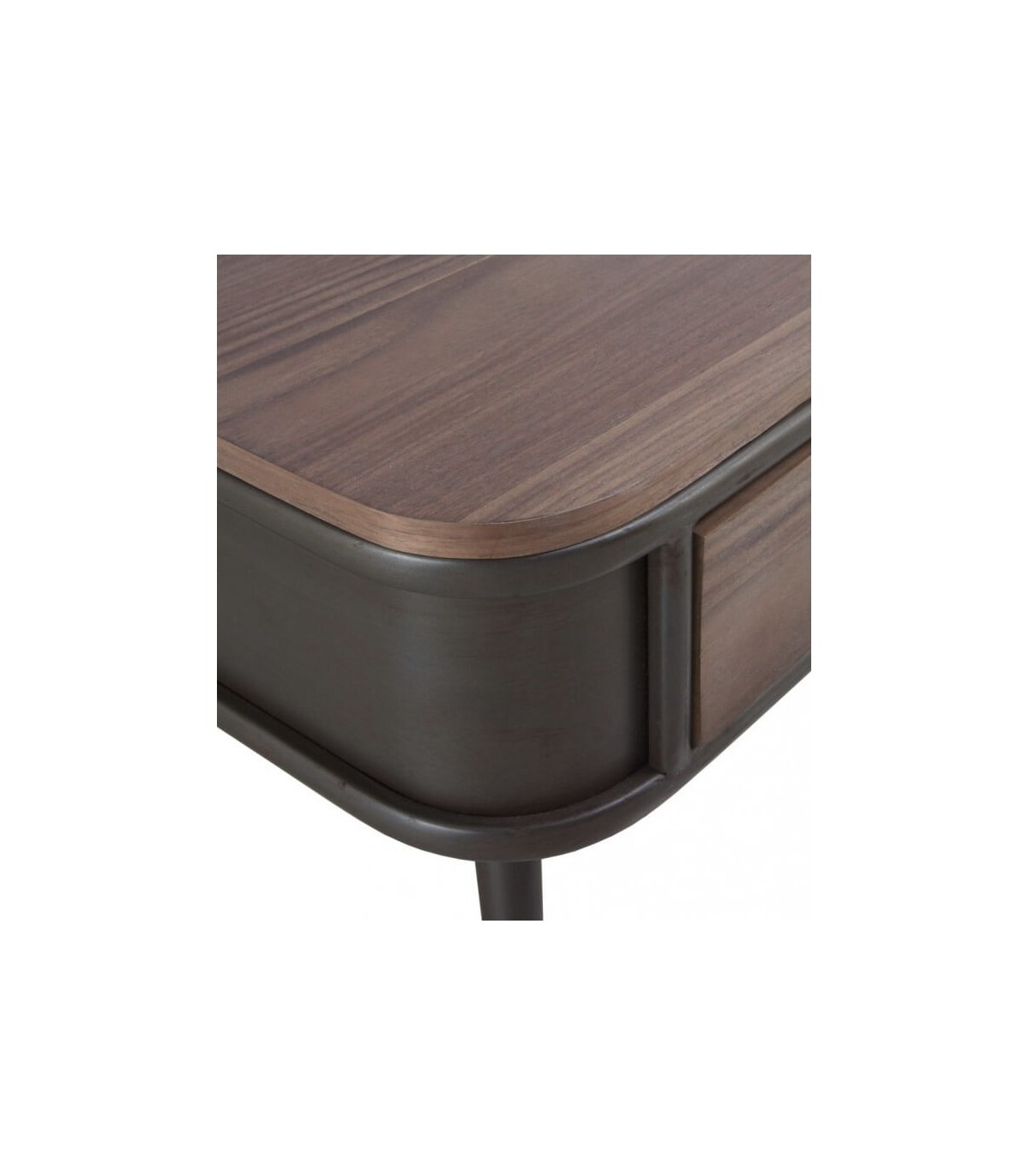 Acabado, estructura, tiradores y patas en metal acabado gris rozado, madera de abeto teñida en color nogal.