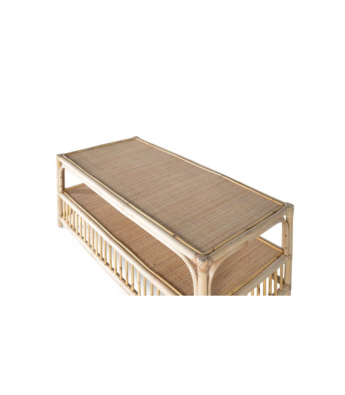 Mesita de centro, realizada artesanalmente en ratán natural, con una balda inferior, una mesita de centro ligera visualmente, perfecta para crear ambientes naturales.