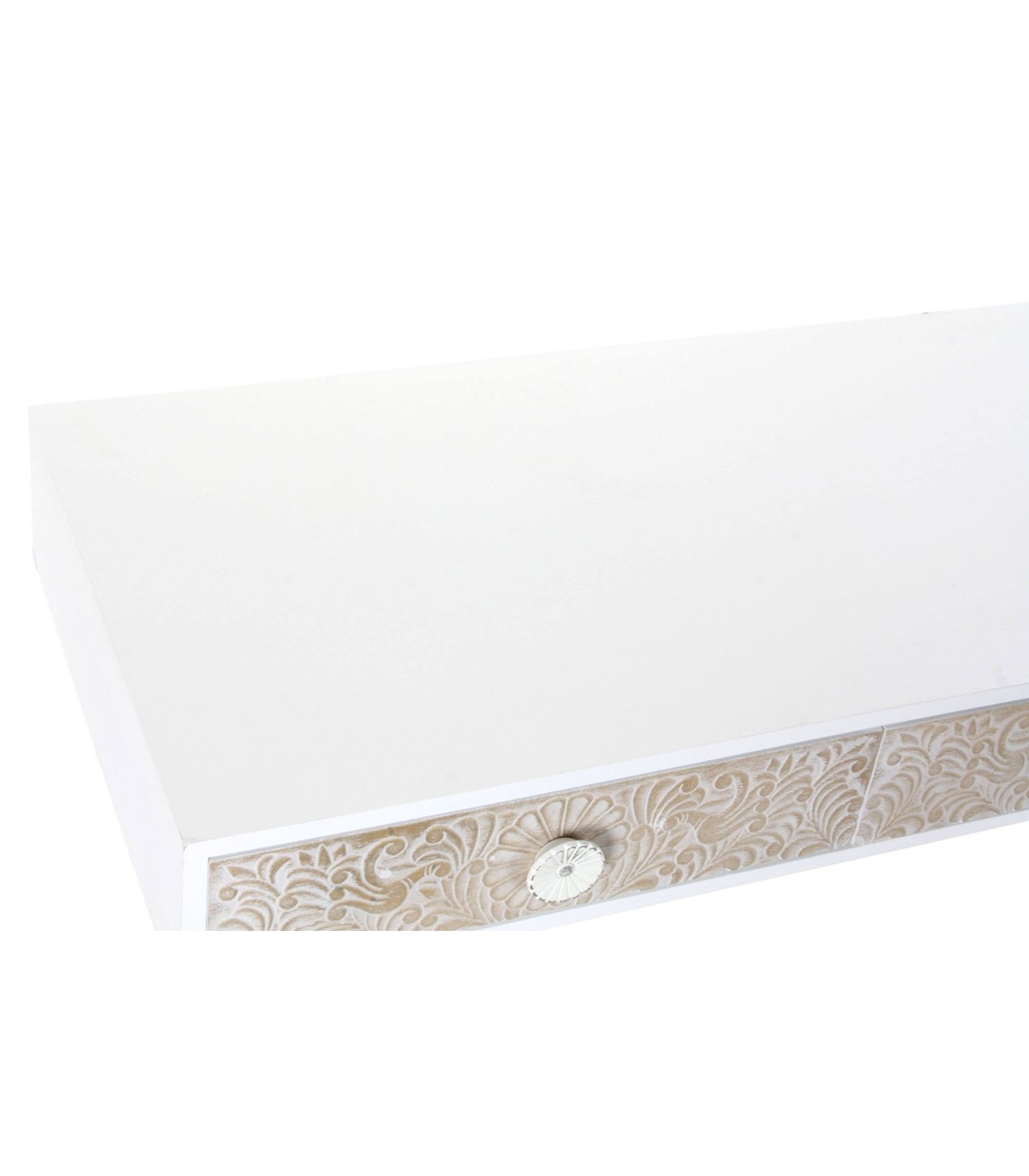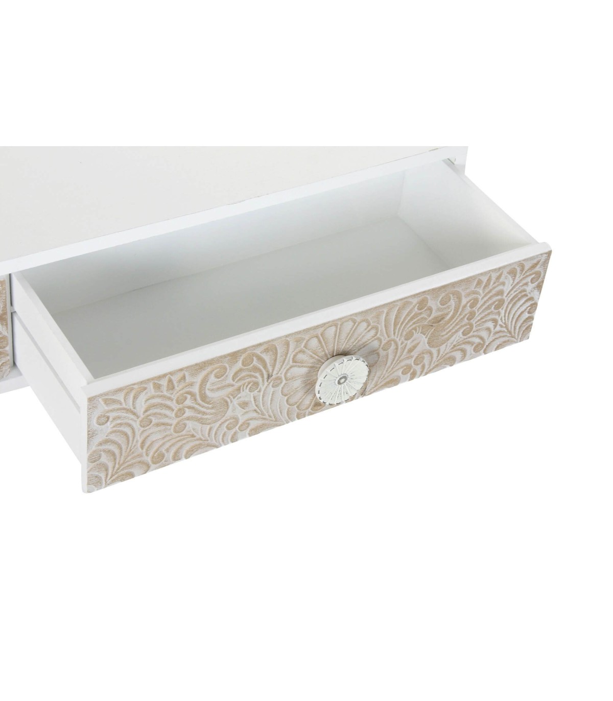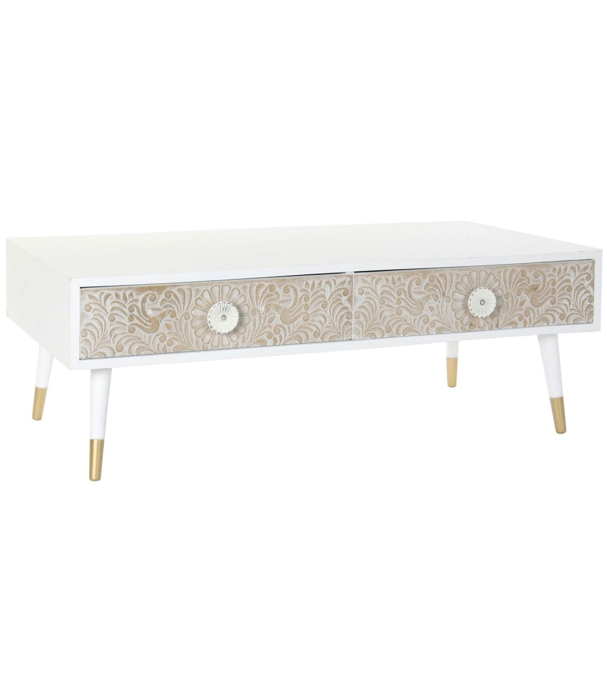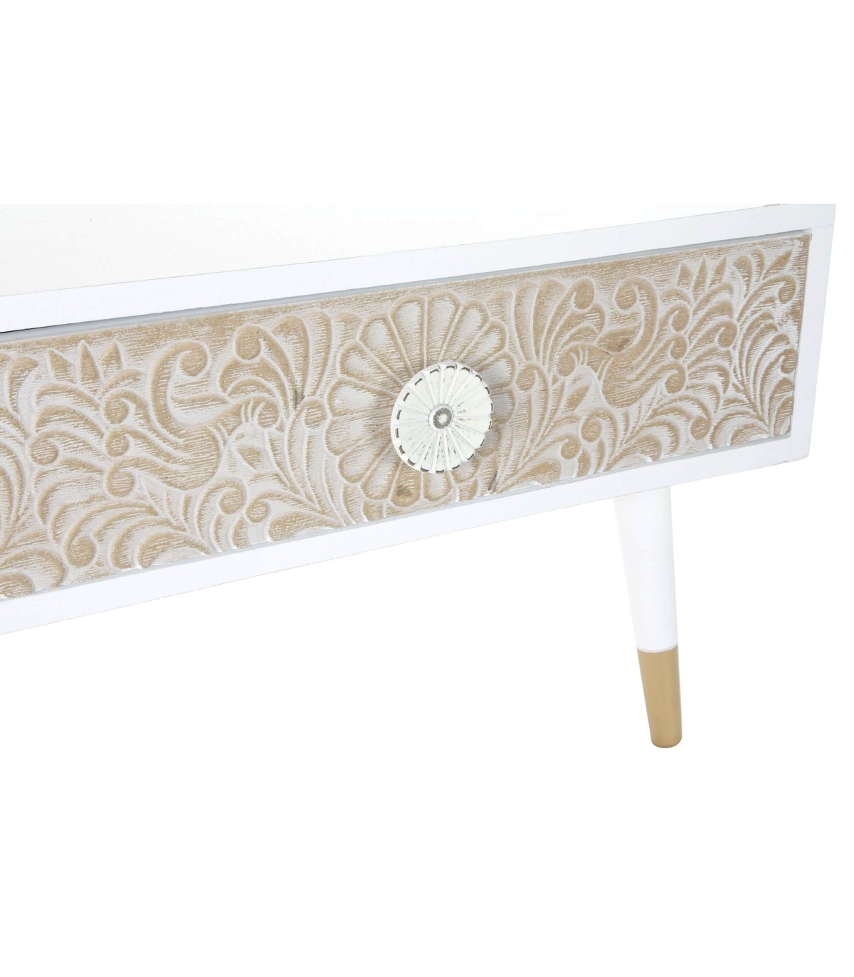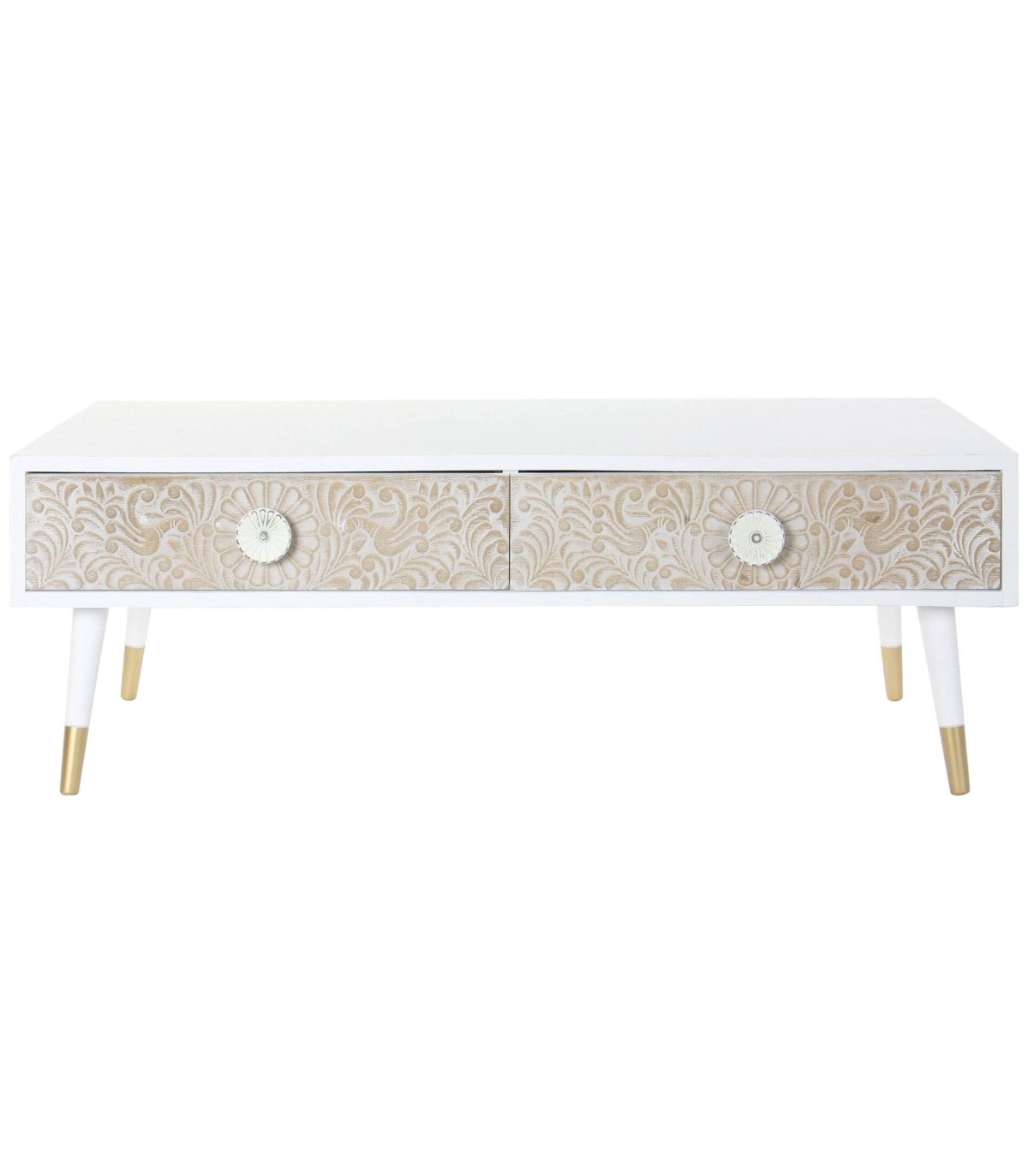 Mesa de centro de nuestra colección Zante, una colección realizada en madera de abeto, la talla de las puertas y los cajones le dan un cierto aspecto clásico y los acabados blanco y oro un aire art decó, la tienes en dos acabados diferentes, ideal para quien busca un mueble con mucha personalidad.