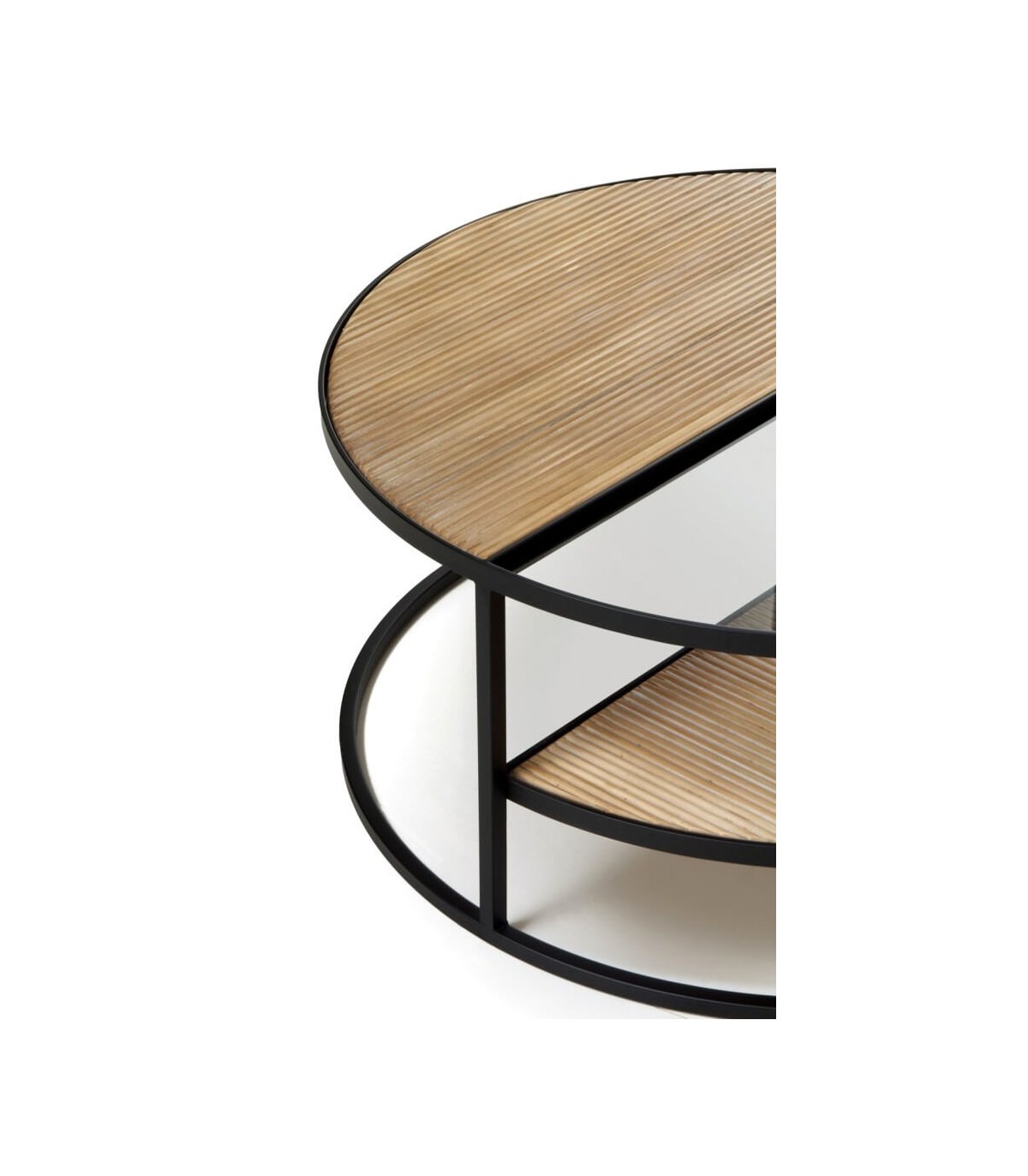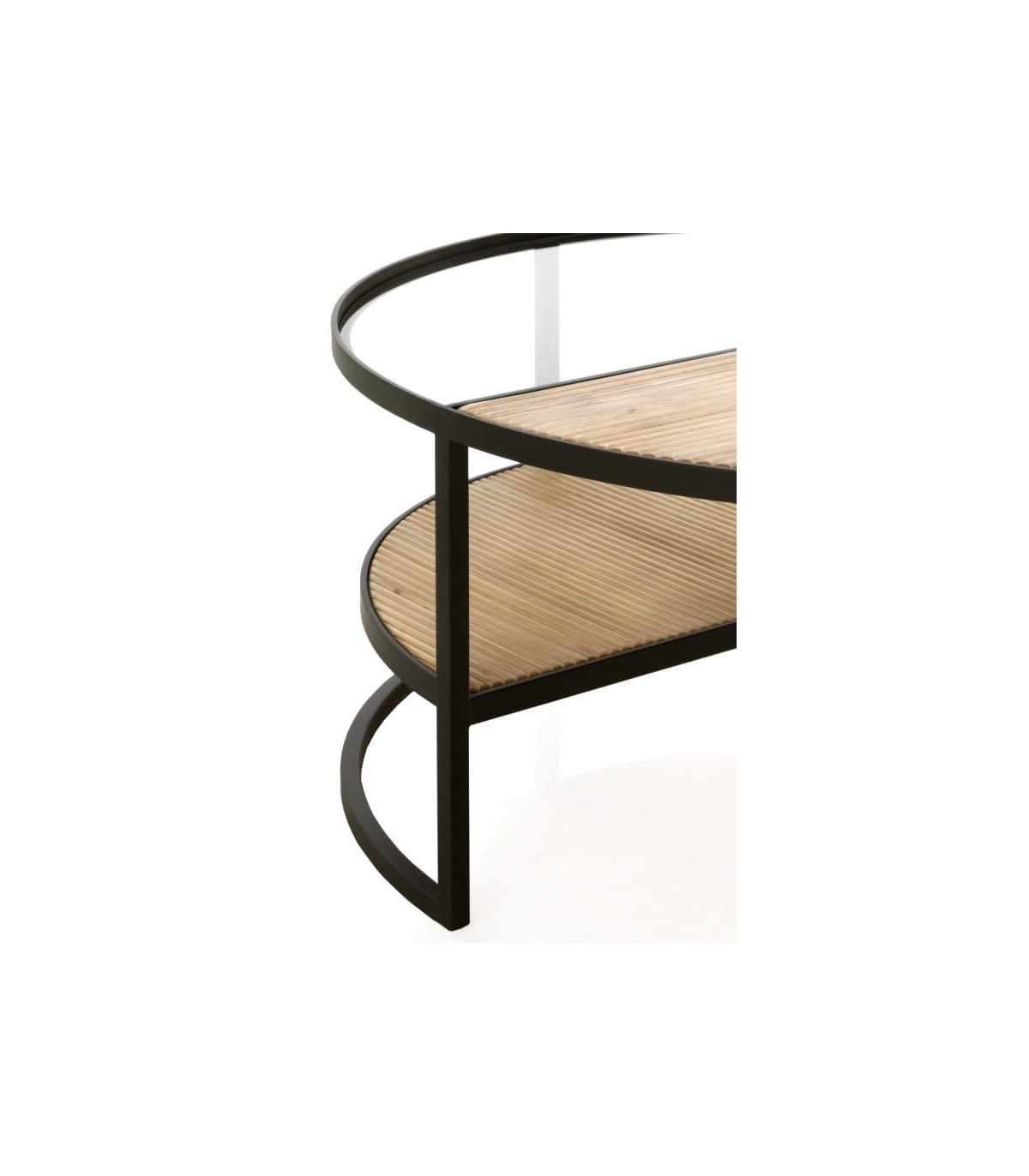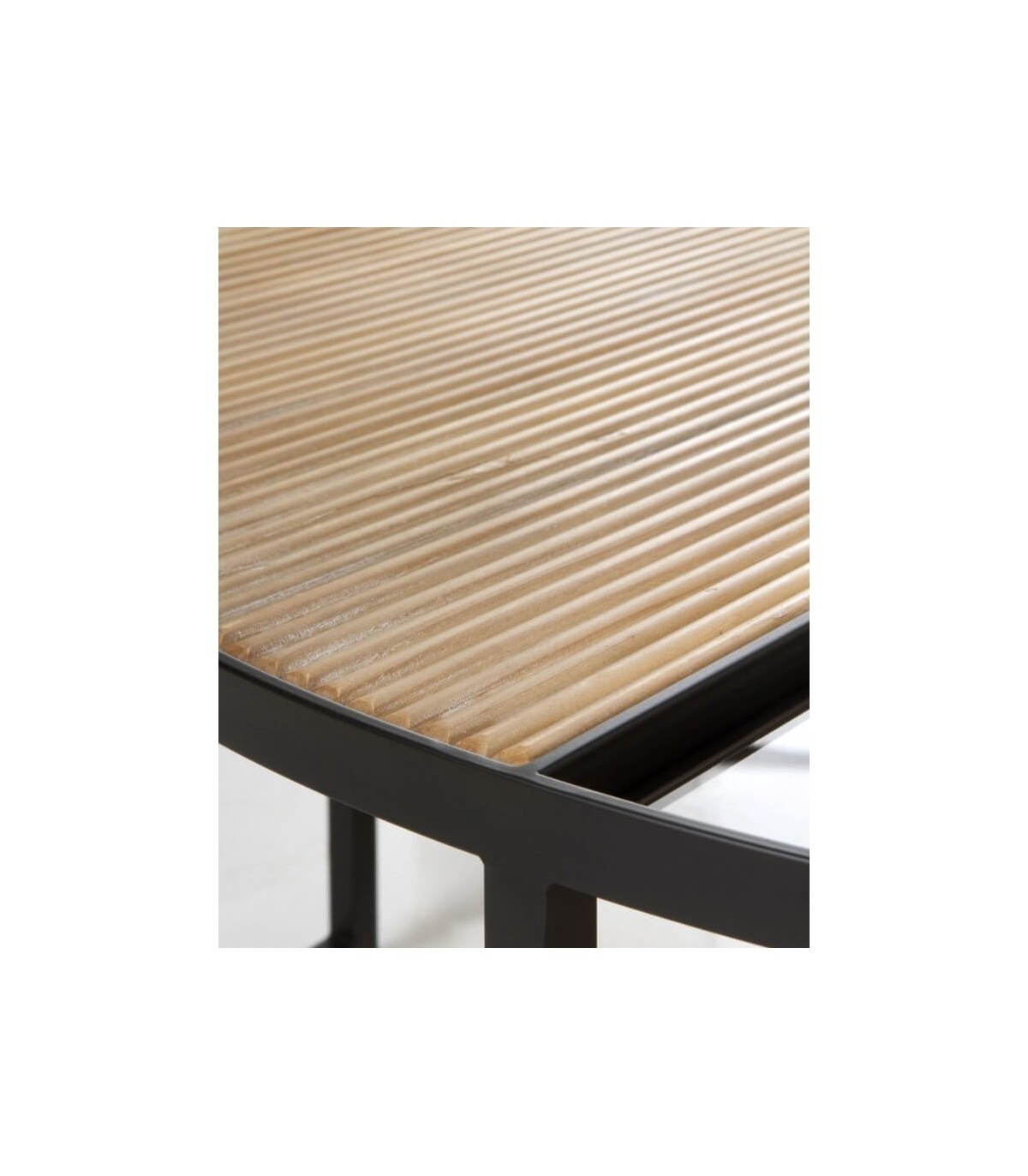 • Acabado, madera natural acanalada, metal negro, cristal transparente.