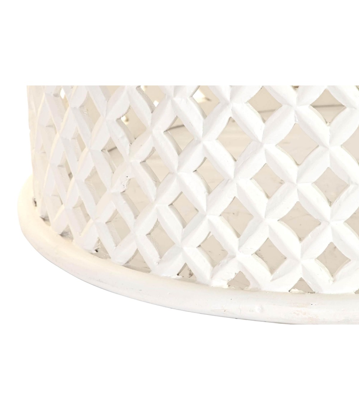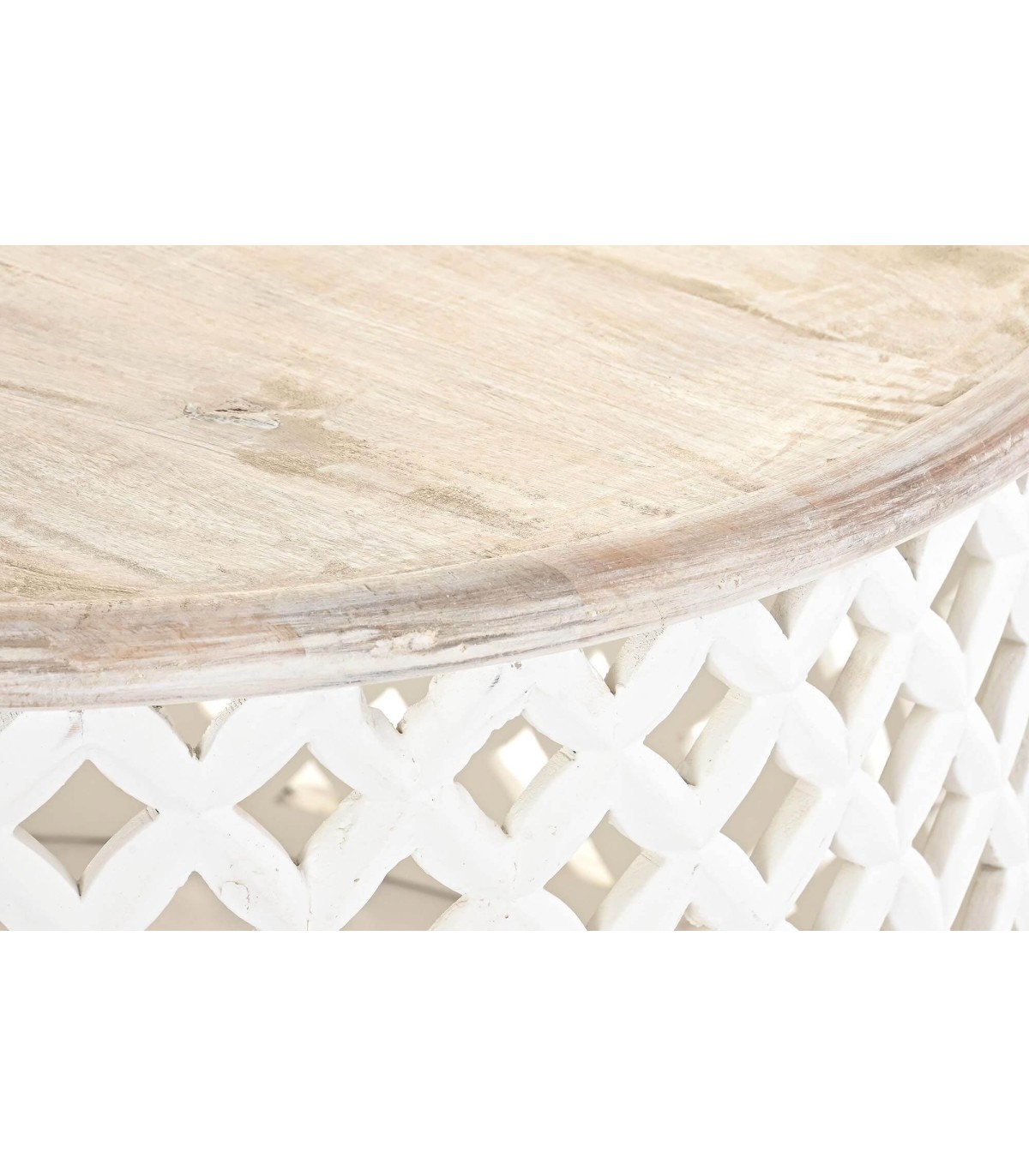 Mesa de centro estilo colonial, con dos partes bien diferenciadas la base tallada acabado en un blanco vintage y la tapa aportando calidez y suavidad en madera de mango natural, existe la mesa de rincón a juego.