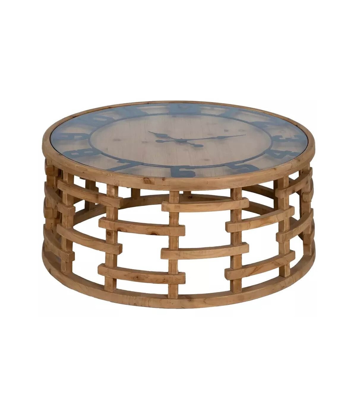 Mesa de centro redonda, realizada en madera de abeto natural, con un reloj estilo vintage en la tapa, la fabricación artesanal la hacen una mesa única, perfecta para salones de estilo colonial.