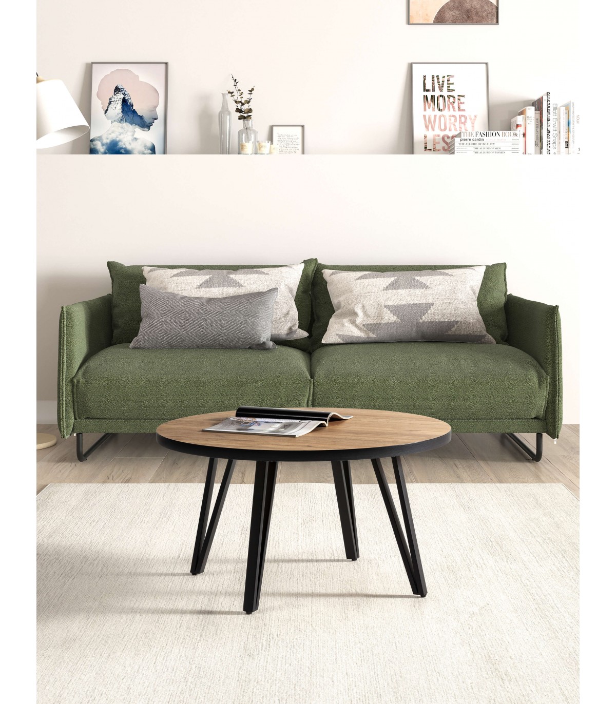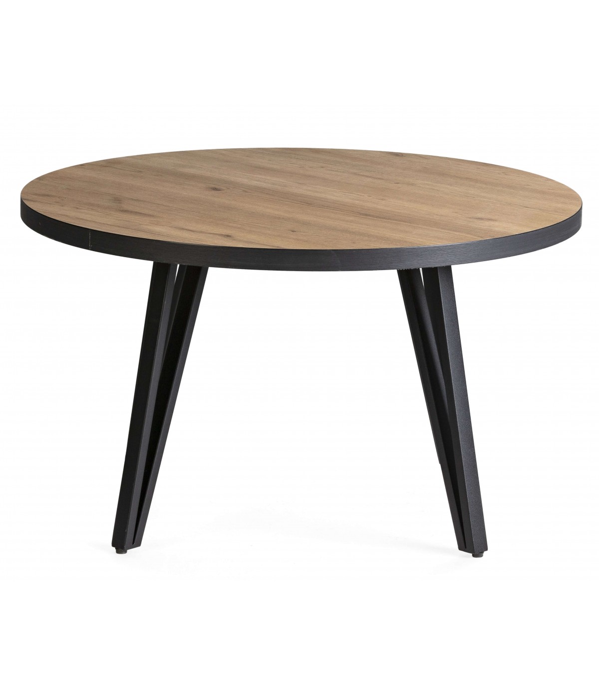 Mesa de centro redonda de estilo industrial, con las patas en metal negro y la tapa en melamina imitación roble natural. ideal para sofás con chaise longue.