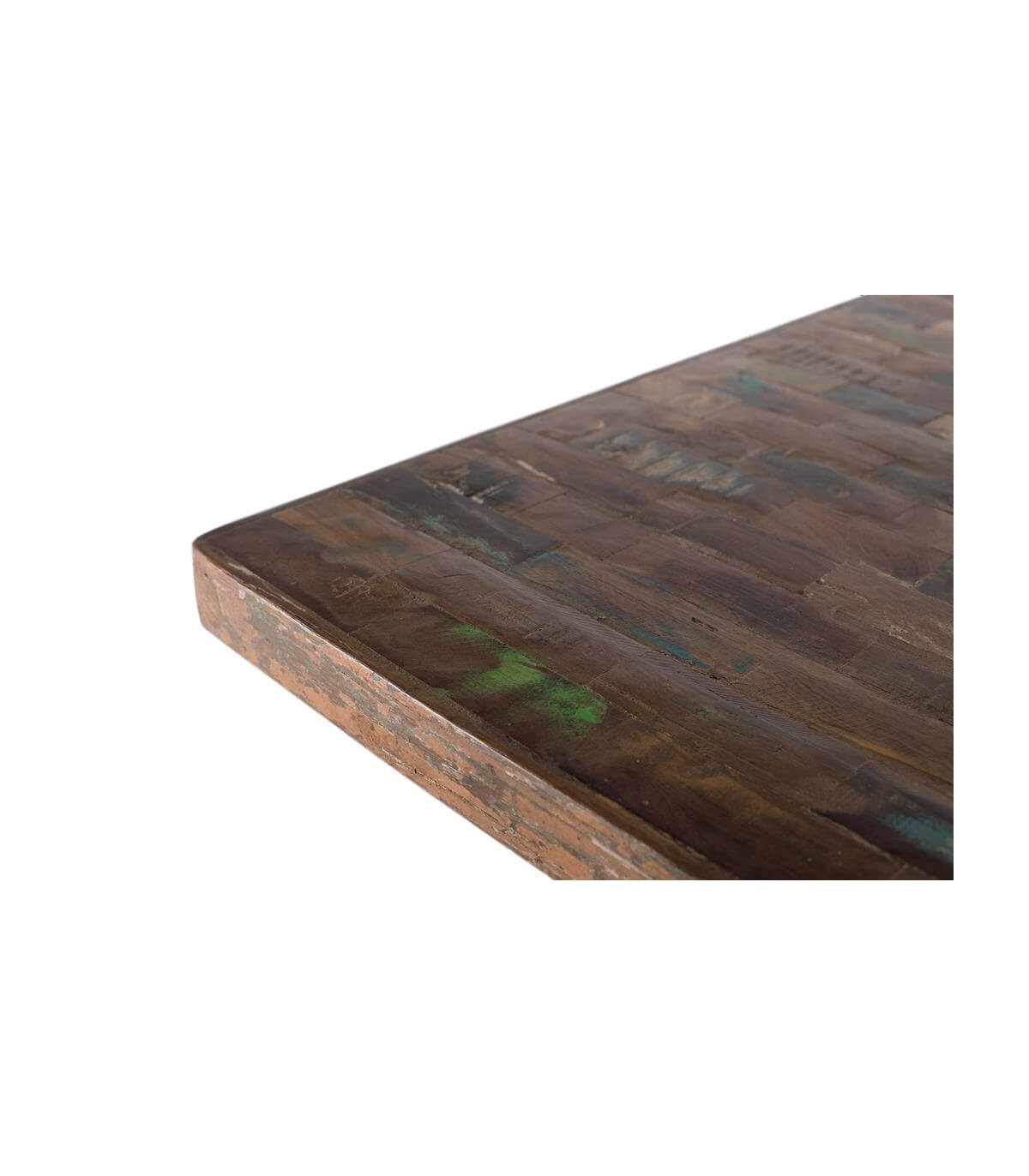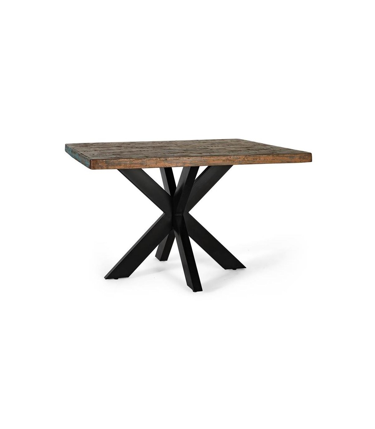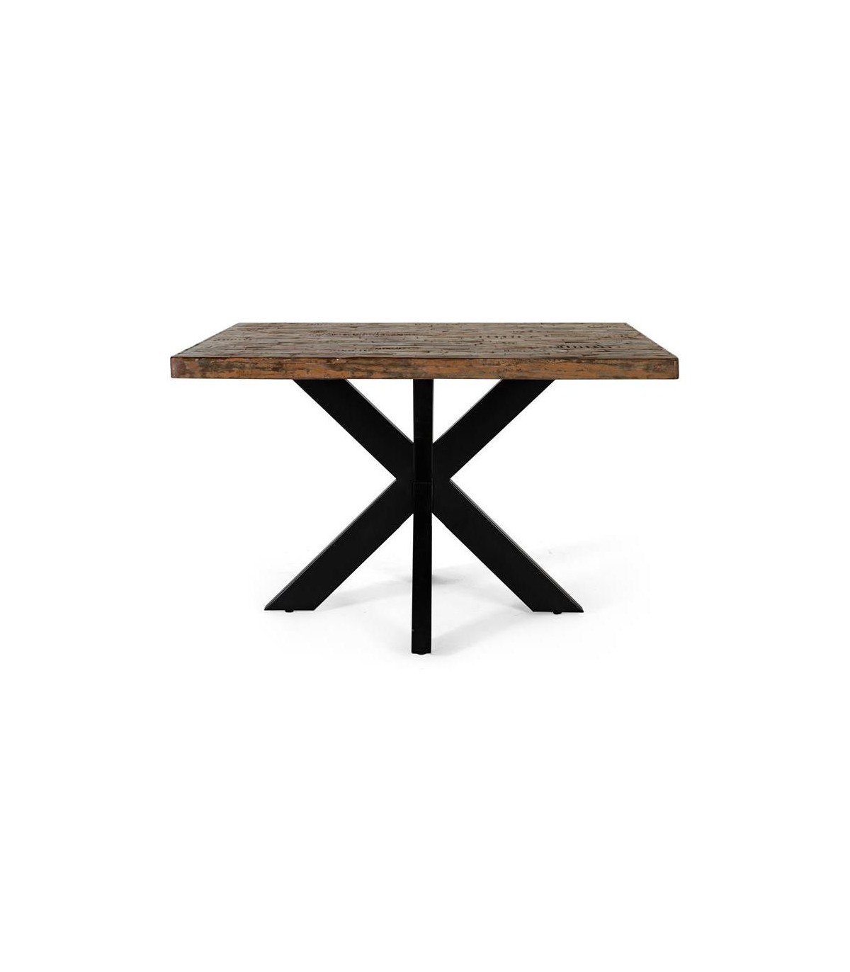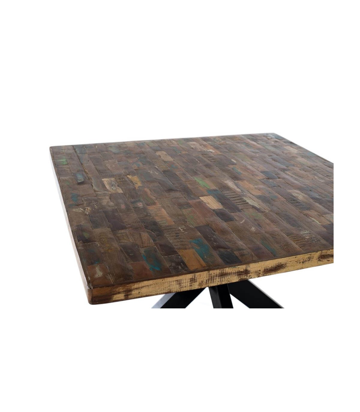 Mesa de comedor cuadrada de estilo industrial, acabado estructura de metal negro y tapa en madera reciclada multicolor, una mesa que aporta calidez y elegancia, ideal para protagonizar el centro de la conversación.