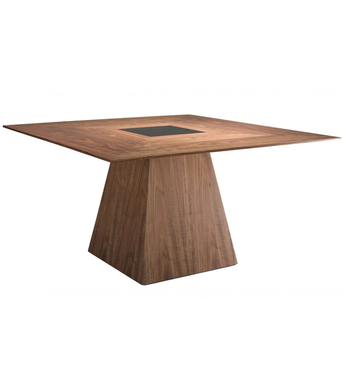 Mesa comedor cuadrada grande de diseño moderno con tapa fija y estructura de madera chapada en nogal natural con una aplicación en cristal negro. Una mesa perfecta para aportar luminosidad y vanguardia a tu cocina, salón o comedor.