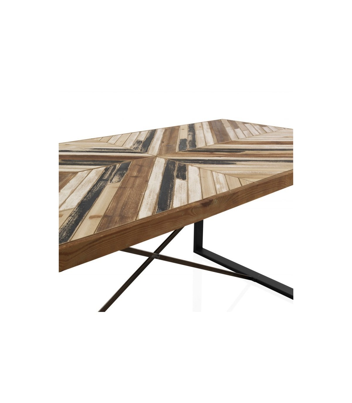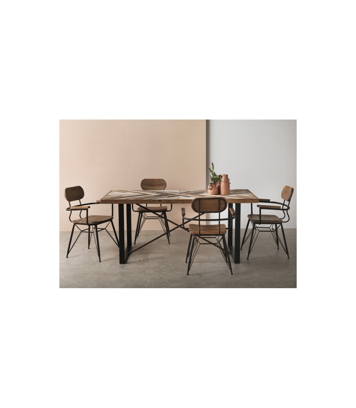Una pieza robusta y original que fusiona el carácter del estilo industrial con la calidez de la madera natural. Esta mesa de comedor rectangular cuenta con un sobre elaborado en madera maciza de abeto con acabado multicolor en disposición geométrica, creando un efecto visual artesanal y contemporáneo. Su base metálica negra en forma de U aporta estabilidad y un aire urbano muy actual.