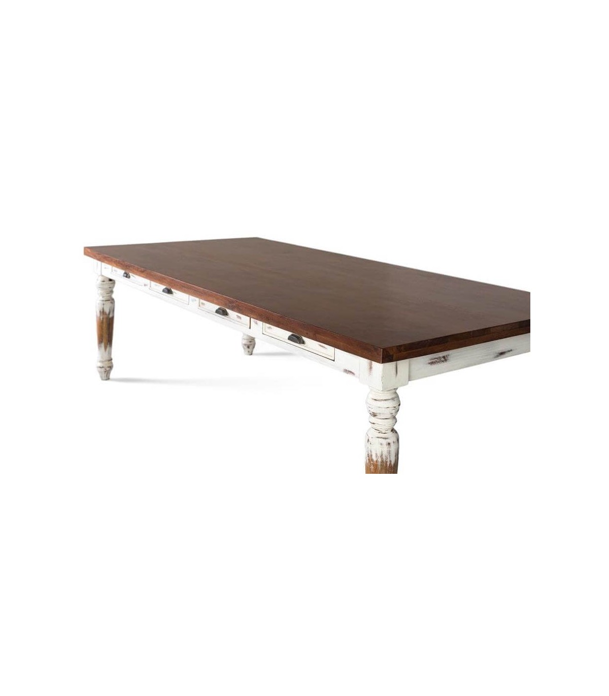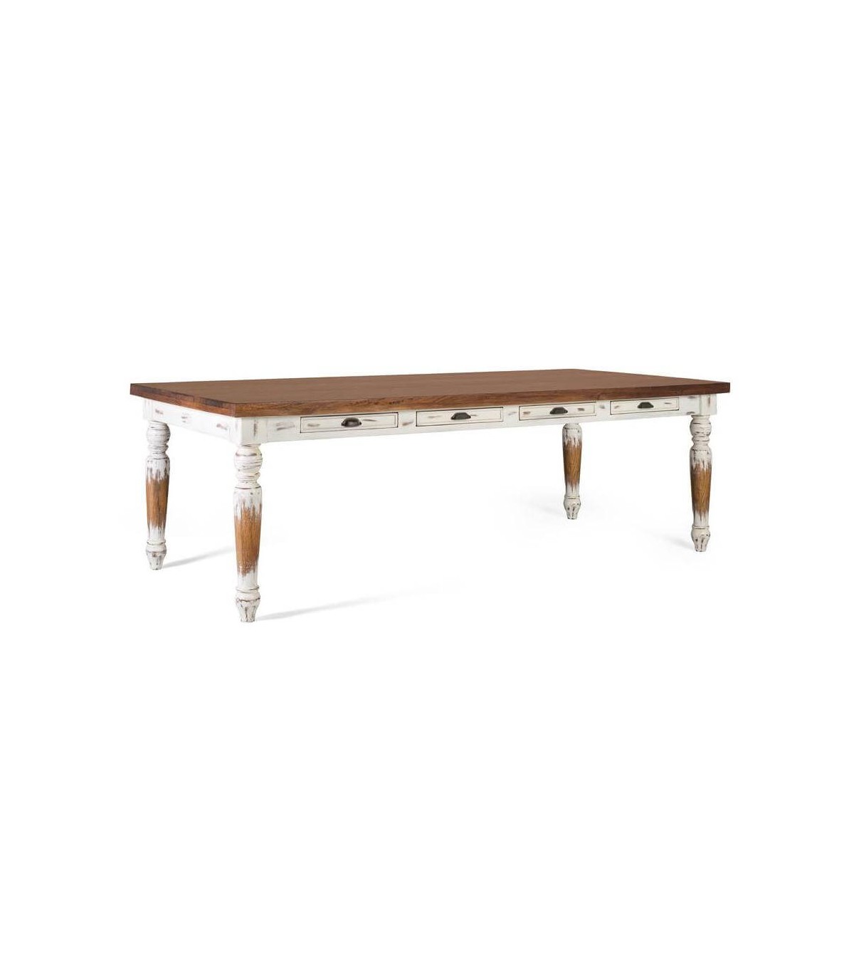 Las patas torneadas y el bastidor en blanco rozado contrastan con la tapa color nogal, aportando un equilibrio entre lo cálido y lo decorativo. Una pieza robusta y versátil que encaja tanto en ambientes rústicos como en comedores de aire provenzal. Su presencia otorga identidad y calidez al espacio.