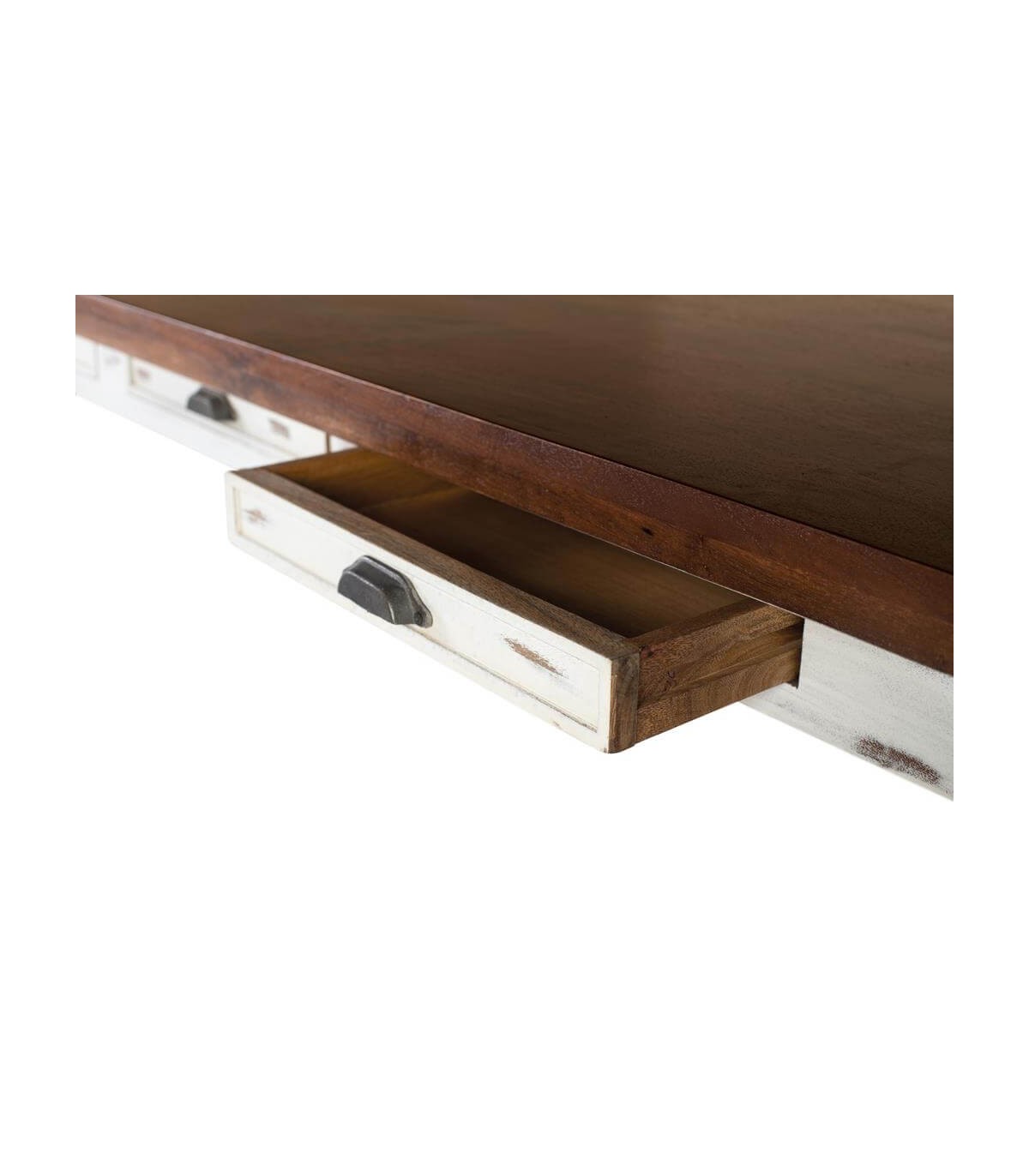 Una mesa imponente que combina funcionalidad y carácter artesanal. Su generosa superficie rectangular en madera maciza de mango es ideal para grandes reuniones o espacios amplios. El diseño incorpora cuatro cajones frontales con tiradores de concha, perfectos para guardar mantelería o accesorios.