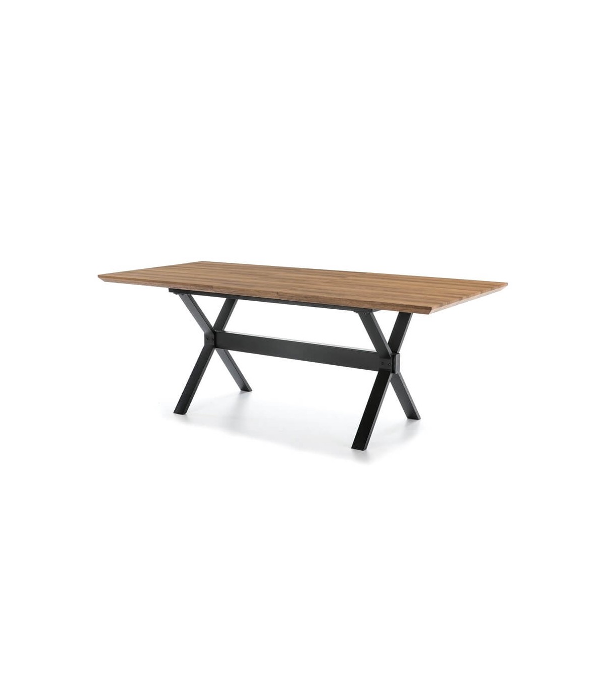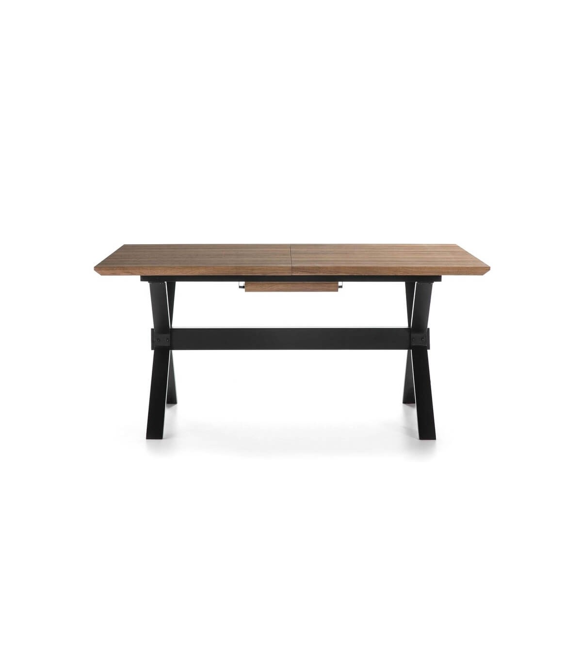 Mesa de comedor rectangular pequeña extensible pata de metal lacada en negro, tapa de madera laminada de nogal acabado natural. Una mesa fuerte y práctica con un marcado estilo industrial que encaja muy bien en ambientes modernos.