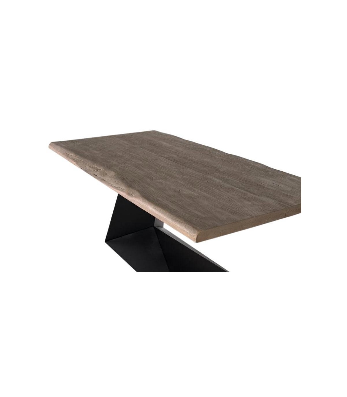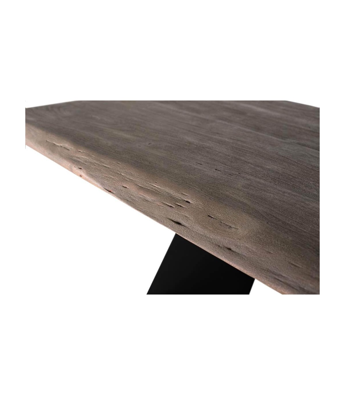 Mesa de comedor rectangular grande realizada en madera maciza de acacia con la belleza de su veta en estado natural y una base en metal negro muy cuidada en cuanto al acabado de las soldaduras, perfecta para un gran comedor.