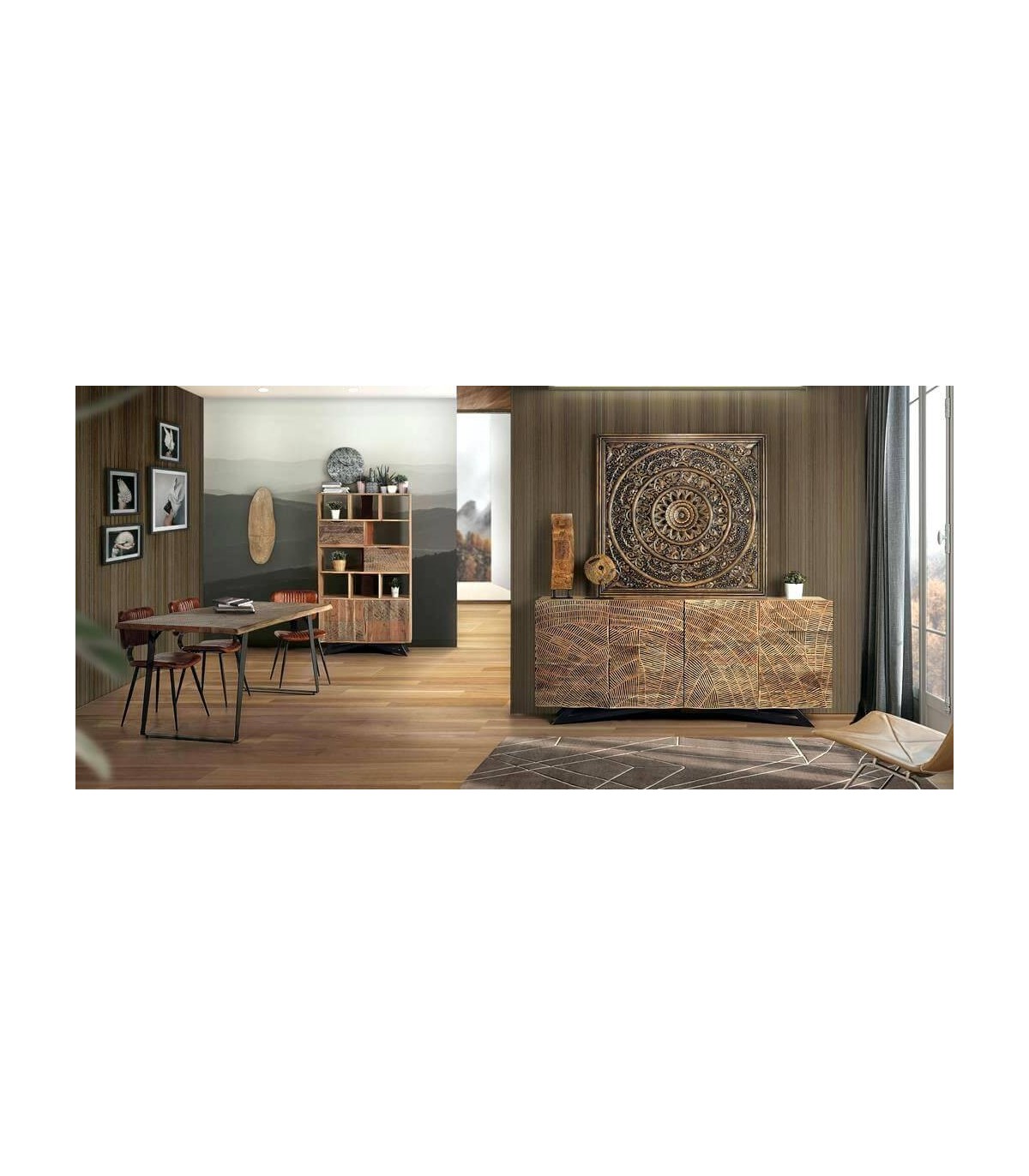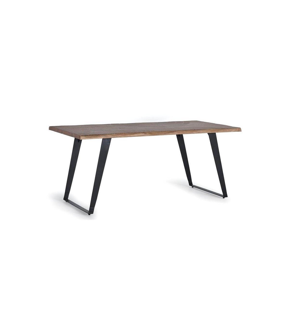 Mesa de comedor de nuestra colección de muebles Kelapa, una colección realizada en madera maciza de acacia tallada a mano acabada en natural y negro, a caballo entre el estilo étnico y el toque industrial que nos da la base en metal en negro, una colección muy versátil y decoratiiva y elegante.