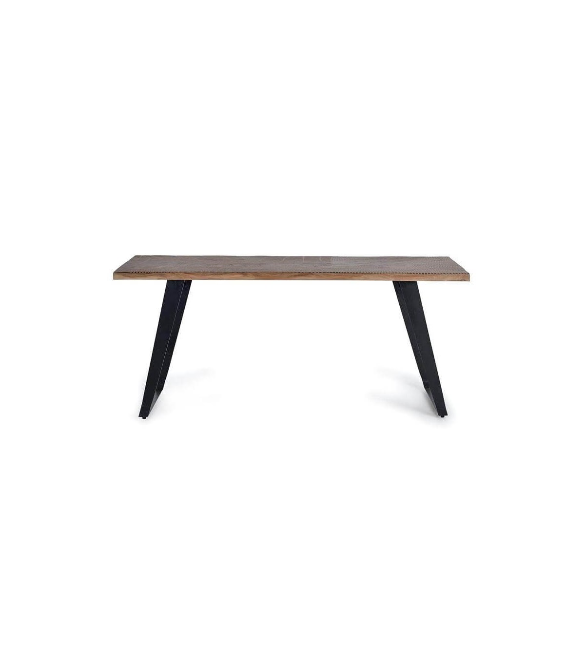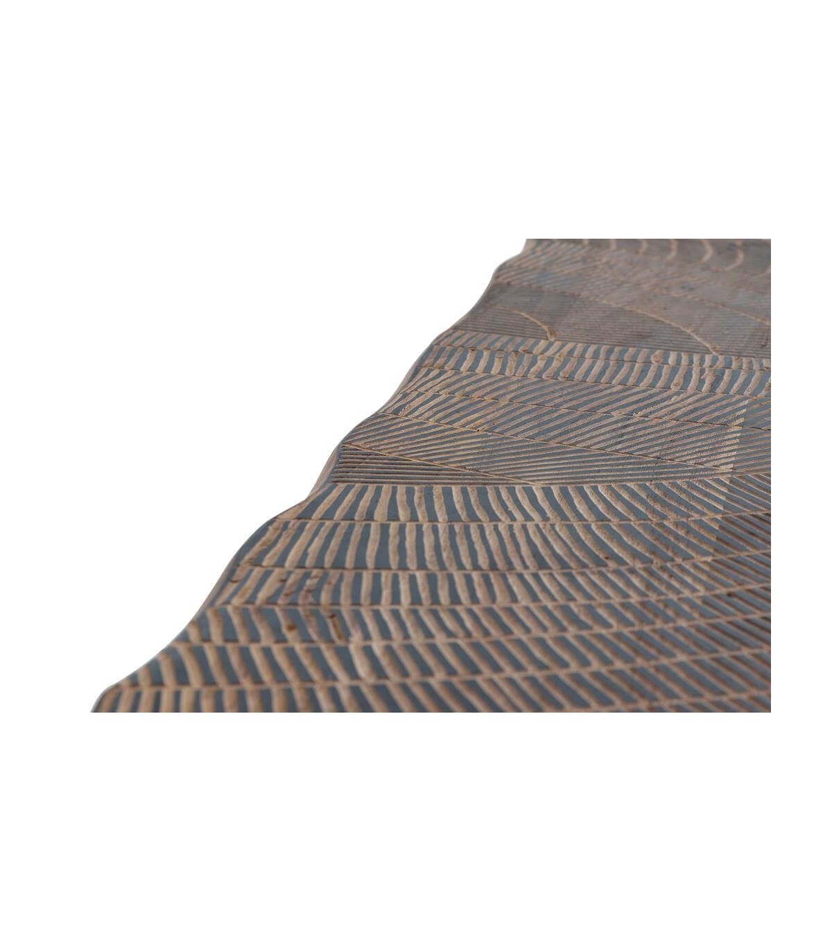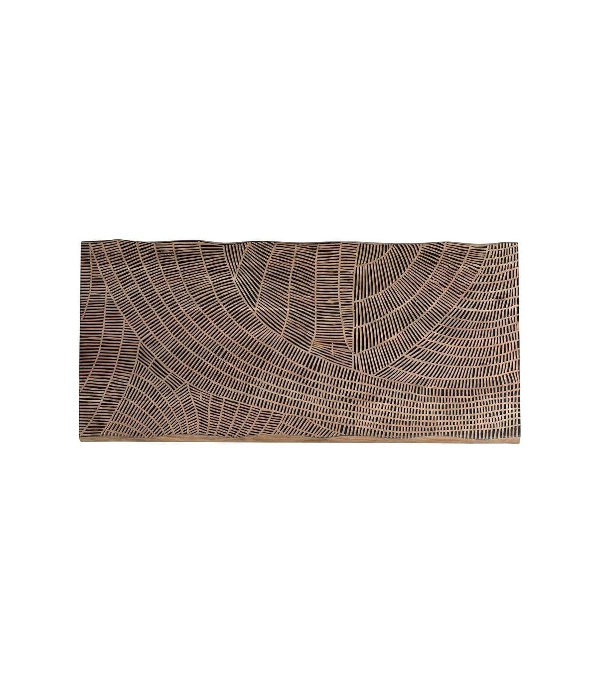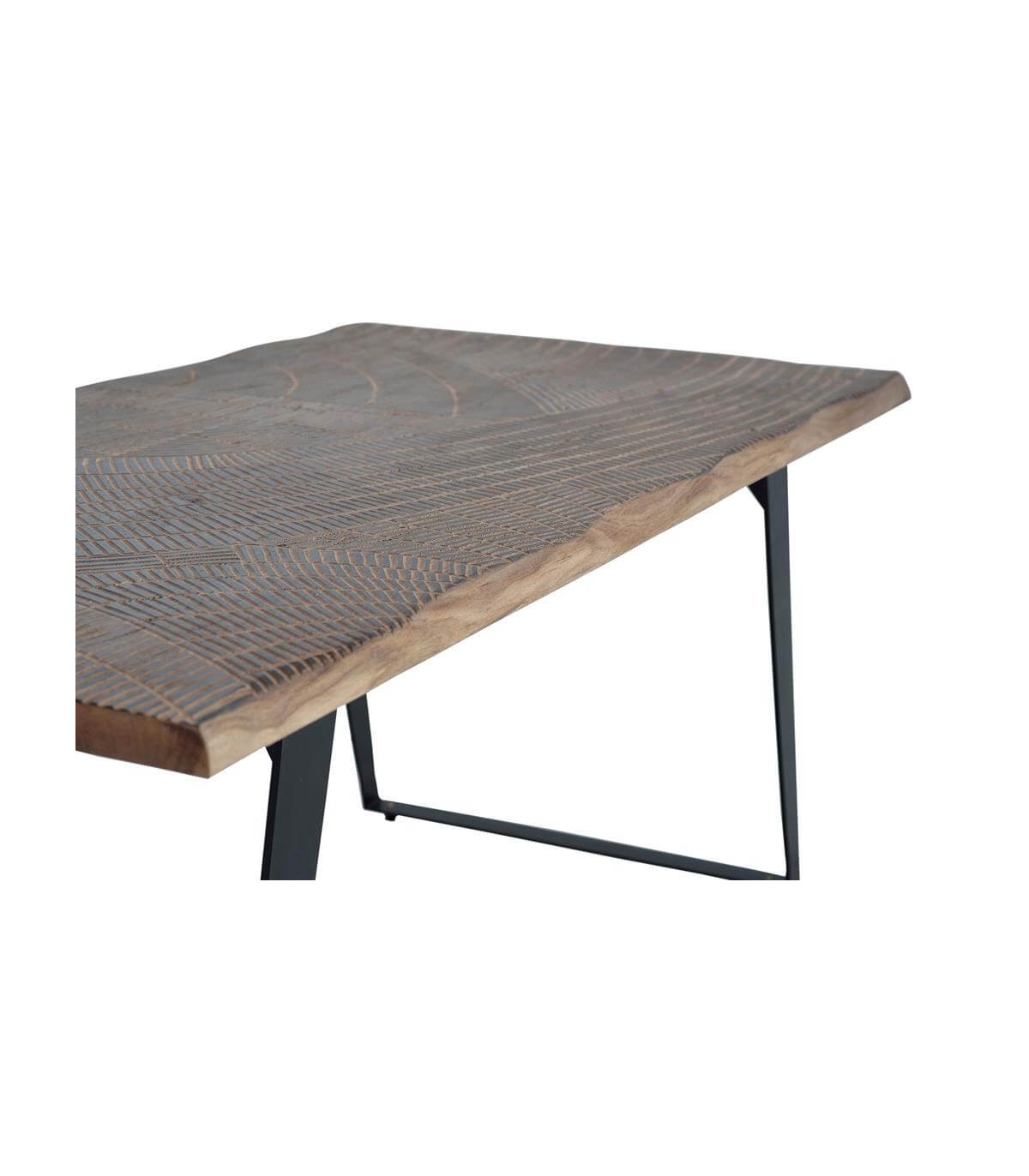 Acabado, artesanal, tapa en madera de acacia tallada a mano en natural y negro, patas metal negro.