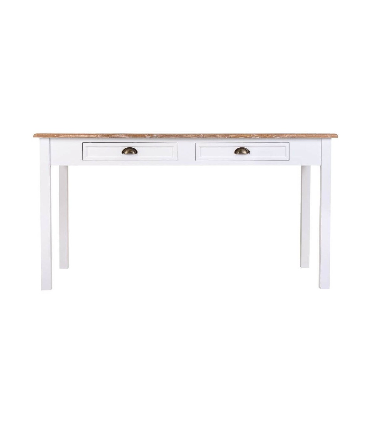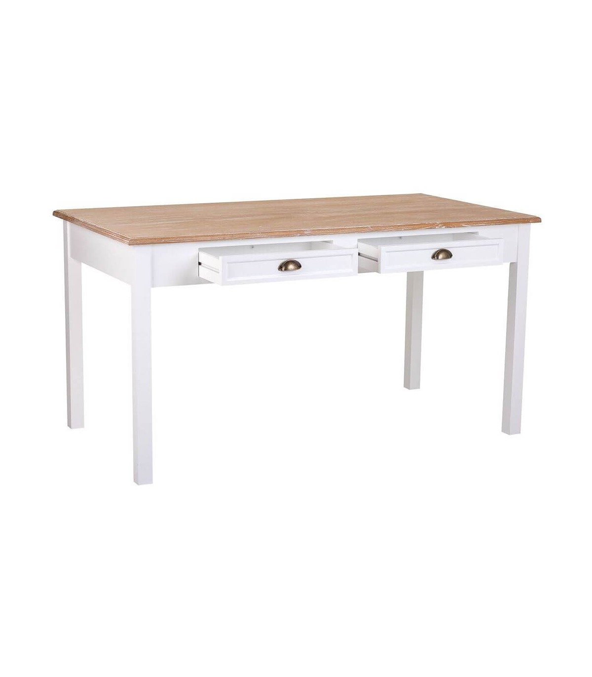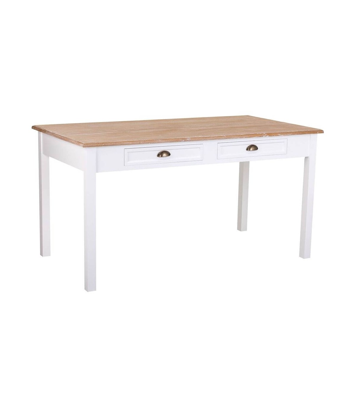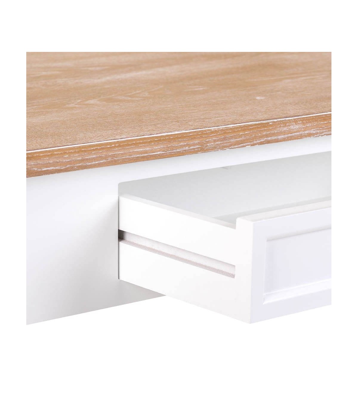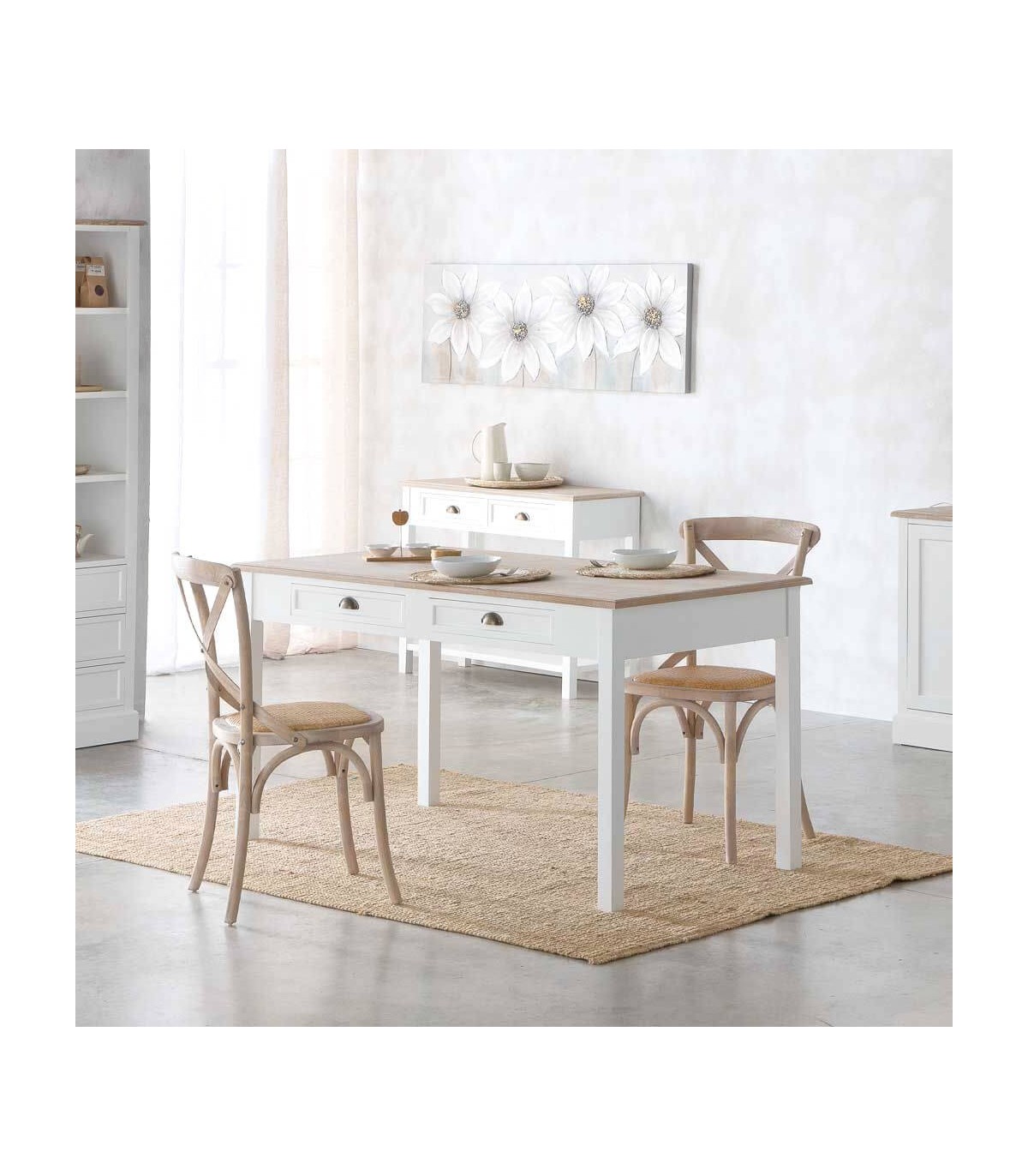 Mesa de comedor de nuestra colección Mirlo, una colección que se caracteriza por su luminosidad, realizada en madera lacada en blanco con la tapa en madera natural patinada en blanco, de líneas rectas con el contraste del tirador tipo concha en metal acabado bronce, una colección de muebles auxiliares con los que podrás darle un toque rústico mediterráneo a cualquier estancia de tu hogar.