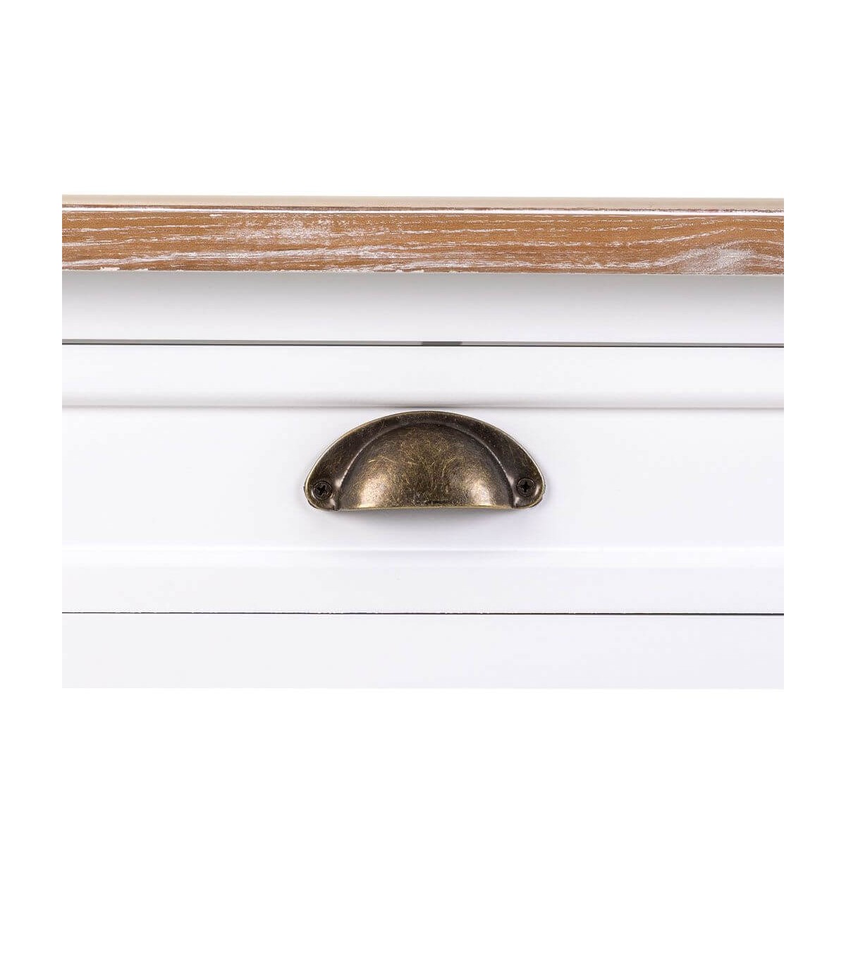 Acabado, tapa madera natural patinada en blanco, cuerpo lacado en blanco, tiradores bronce.