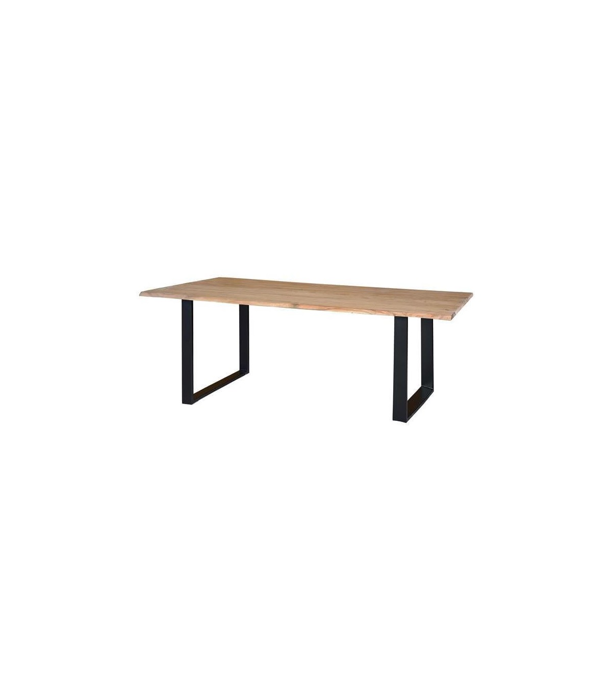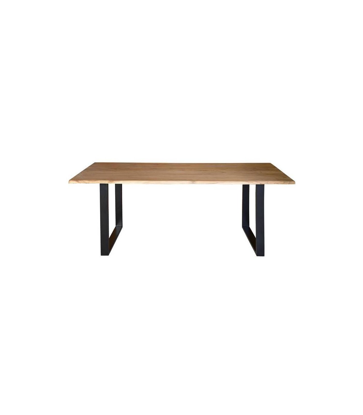 Mesa de comedor rectangular pequeña con la tapa con bordes irregulares realizada en madera maciza de acacia natural, patas en metal color negro. Perfecta para ambientes de estilo industrial o colonial.