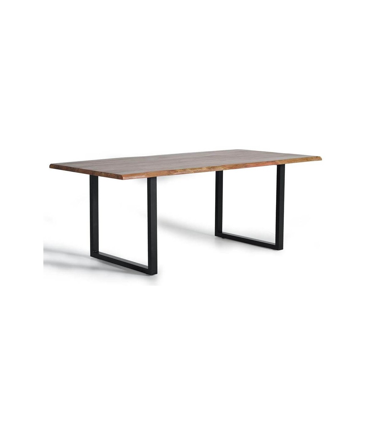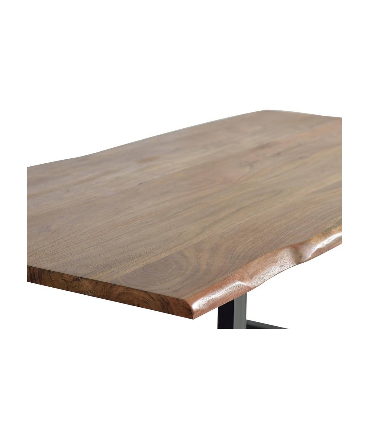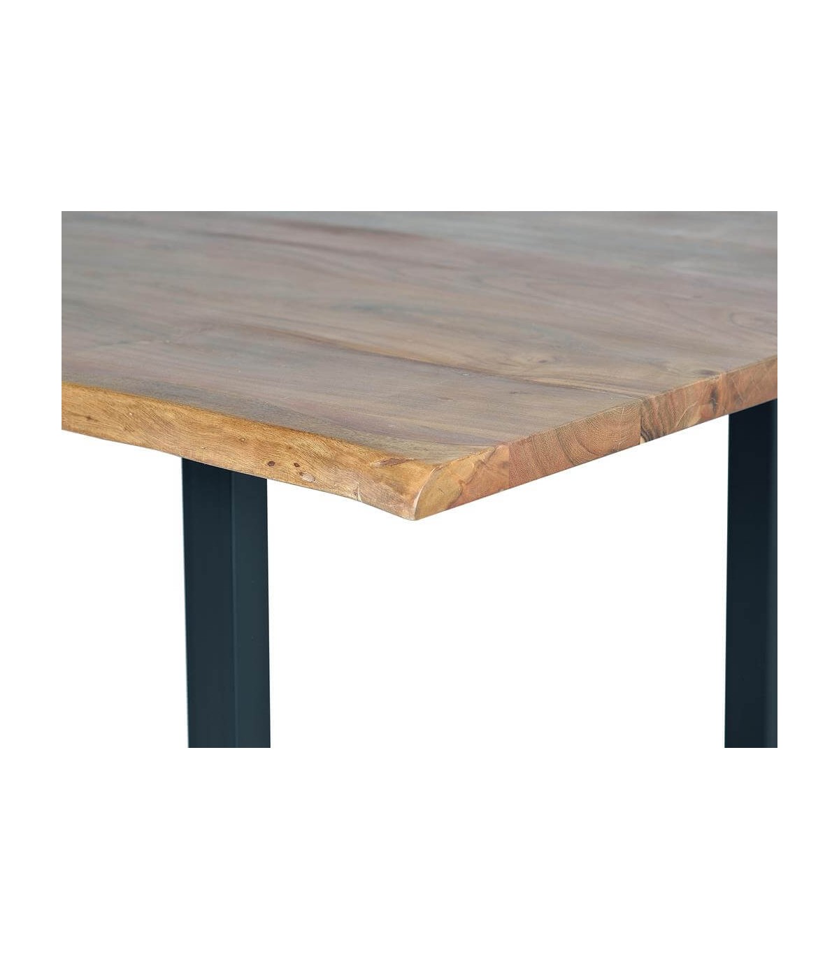 Mesa de comedor rectangular grande con la tapa con bordes irregulares realizada en madera maciza de acacia natural, patas en metal color negro. Perfecta para ambientes de estilo industrial o colonial.
