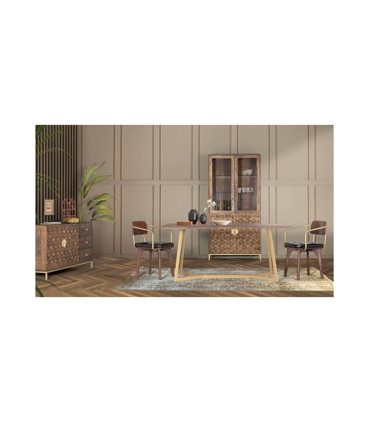 Mesa de comedor de nuestra colección de muebles Zenda, una colección de estilo art decó con un ligero toque colonial, realizada en madera maciza de mango, jugando con los contrastes de la madera en color nogal y oro y el metal en oro a juego, no lleva tiradores las puertas se abren por el método PUSH.