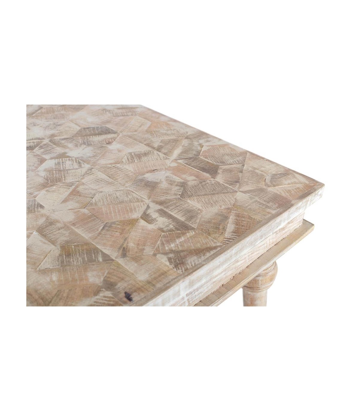 Majestuosa mesa de comedor en formato XXL fabricada en madera maciza de mango, ideal para grandes estancias con alma natural. Su tapa presenta un delicado diseño marqueteado con formas geométricas talladas a mano, que aportan textura y un atractivo visual sofisticado.