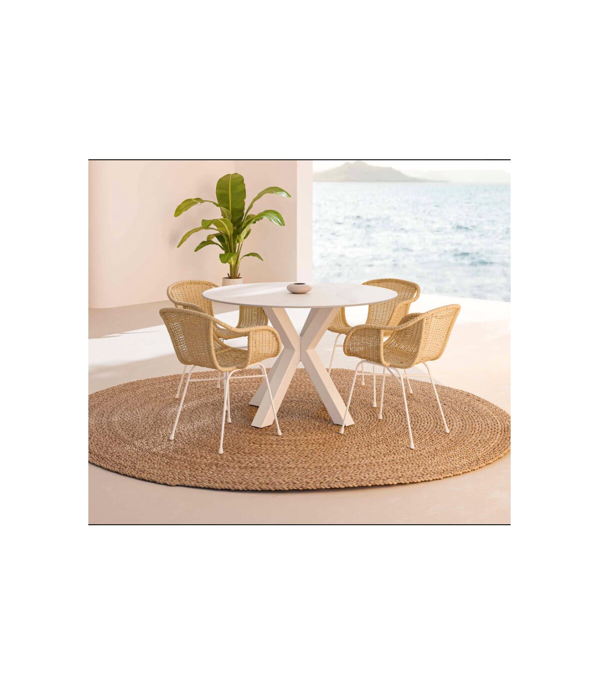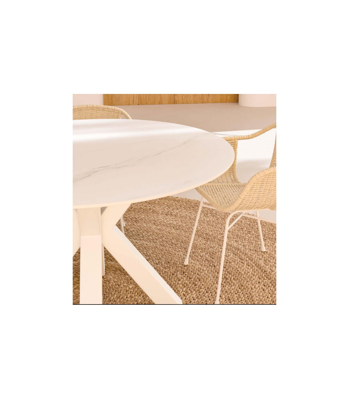 Eleva el estilo de tu comedor o terraza cubierta con esta mesa redonda de diseño contemporáneo. Su estructura metálica blanca de líneas cruzadas aporta solidez visual y estabilidad, mientras que el sobre porcelánico imitación mármol blanco con vetas grises añade sofisticación y resistencia.