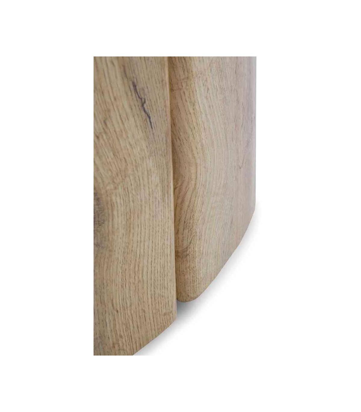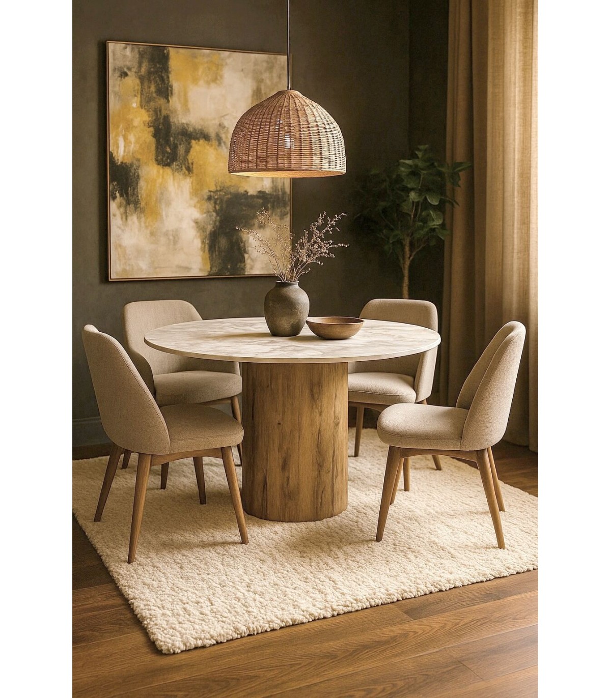 La base cilíndrica en MDF chapada en roble natural introduce calidez y textura, equilibrando lo orgánico con lo moderno. El diseño circular favorece la conversación y crea una atmósfera inclusiva y dinámica en el comedor. Sus proporciones contenidas la hacen versátil para hogares que buscan funcionalidad sin renunciar al estilo.
