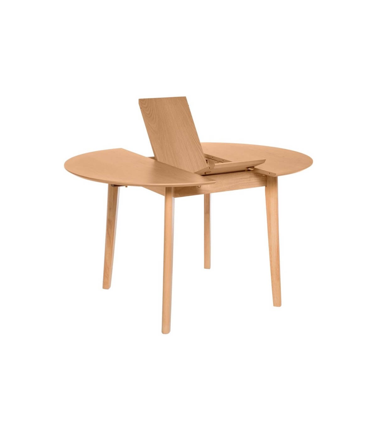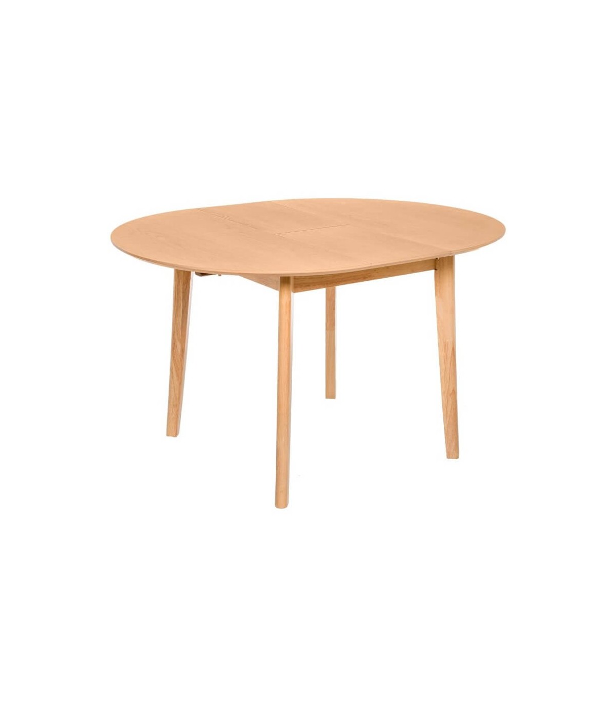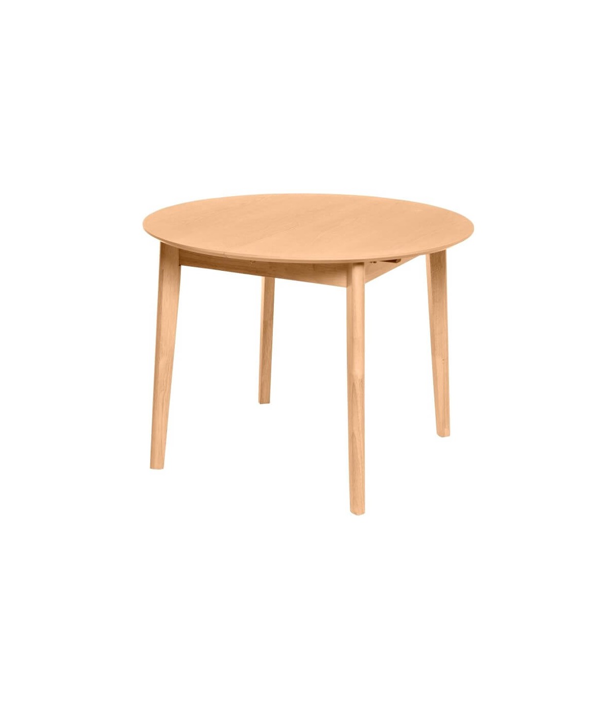 Mesa de comedor redonda extensible, realizada en madera de roble acabado natural, una mesa cómoda y sencilla.