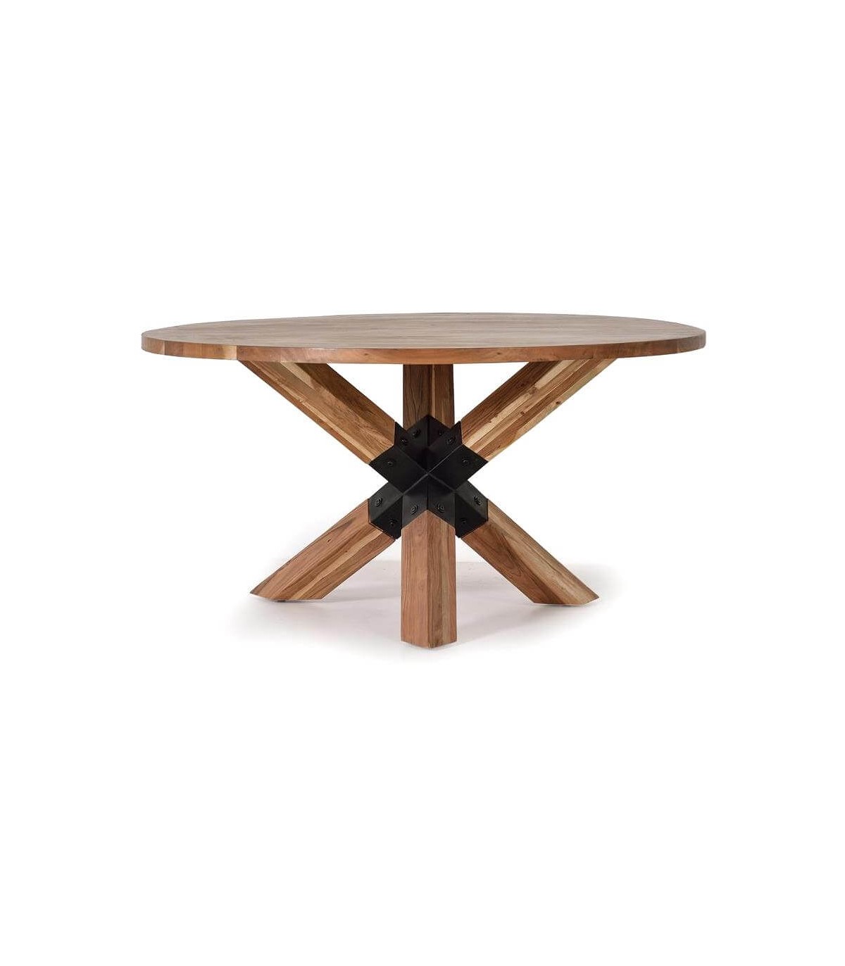 Mesa de comedor redonda de estilo colonial realizada en madera de acacia natural con el herraje en metal negro, adaptable a cualquier tipo de decoración como pieza singular.