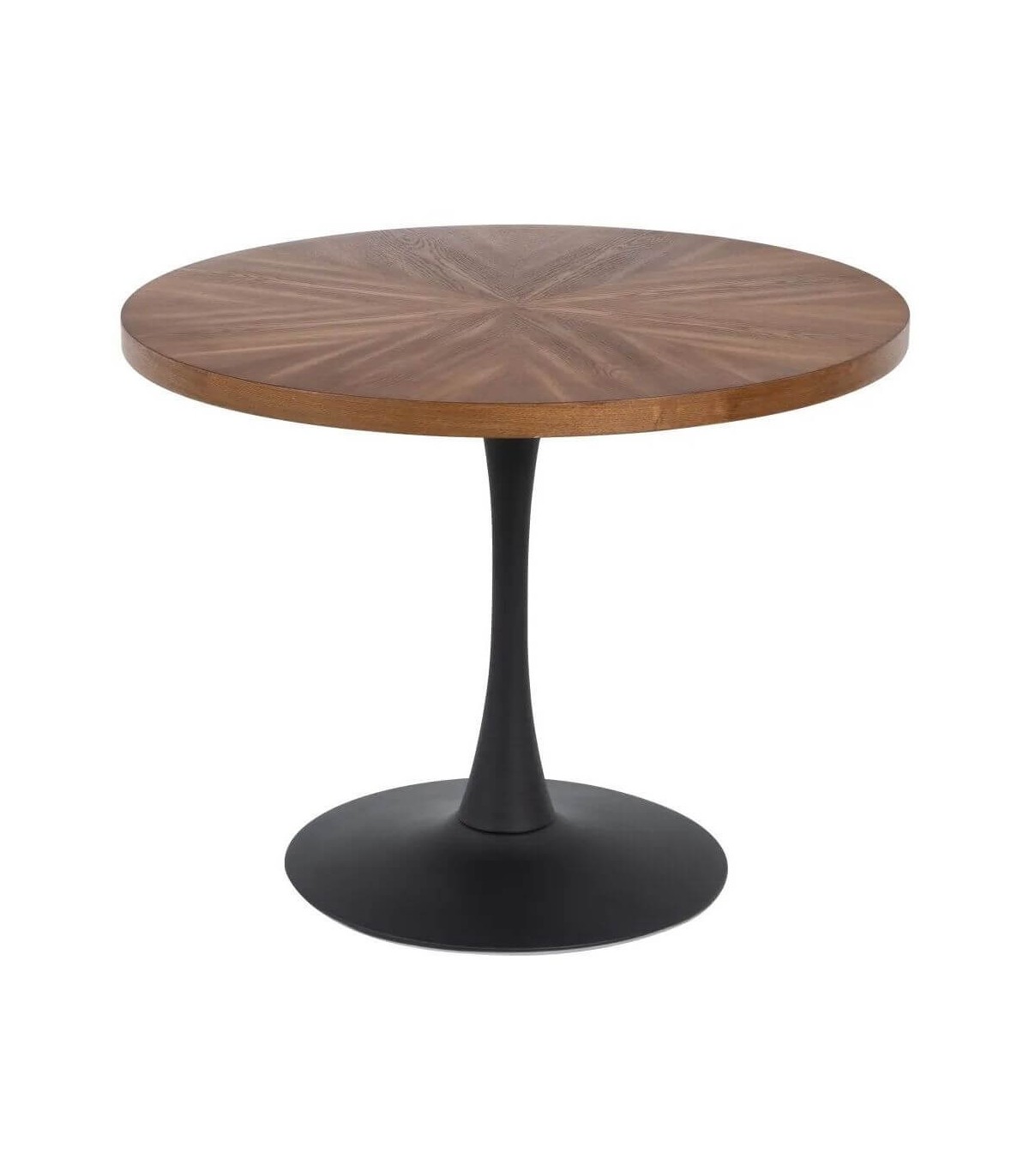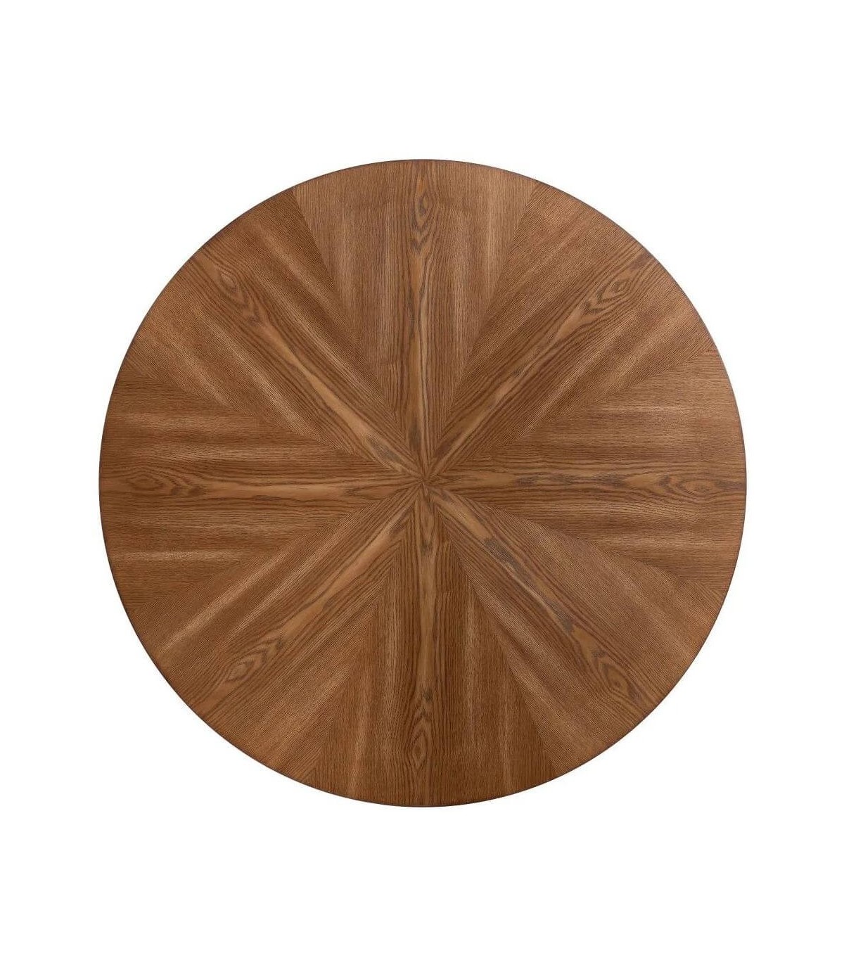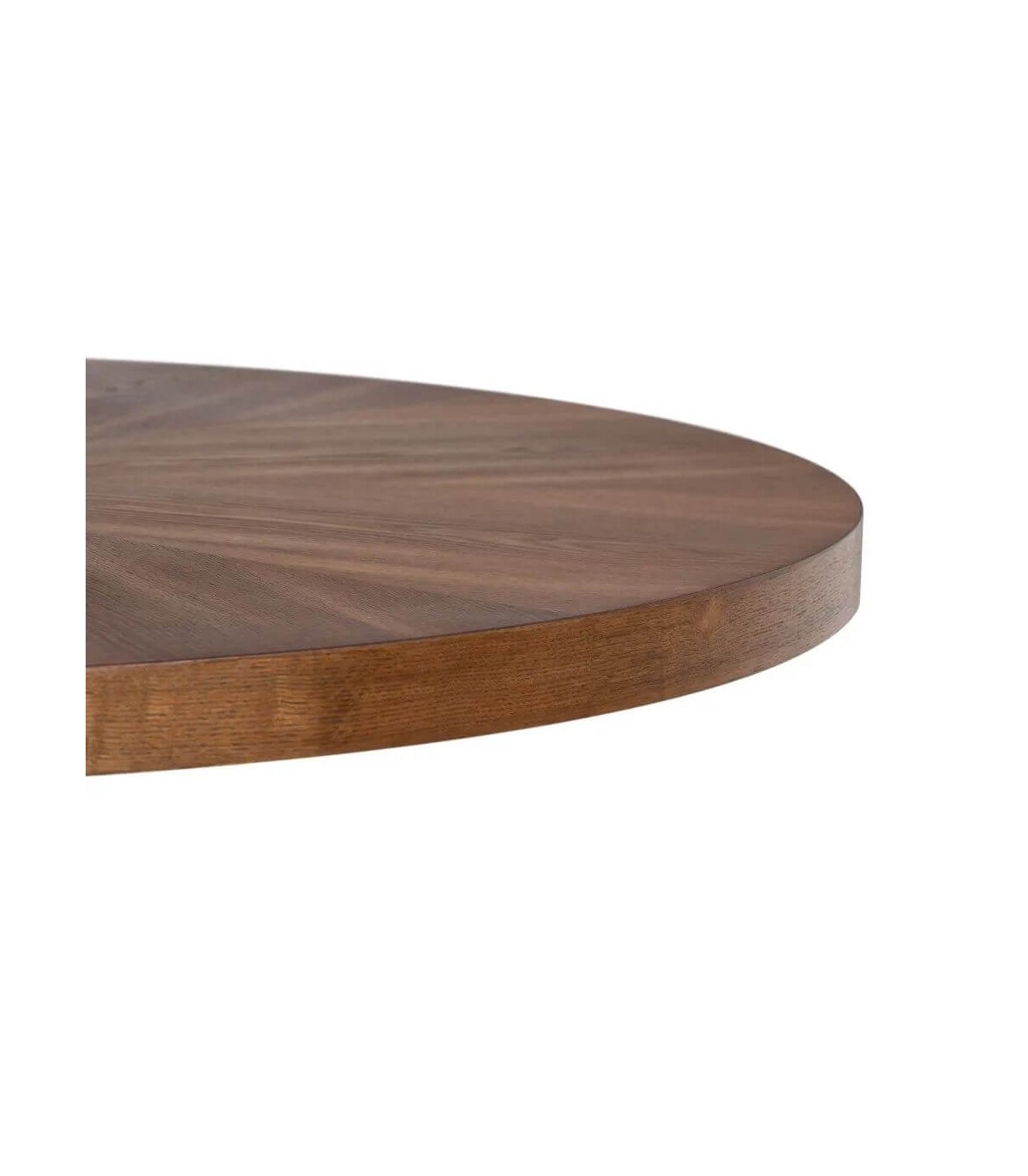 Mesa de comedor redonda pequeña estilo contemporáneo, con un pie central importante que le da mucha estabilidad y la belleza del acabado nogal plumeado, perfecta para salones de tamaño medio o cocinas.
