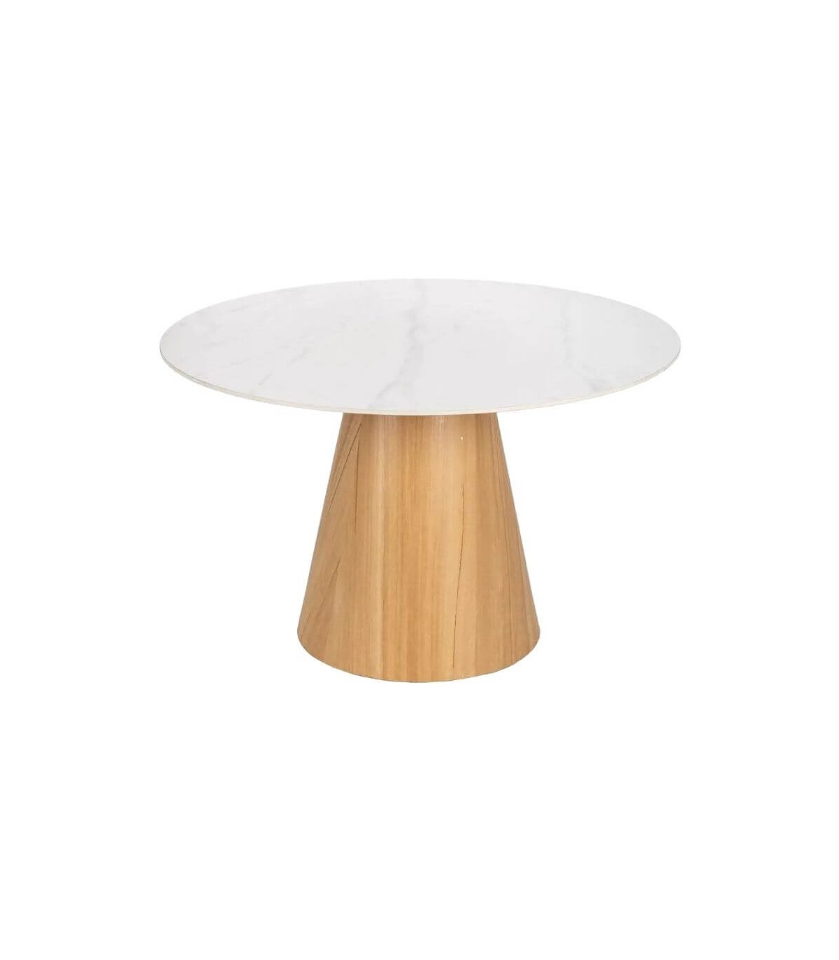 MESA DE COMEDOR 120 Ø X 75 MERIO CERAMICA BLANCA METAL IMITACION ROBLE
